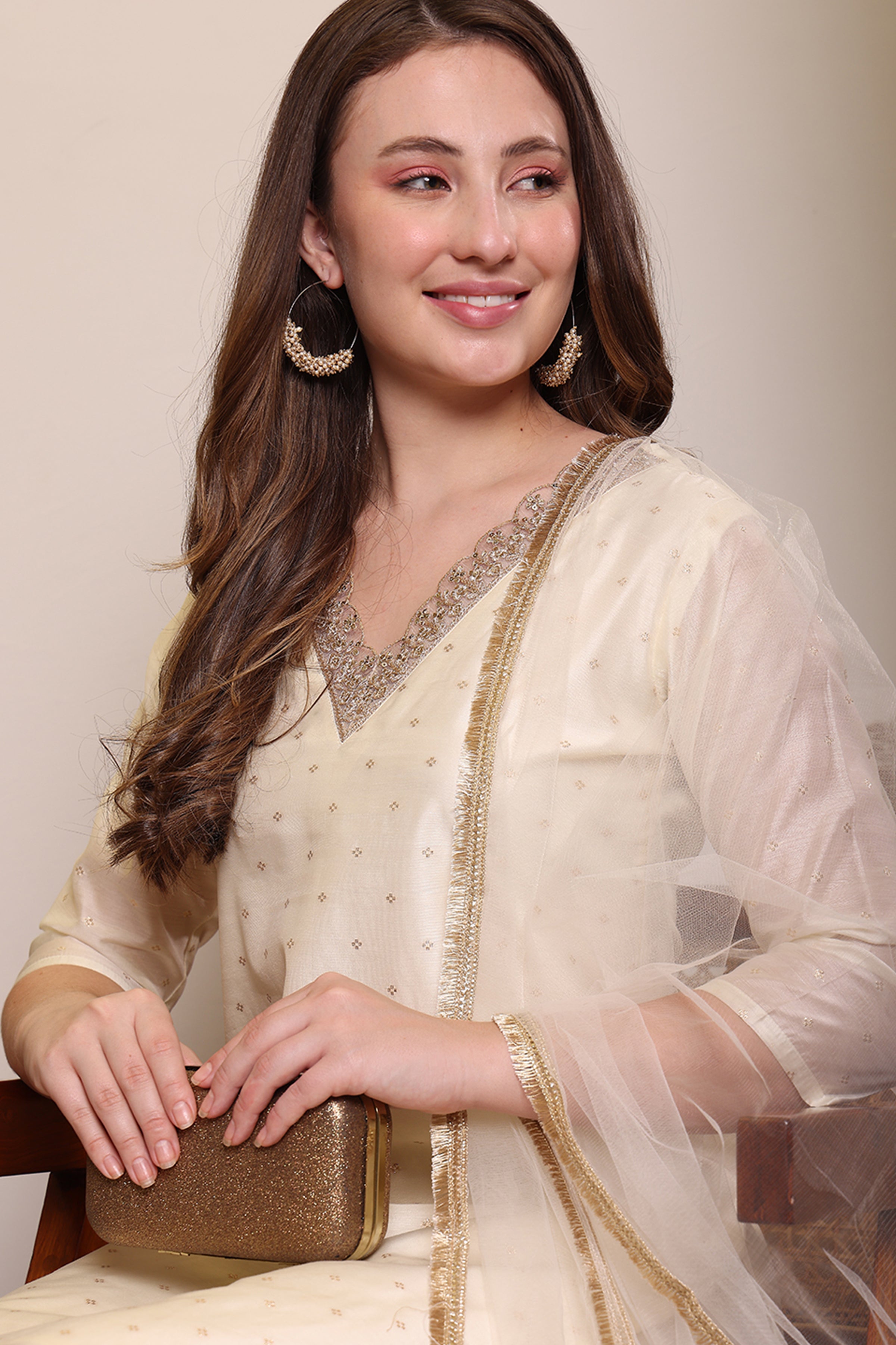 Avanshee's Chanderi Cotton Silk Kurta, Pant, & Net Dupatta with Lining.