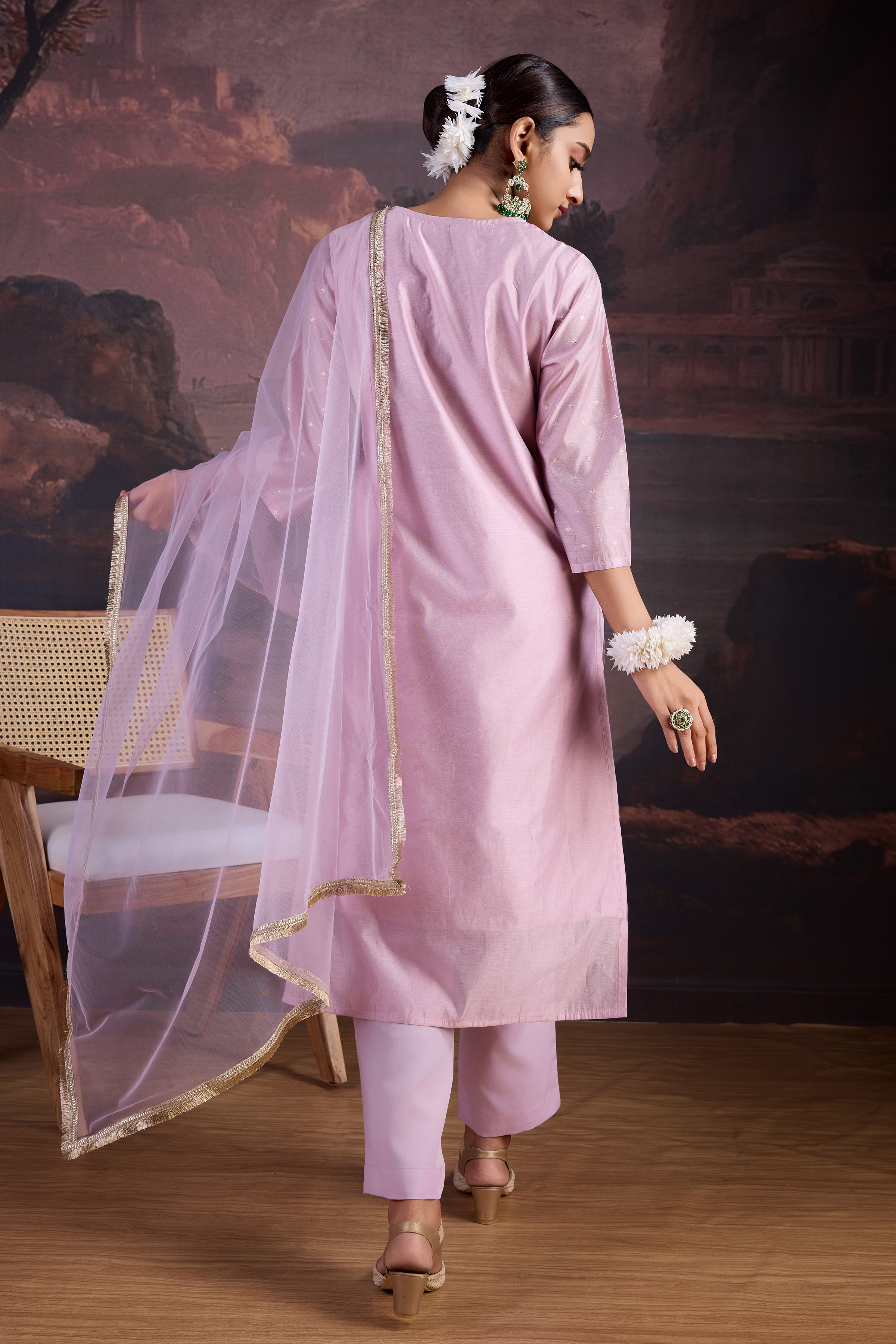 Pink Chanderi Cotton Silk Kurta, Pant & Net Dupatta with Lining