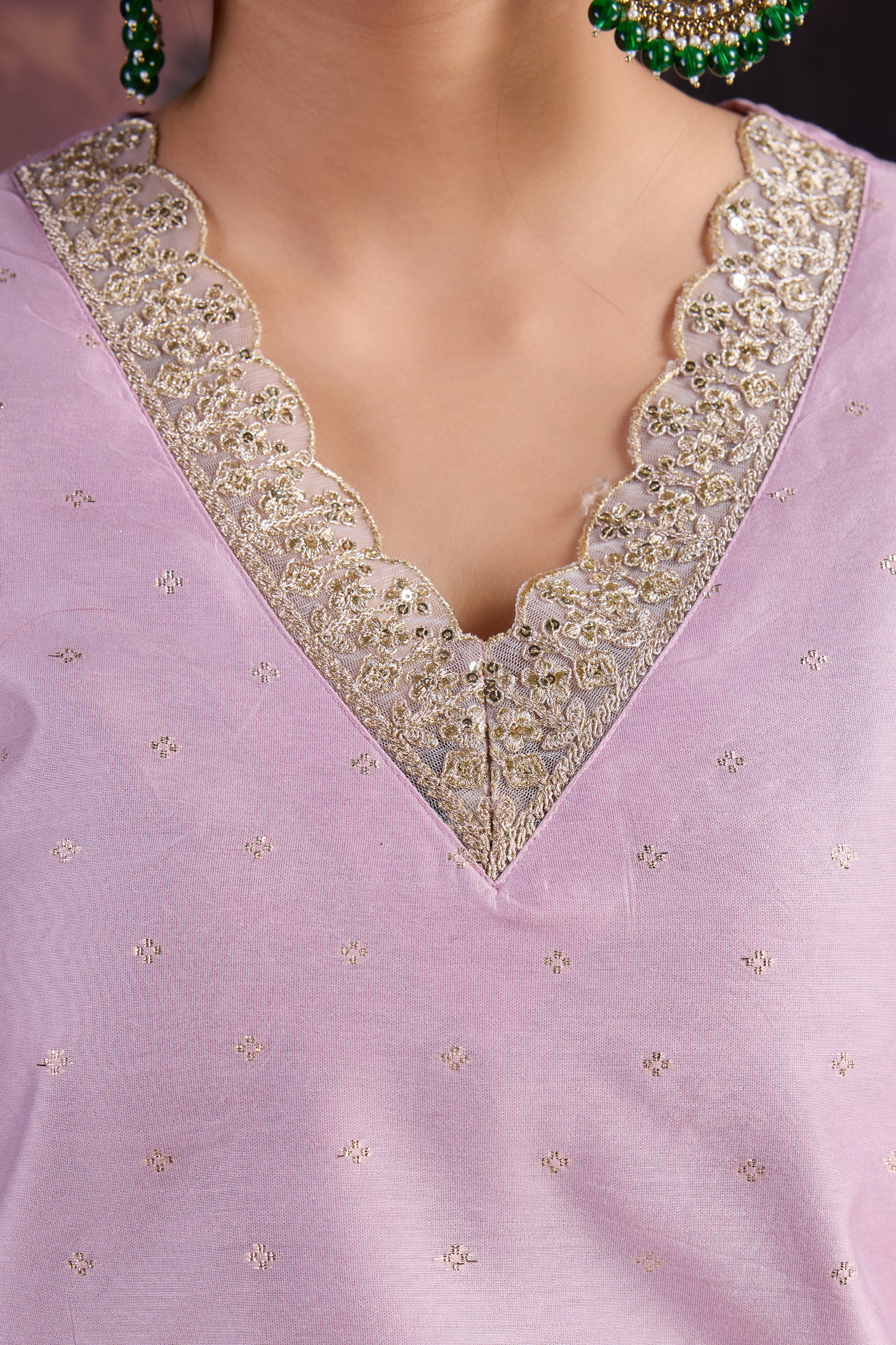 V-neck, accentuated with subtle embellishments. Sleeves 3/4th length, styled with minimal or intricate detailing to match the overall design.