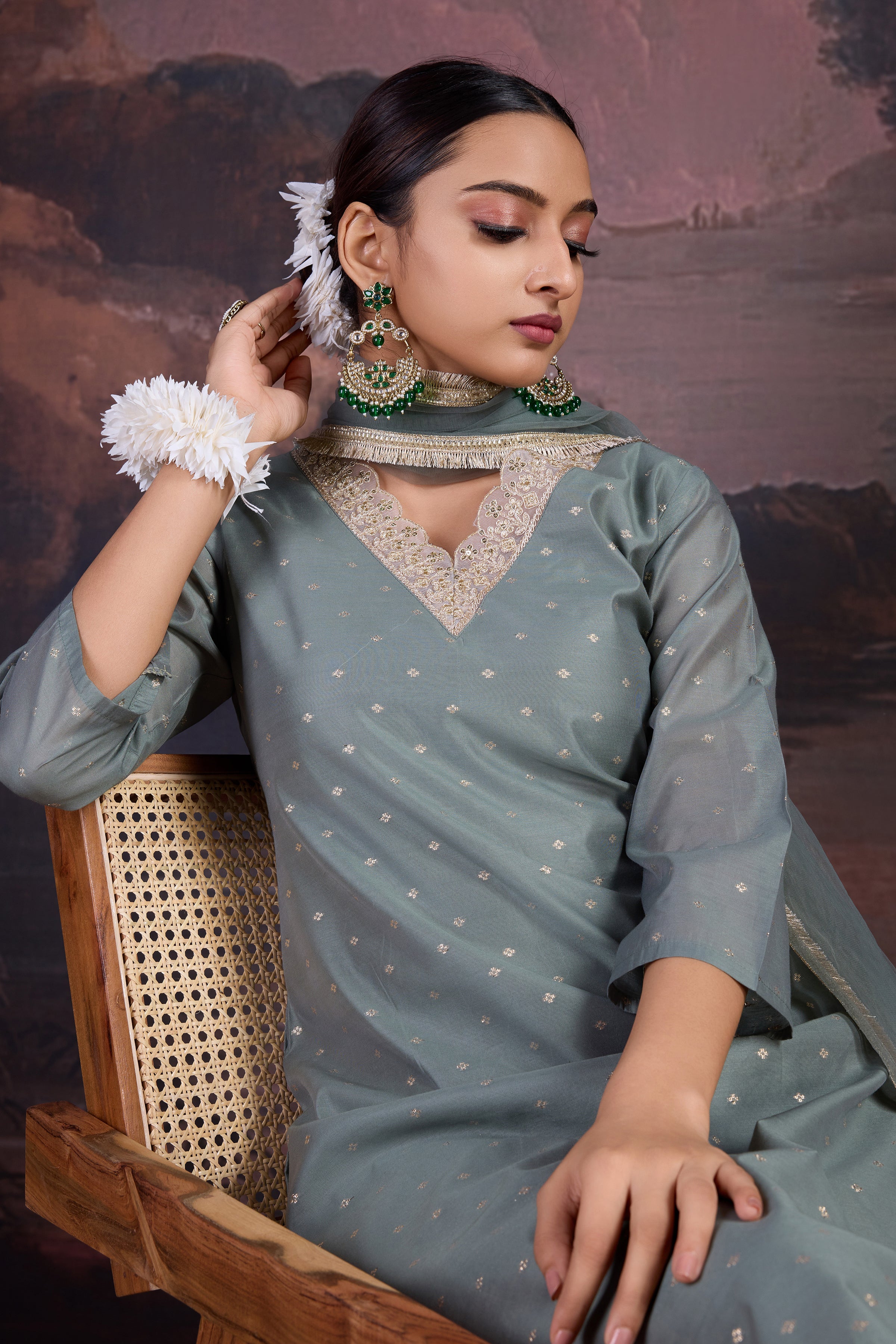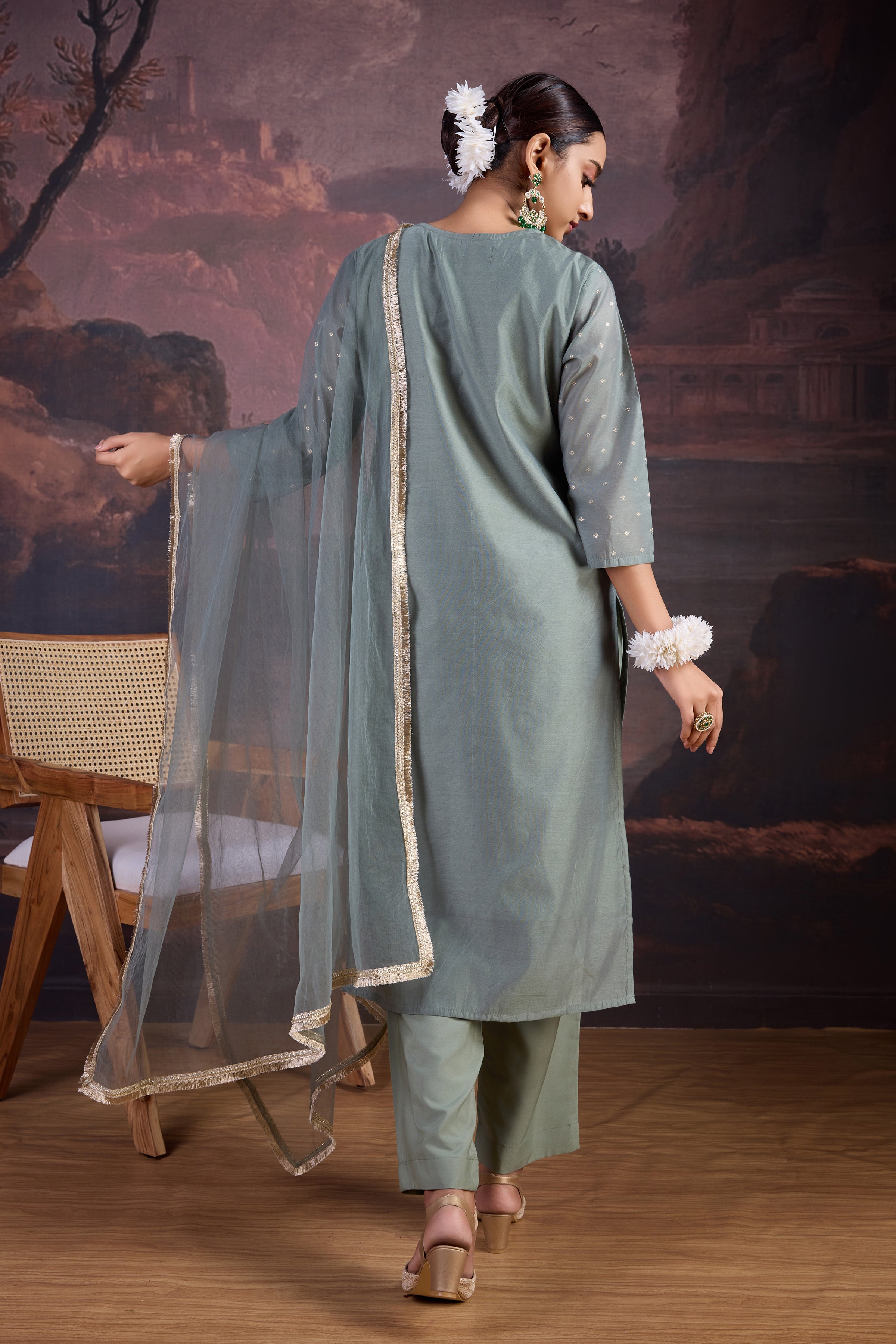 Avanshee's Chanderi Cotton Silk Kurta, Pant and Net Dupatta set with Lining.