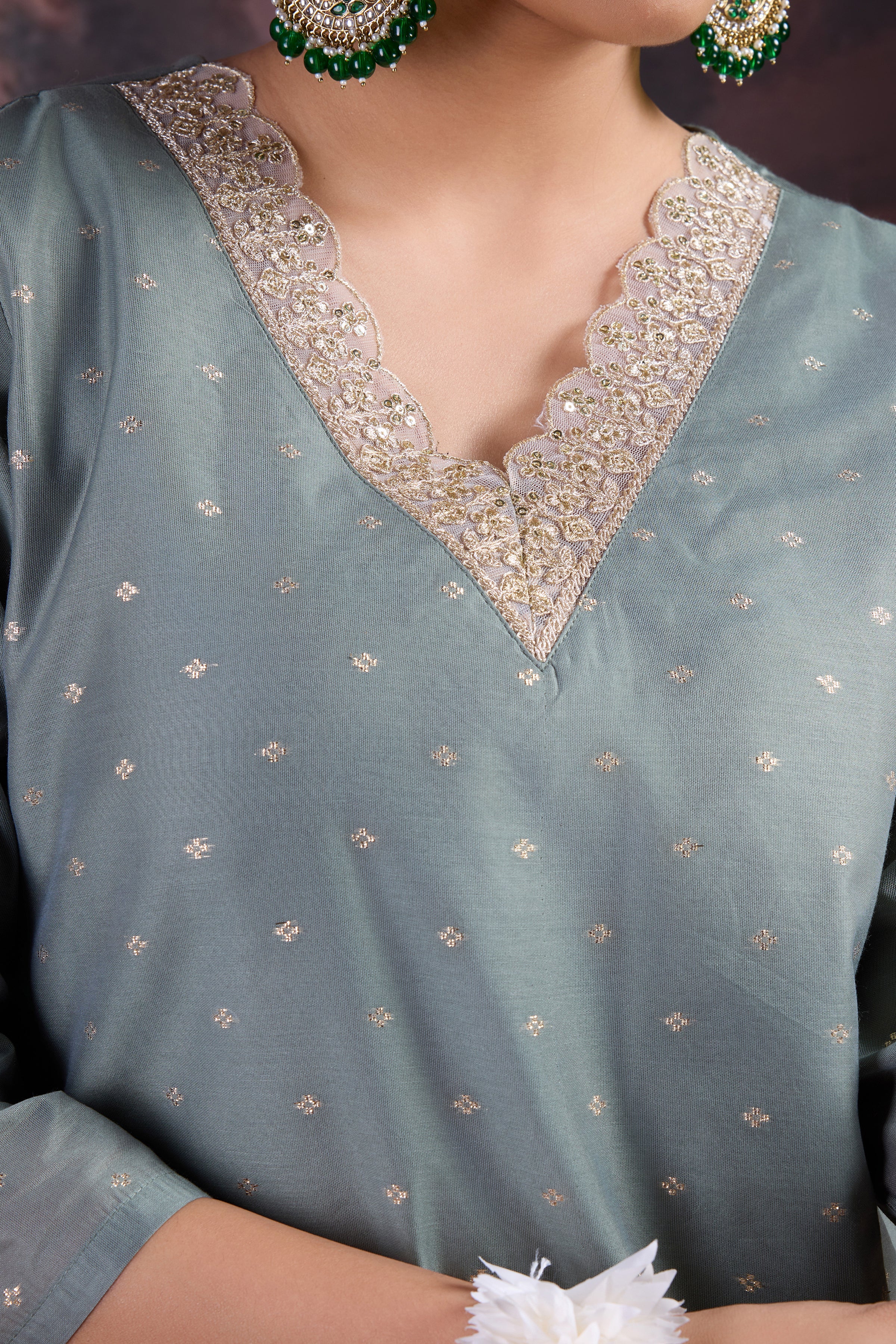 V-neck, accentuated with subtle embellishments. Sleeves 3/4th length, styled with minimal or intricate detailing to match the overall design.