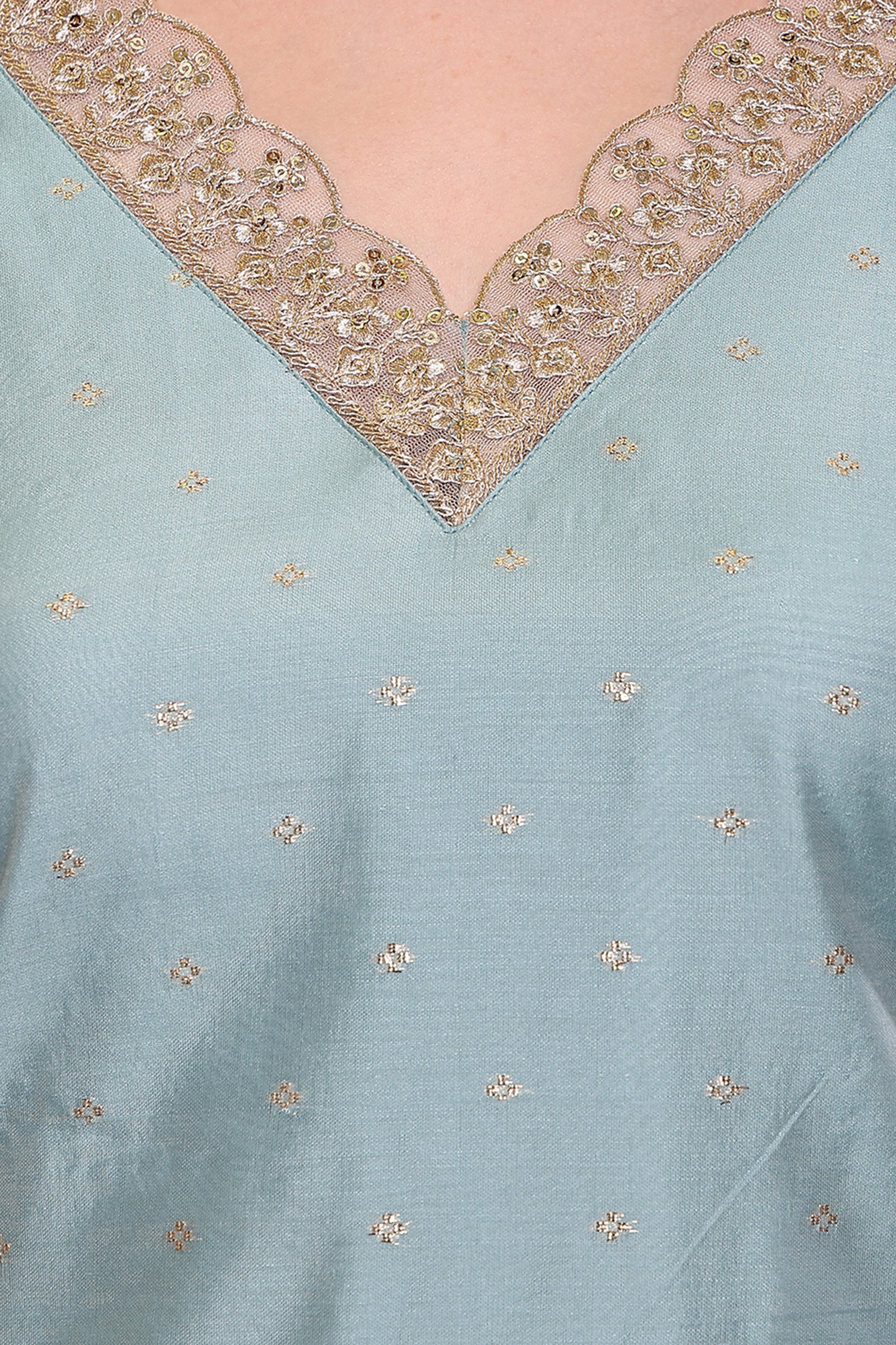 V-neck, accentuated with subtle embellishments. Sleeves 3/4th length, styled with minimal or intricate detailing to match the overall design.