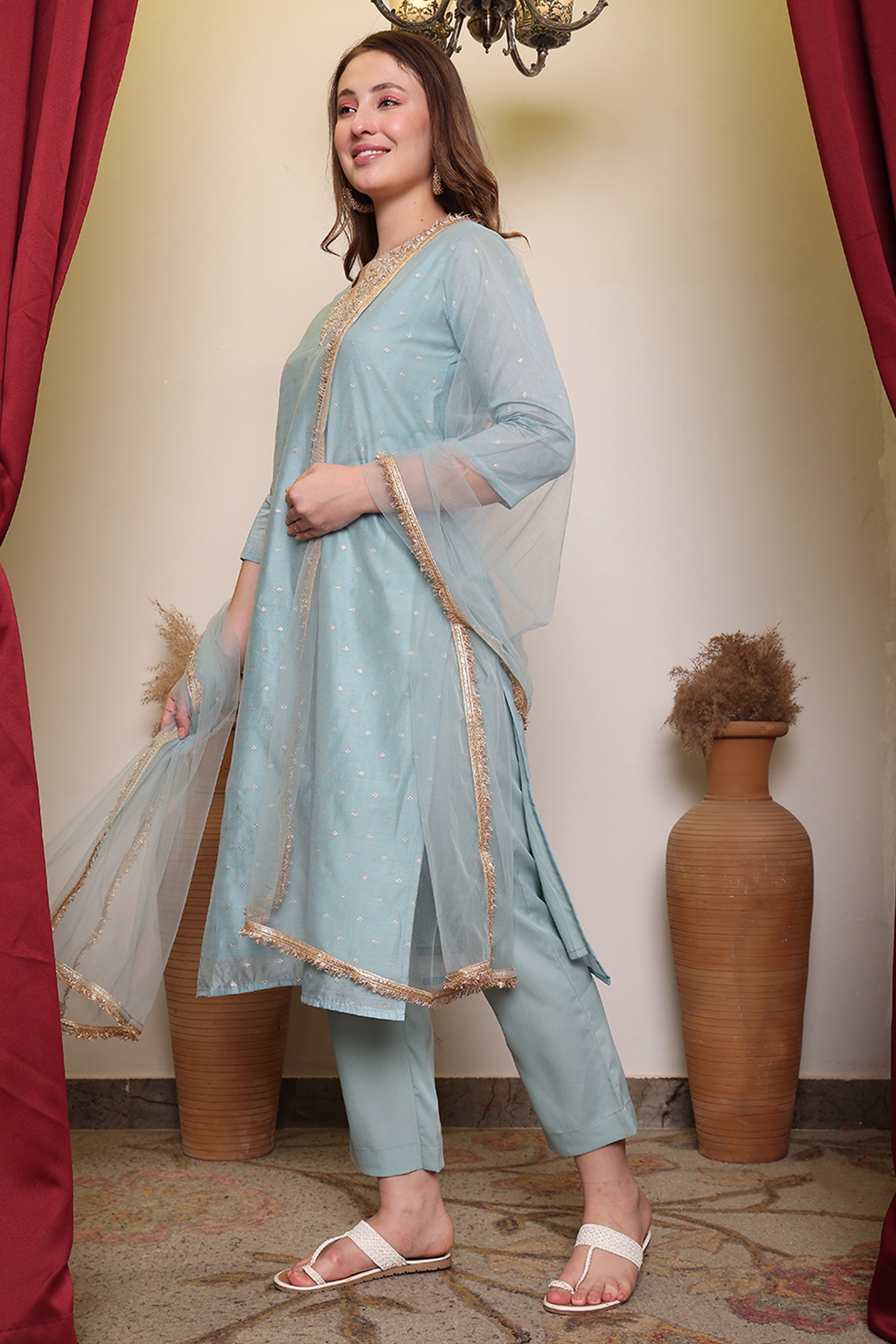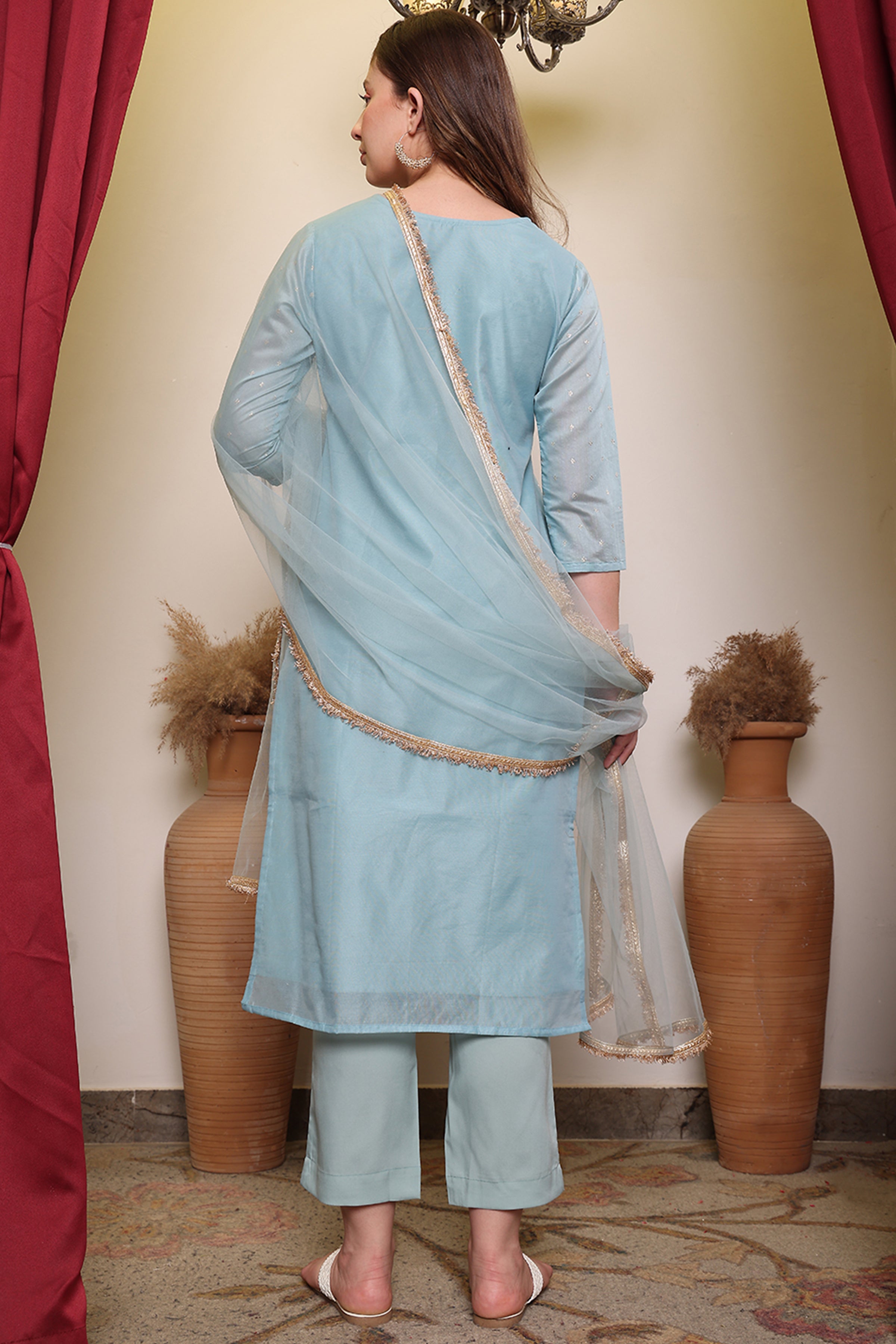 Avanshee's Chanderi Cotton Silk Kurta, Pant, & Net Dupatta set with Lining.