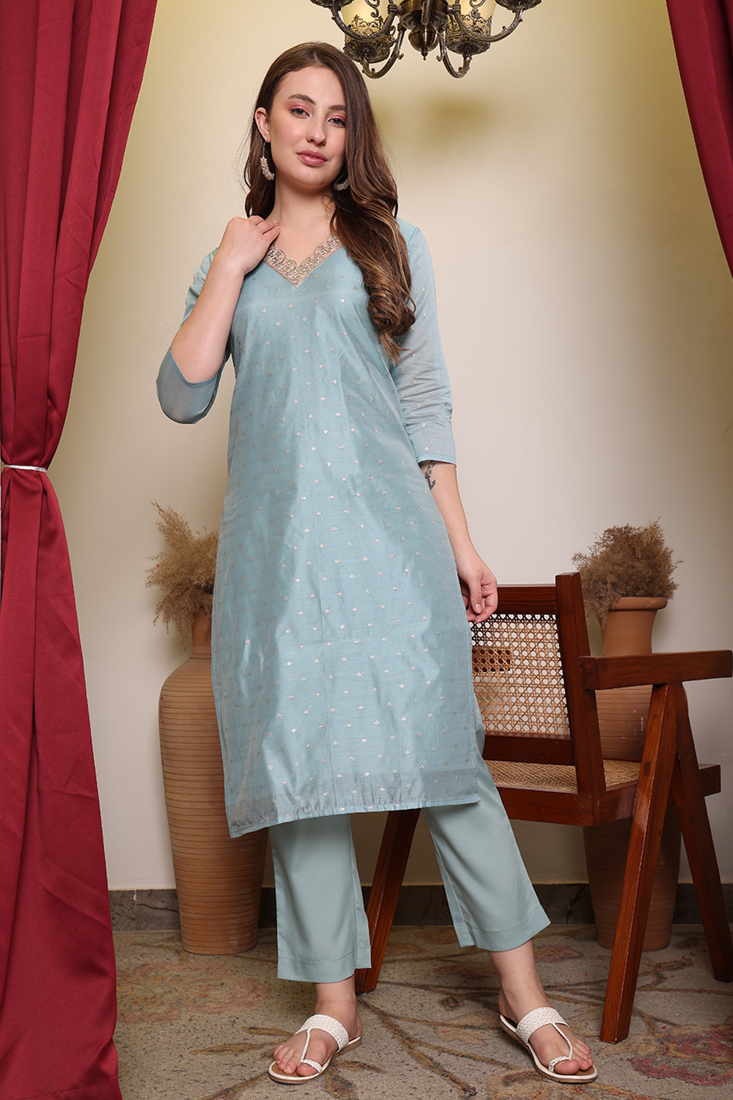 Kurta : Crafted from luxurious Chanderi Cotton Silk, the kurta features delicate embroidery or zari work, giving it an elegant and festive appearance. The kurta's straight cut offers a contemporary silhouette, making it ideal for both casual and festive occasions.