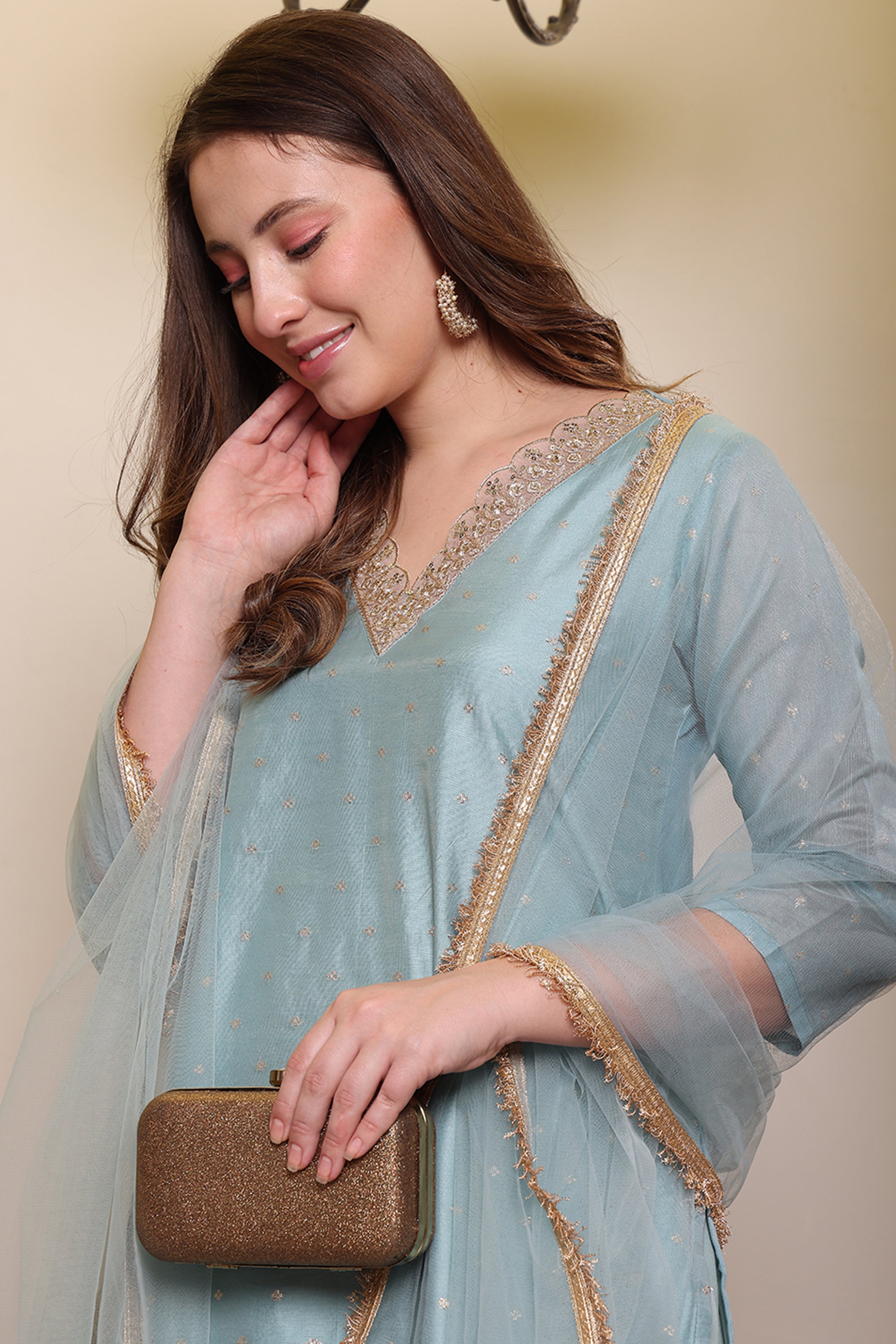 The lightweight net dupatta adds a graceful touch, designed with fine borders or delicate embroidery that complements the kurta.