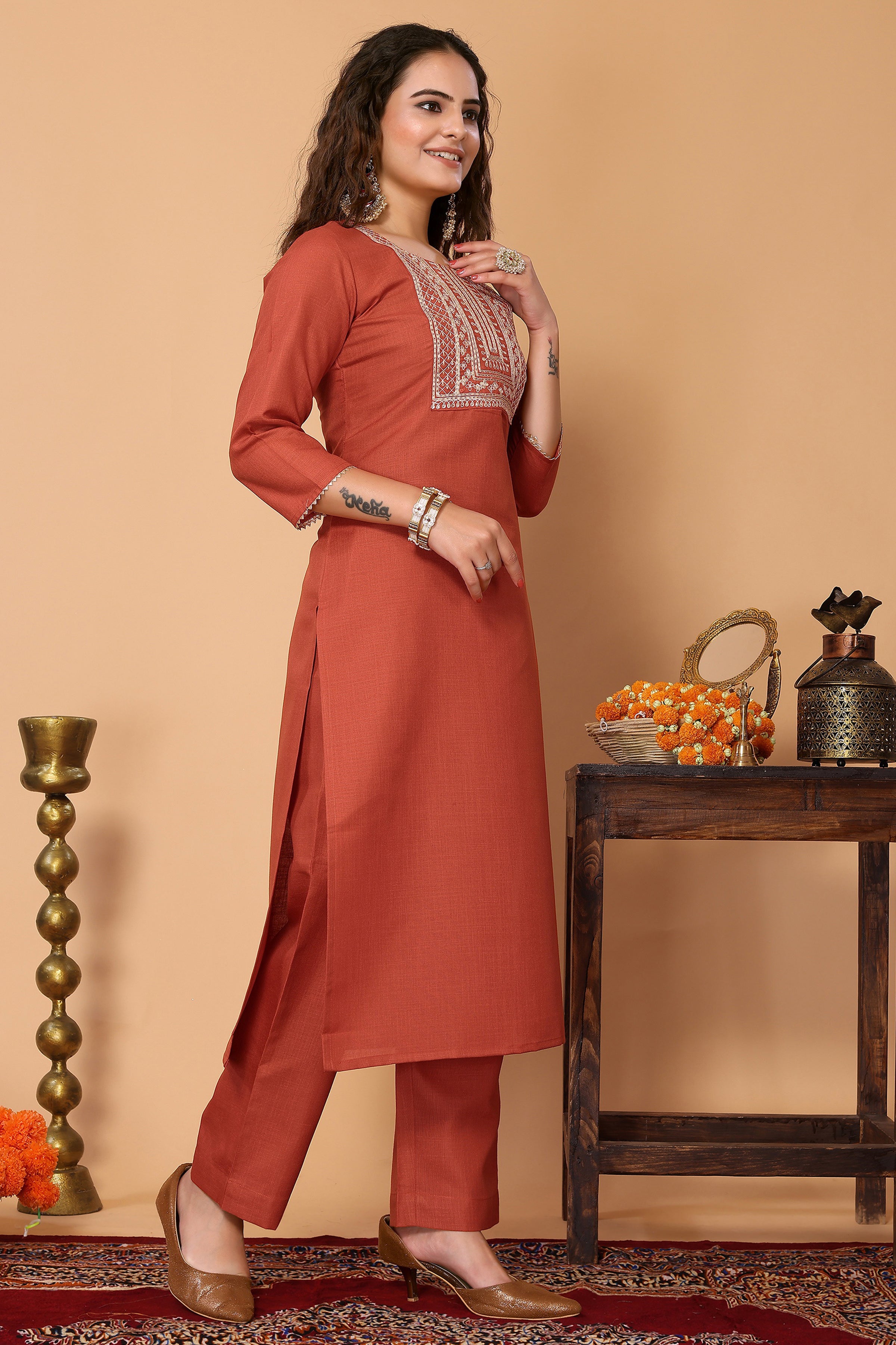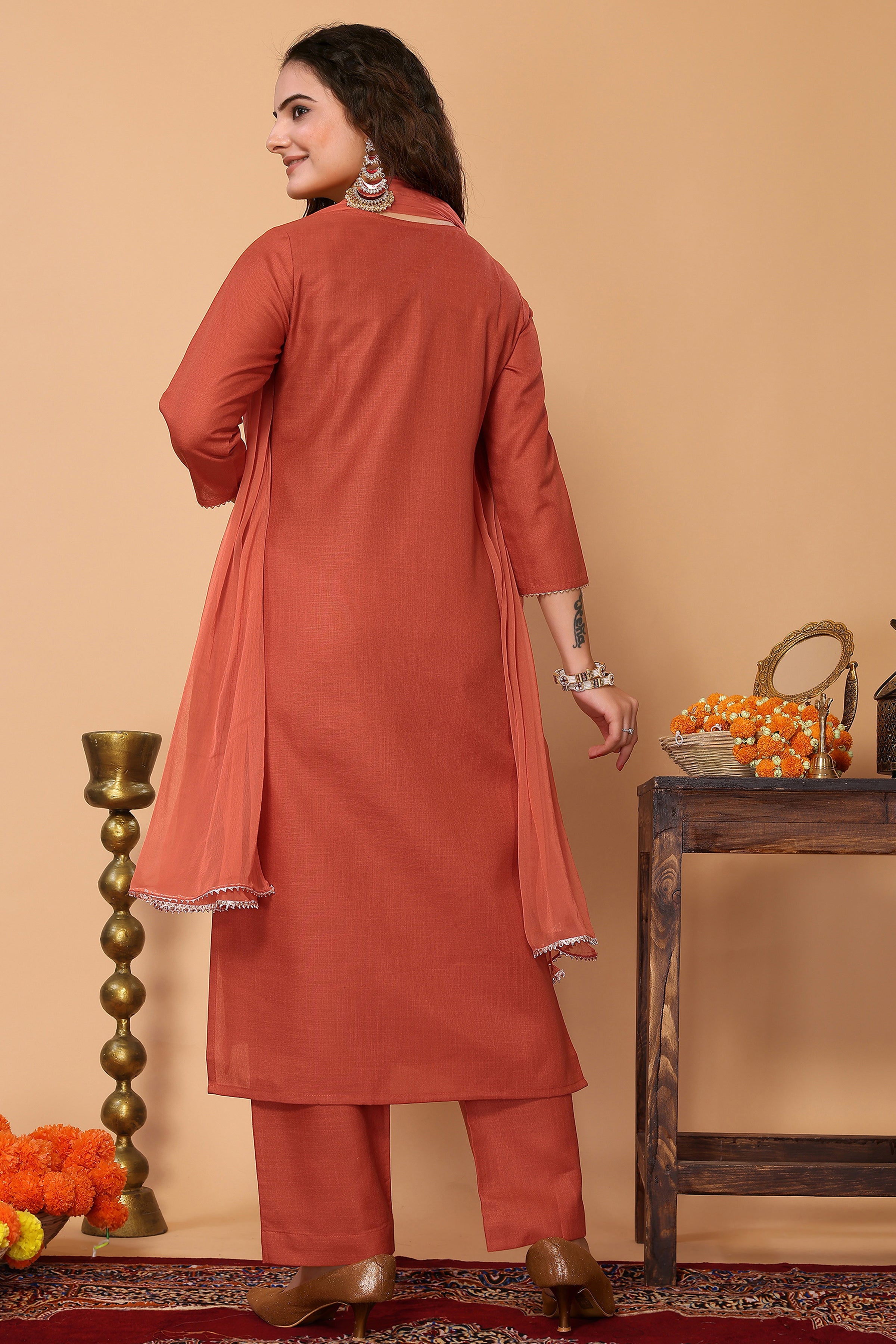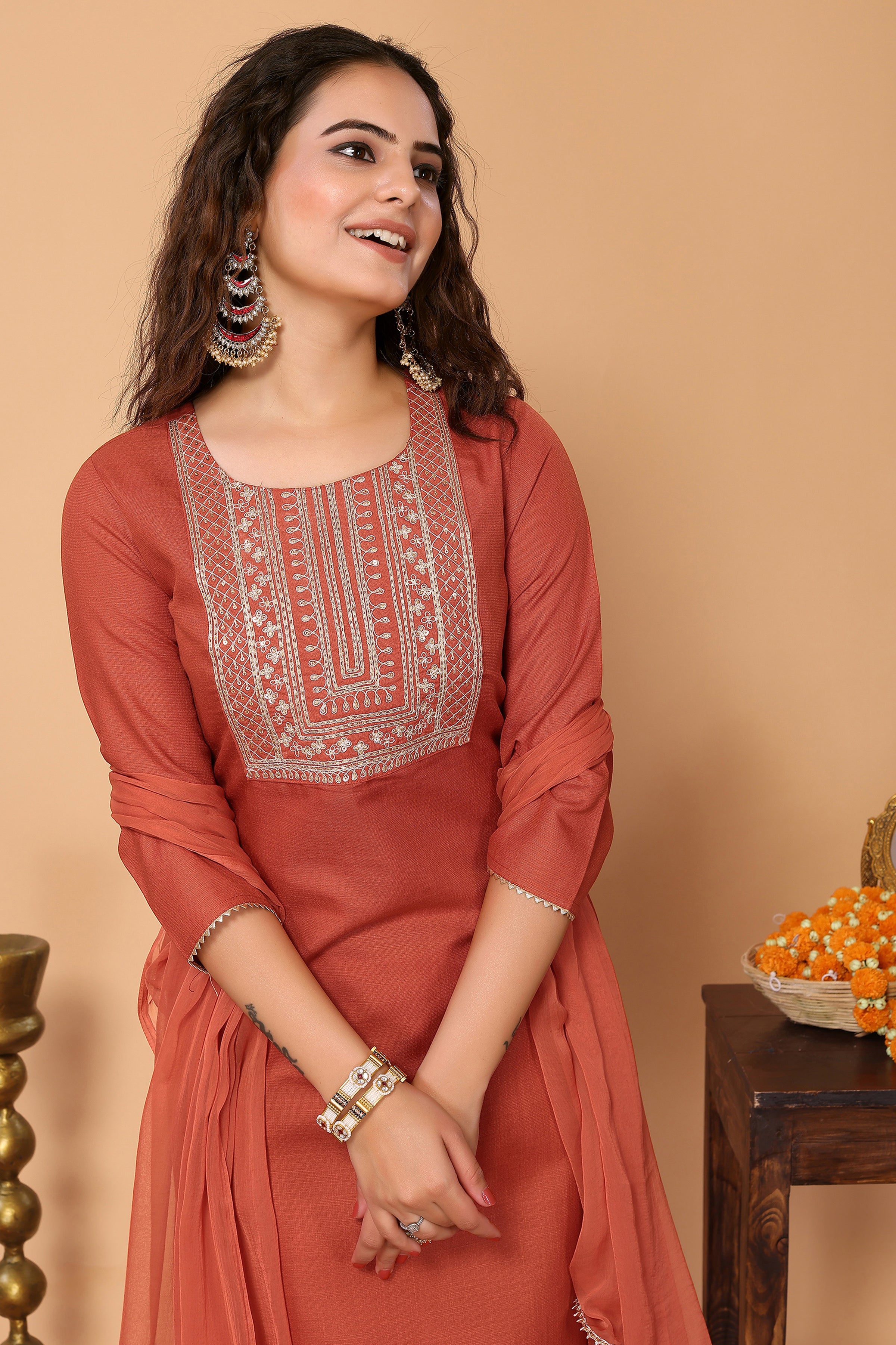 Elevate your ethnic wardrobe with this beautifully crafted Cotton Blend Embroidered Neck Kurta, Pant, and Dupatta Set. The kurta features intricate embroidery along the neckline, adding a touch of elegance to the overall look. Made from a soft and breathable cotton blend fabric, this set ensures all-day comfort and style. The straight-cut kurta is paired with matching pants, designed for a comfortable yet flattering fit, while the lightweight dupatta complements the outfit with subtle grace.