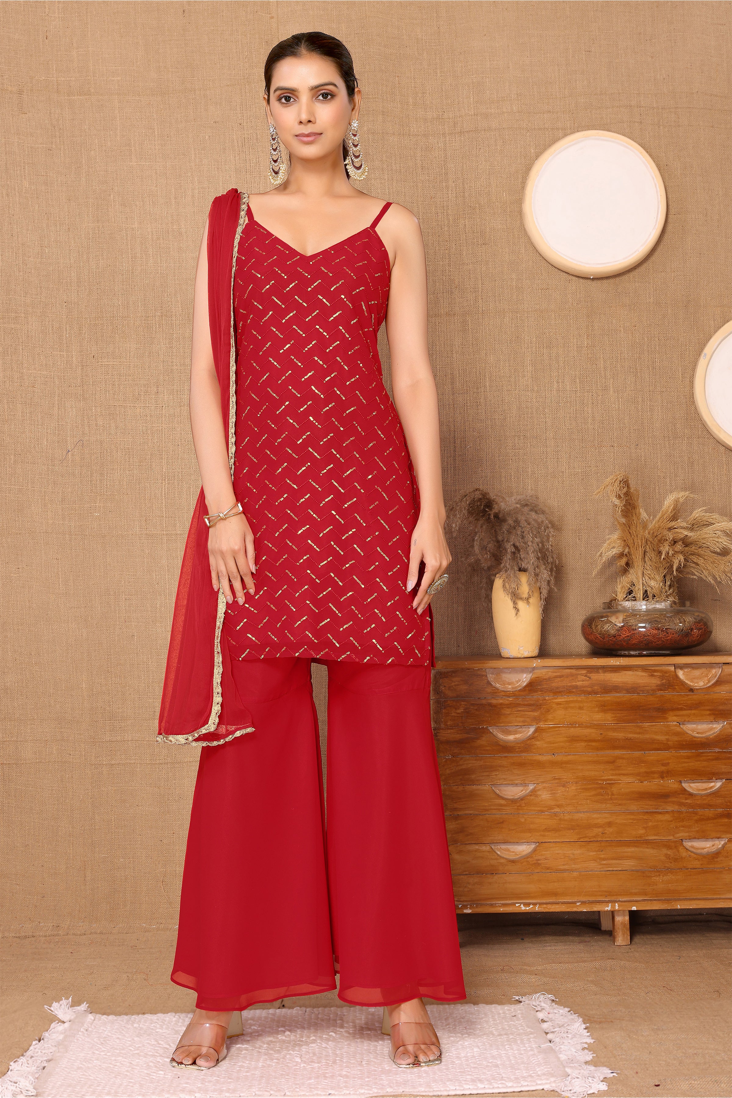 Avanshee's stunning Red Georgette Embroidered Kurta, Garara, and Dupatta Set. Crafted from lightweight and flowy georgette fabric, this ensemble is designed to make you stand out. The kurta features intricate embroidery detailing, adding a luxurious touch to your ethnic wear collection. Paired with matching pants and a soft dupatta, this set strikes the perfect balance between traditional charm and contemporary style.