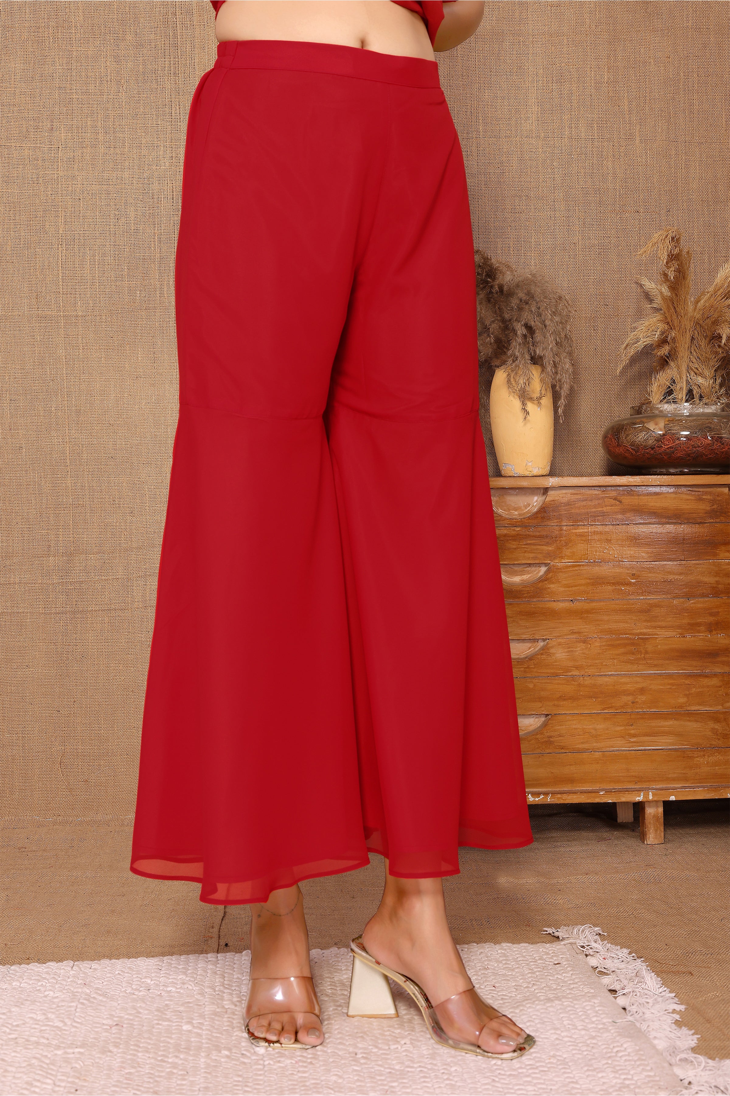 • Pant : Coordinated solid georgette pants with a comfortable elastic waistband.