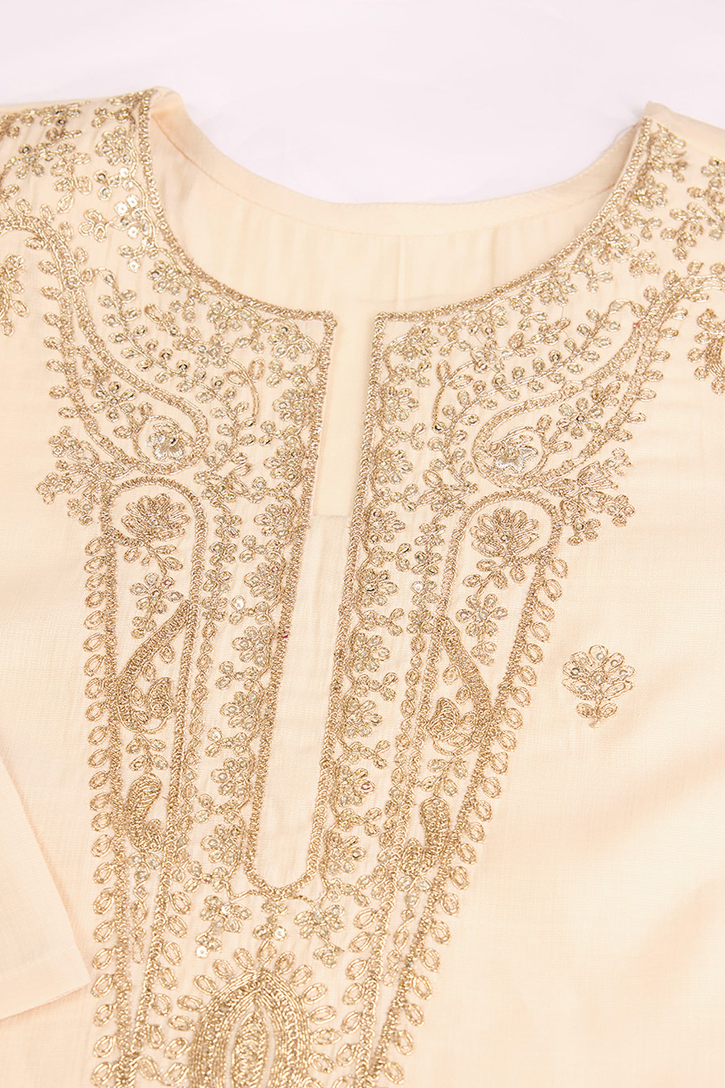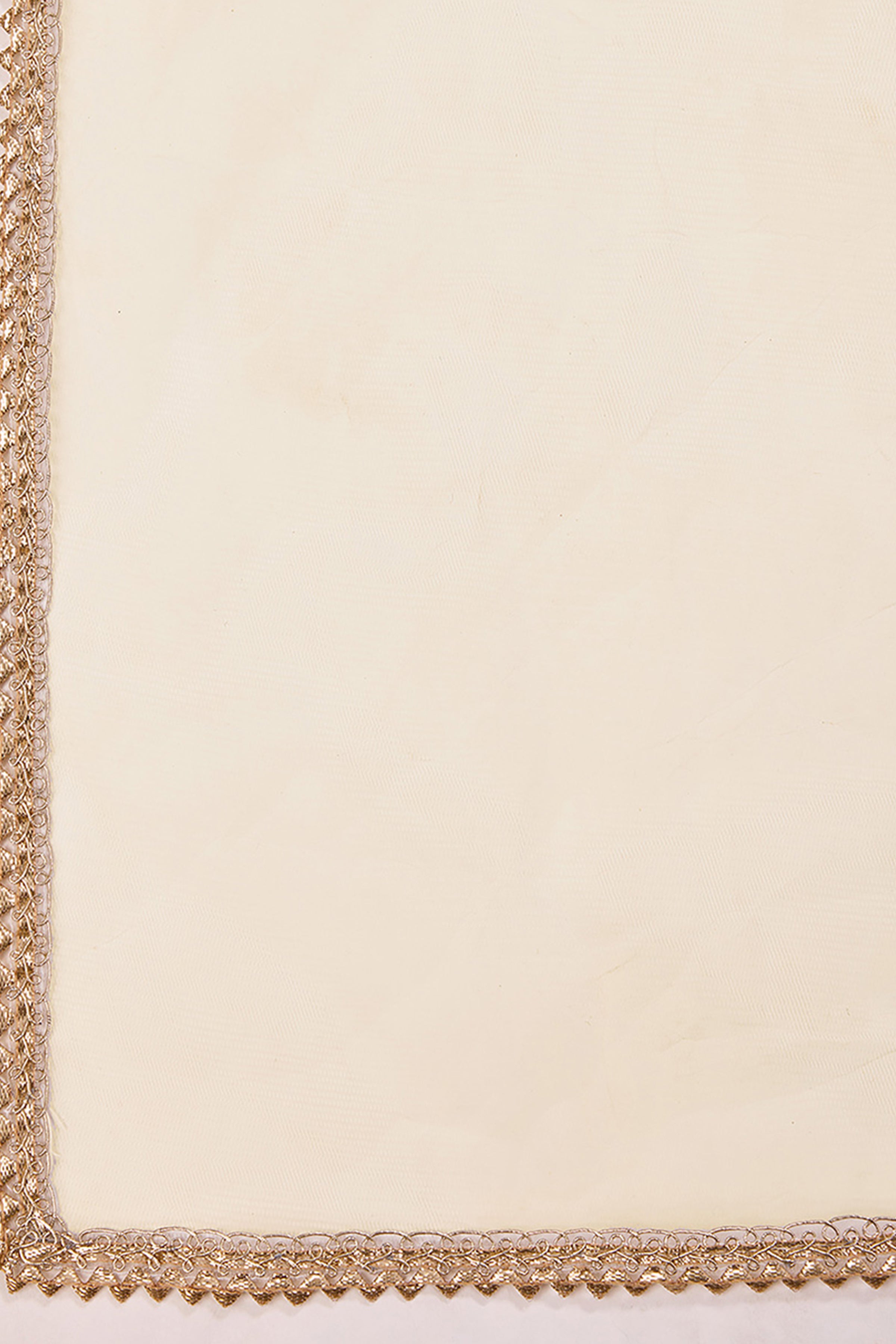 Off-white and gold Silk Blend Embroidered neck Kurta with Pant & Net Dupatta