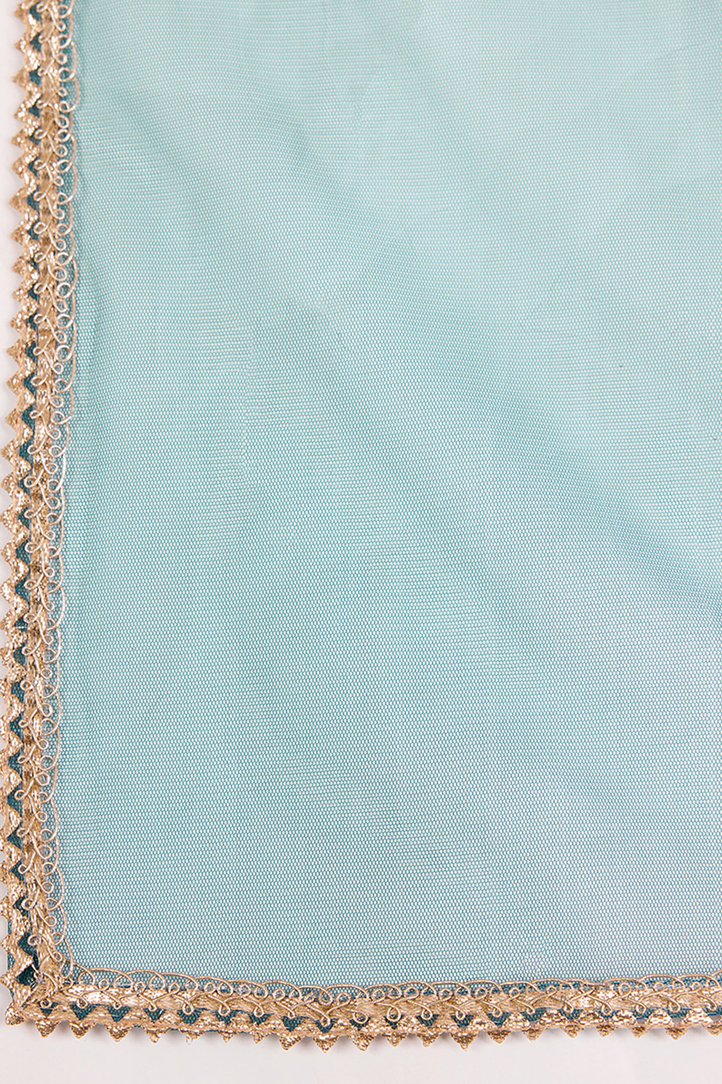 Teal Silk Blend Embroidered Neck Kurta, Pant and Net Dupatta Set.