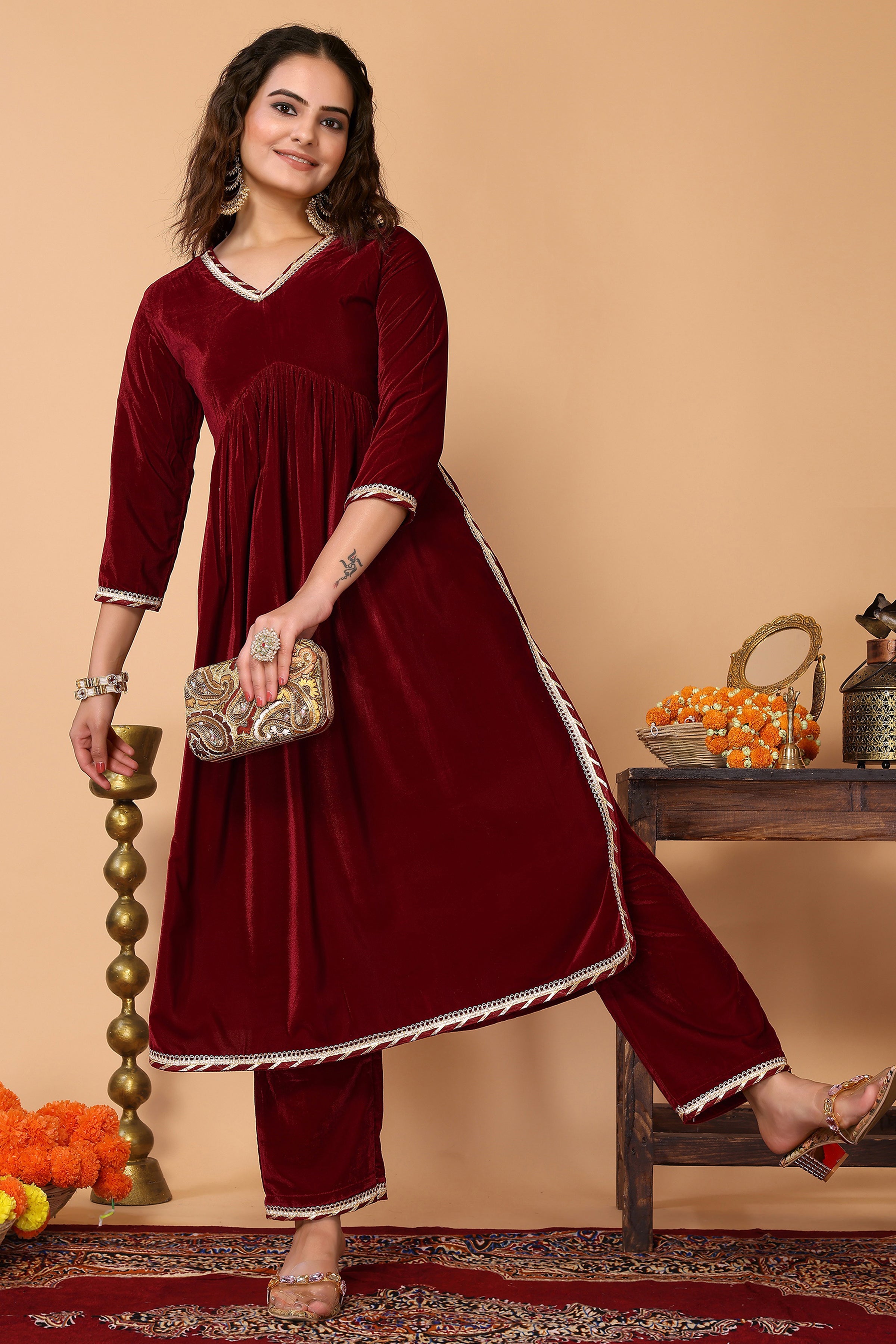 Avanshee's three-piece alia-cut velvet kurta set in Red Colour, designed to make a lasting impression. The V-neck Velvet Kurta, crafted from plush velvet, exudes a royal charm with its rich texture and deep, opulent colour. The flattering V-neckline adds a modern touch to the traditional kurta, making it a versatile choice for festive and formal occasions.