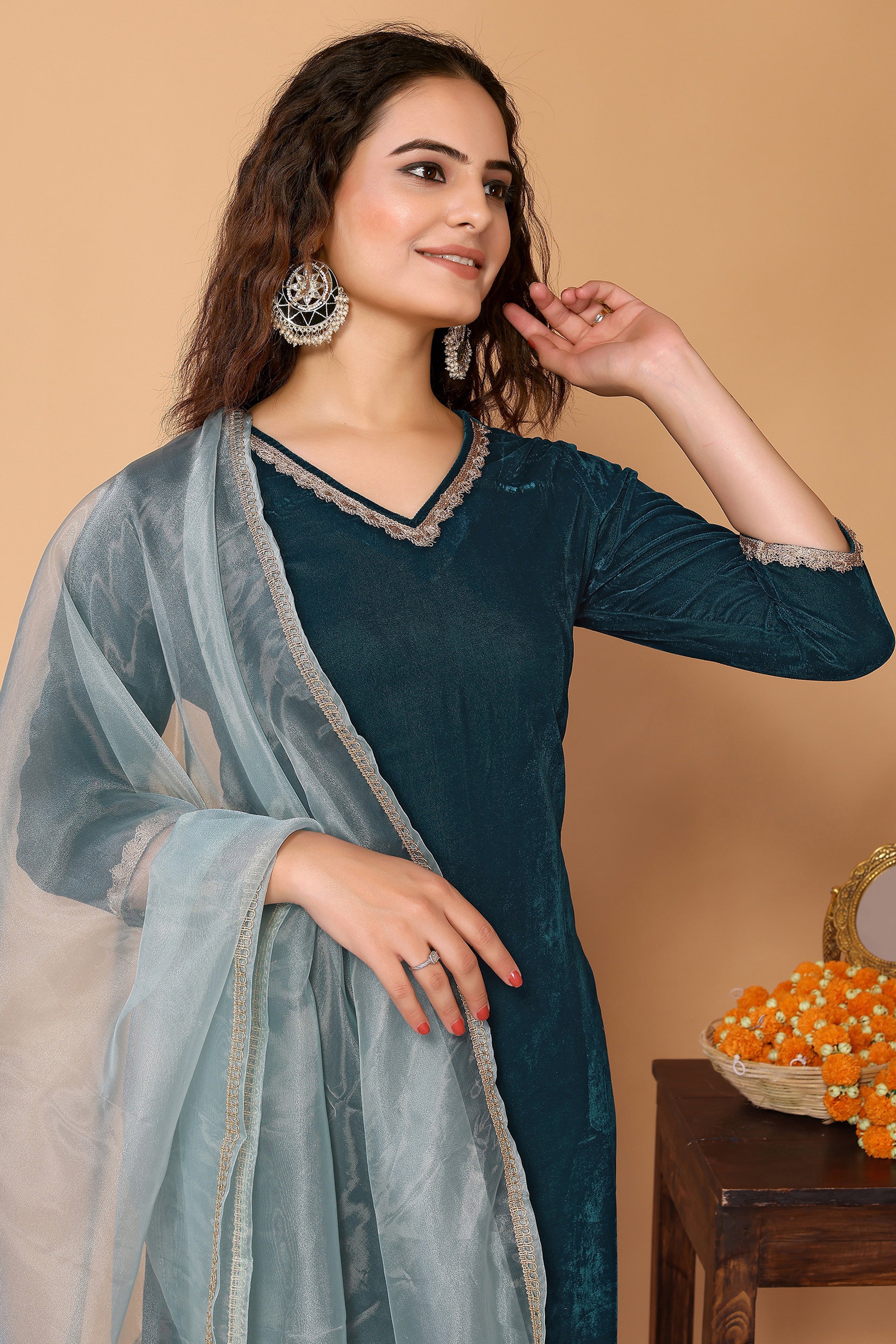 Teal Blue Velvet Kurta with Brocade Pant & Organza Dupatta set