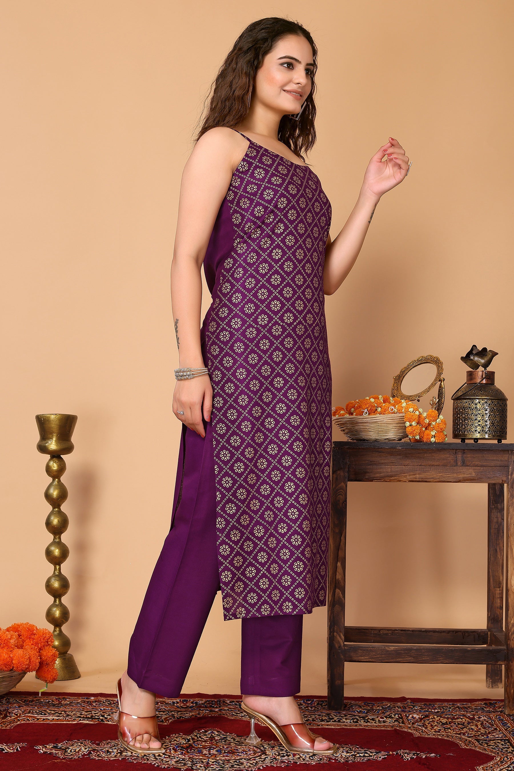 Purple Bandhani Foil Printed Rayon Shoulder Strap Kurta with Pant, & Chiffon Dupatta Set.