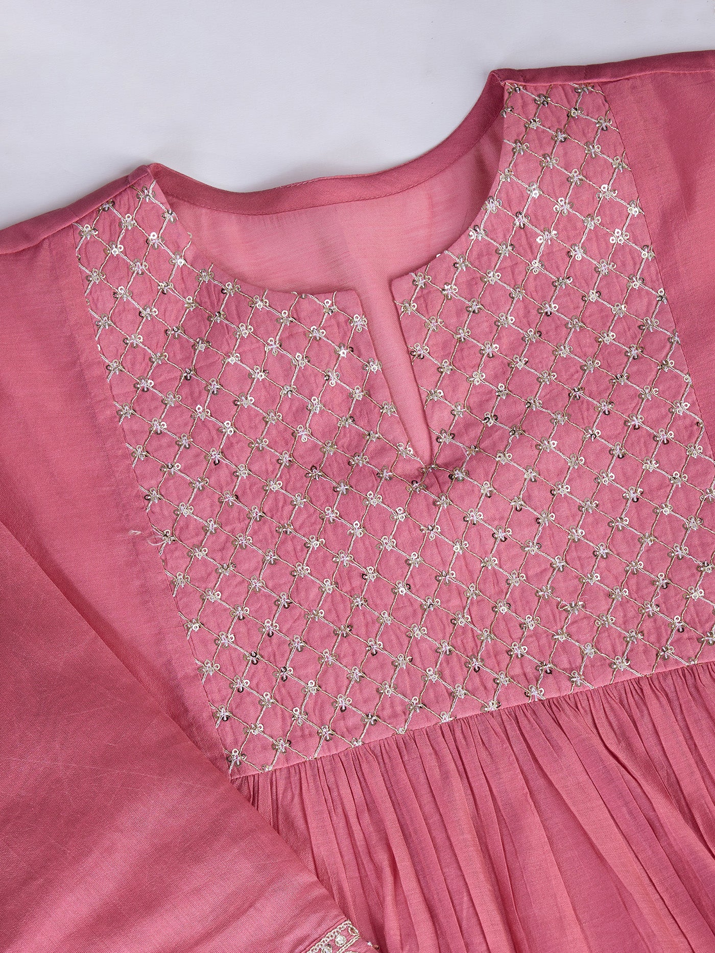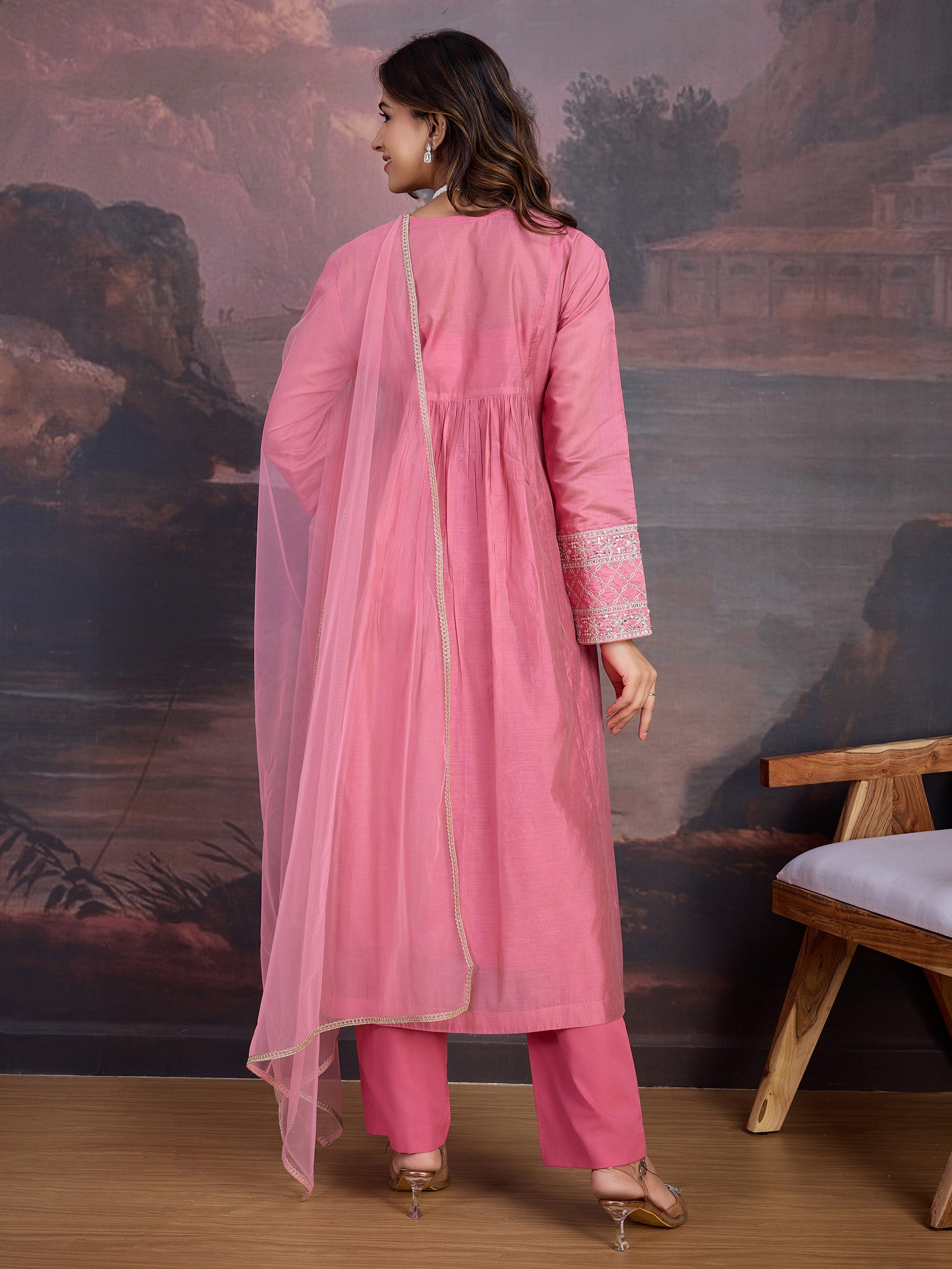 Pink Chanderi Cotton Silk Kurta with Pant, & Net Dupatta