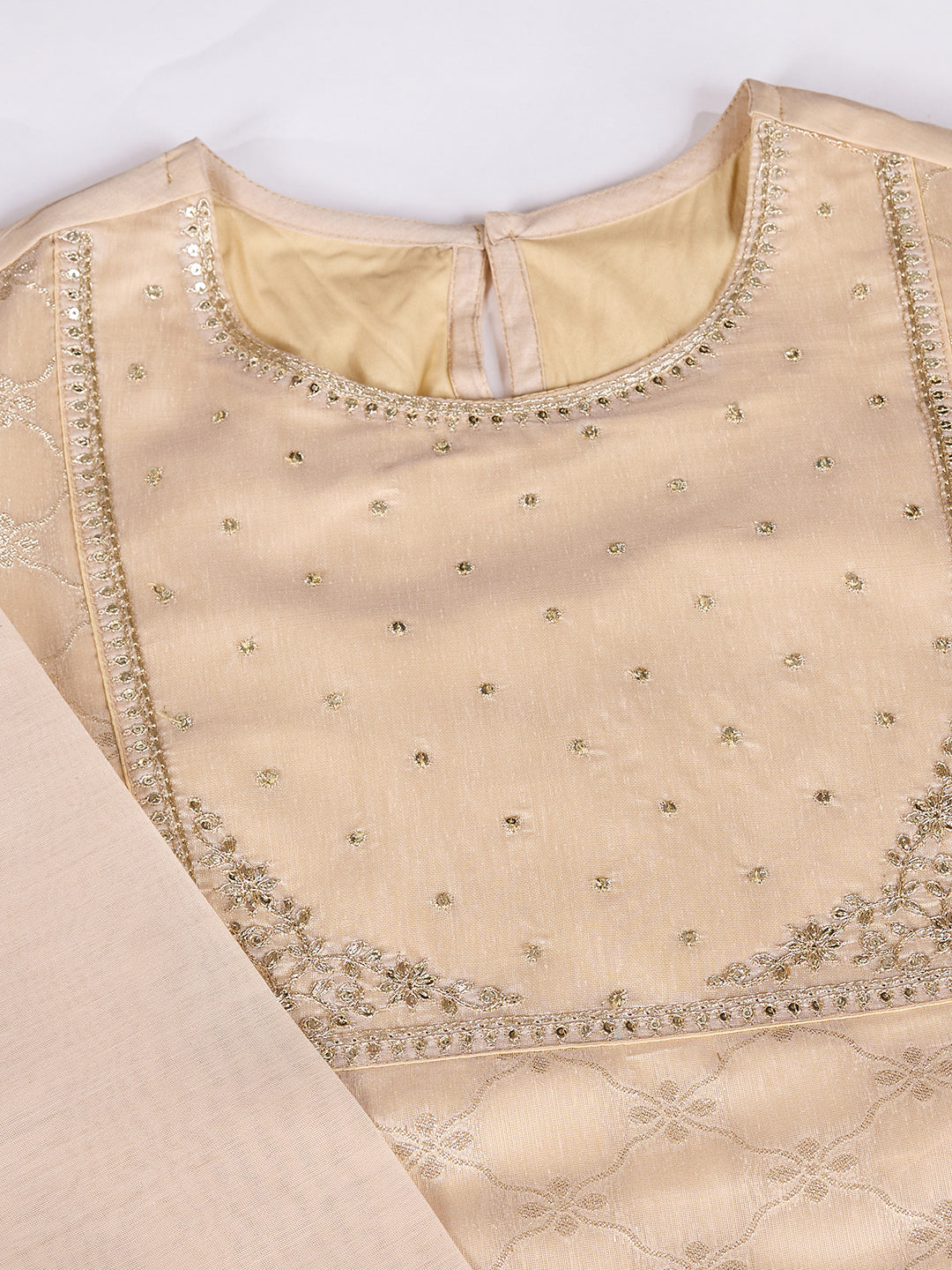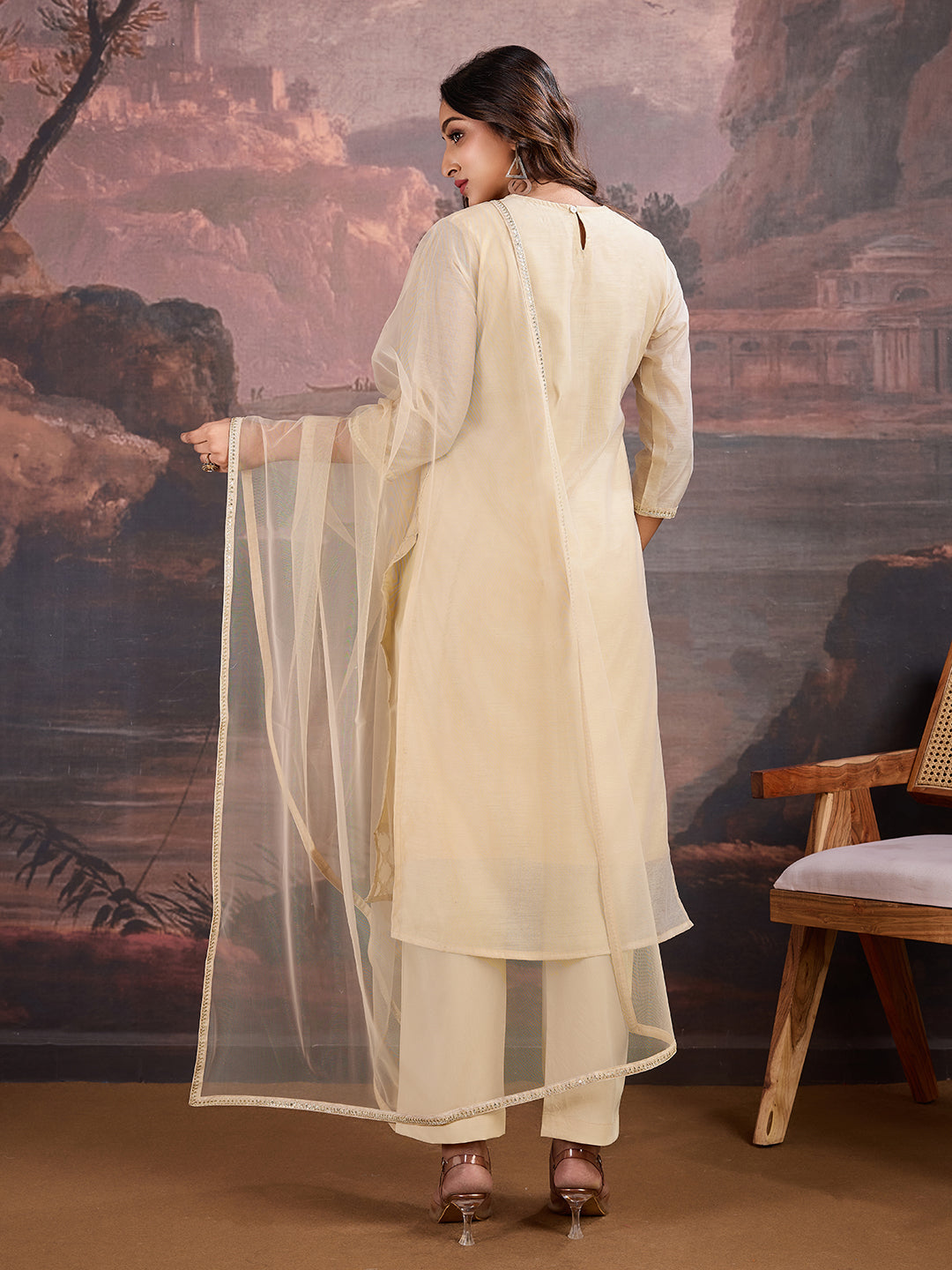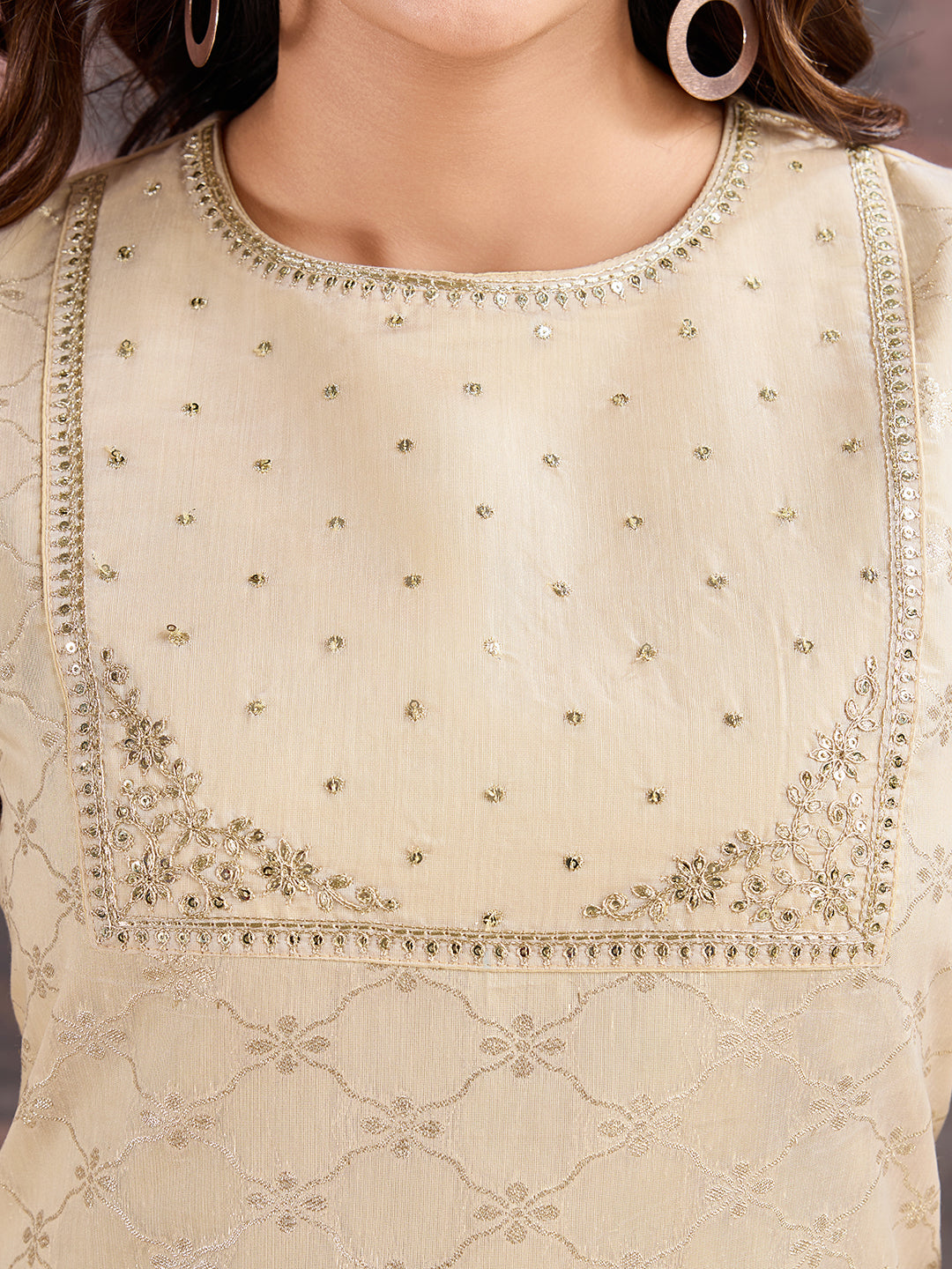 Cream Jacquard Chanderi Cotton Silk Kurta, Pant and Dupatta Set