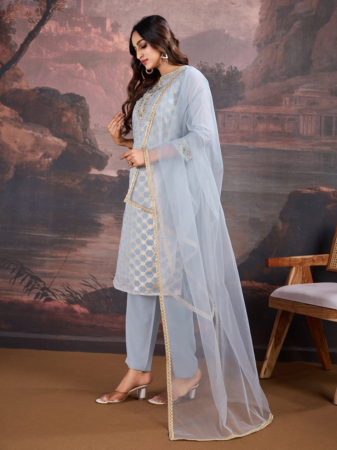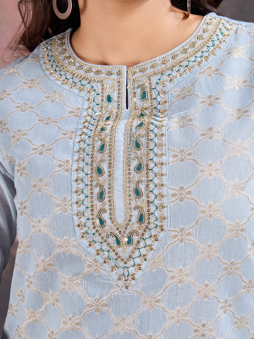 Grey Jacquard Chanderi Cotton Silk Kurta, Pant and Dupatta Set