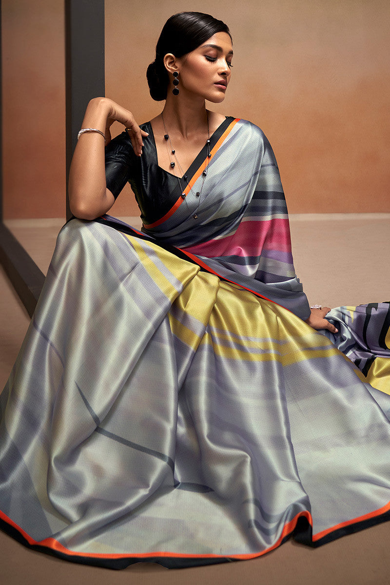 Description : Elevate your ethnic wardrobe with this luxurious Satin Silk Printed Saree, designed to make a statement at every occasion. Crafted from high-quality satin silk, this saree drapes gracefully, exuding a soft sheen and rich texture that feels as elegant as it looks. The intricate prints add a touch of contemporary style, blending traditional charm with modern aesthetics. Ideal for weddings, festive celebrations, and special gatherings, this saree comes with a matching blouse piece, allowing you to customize the look to your style.
