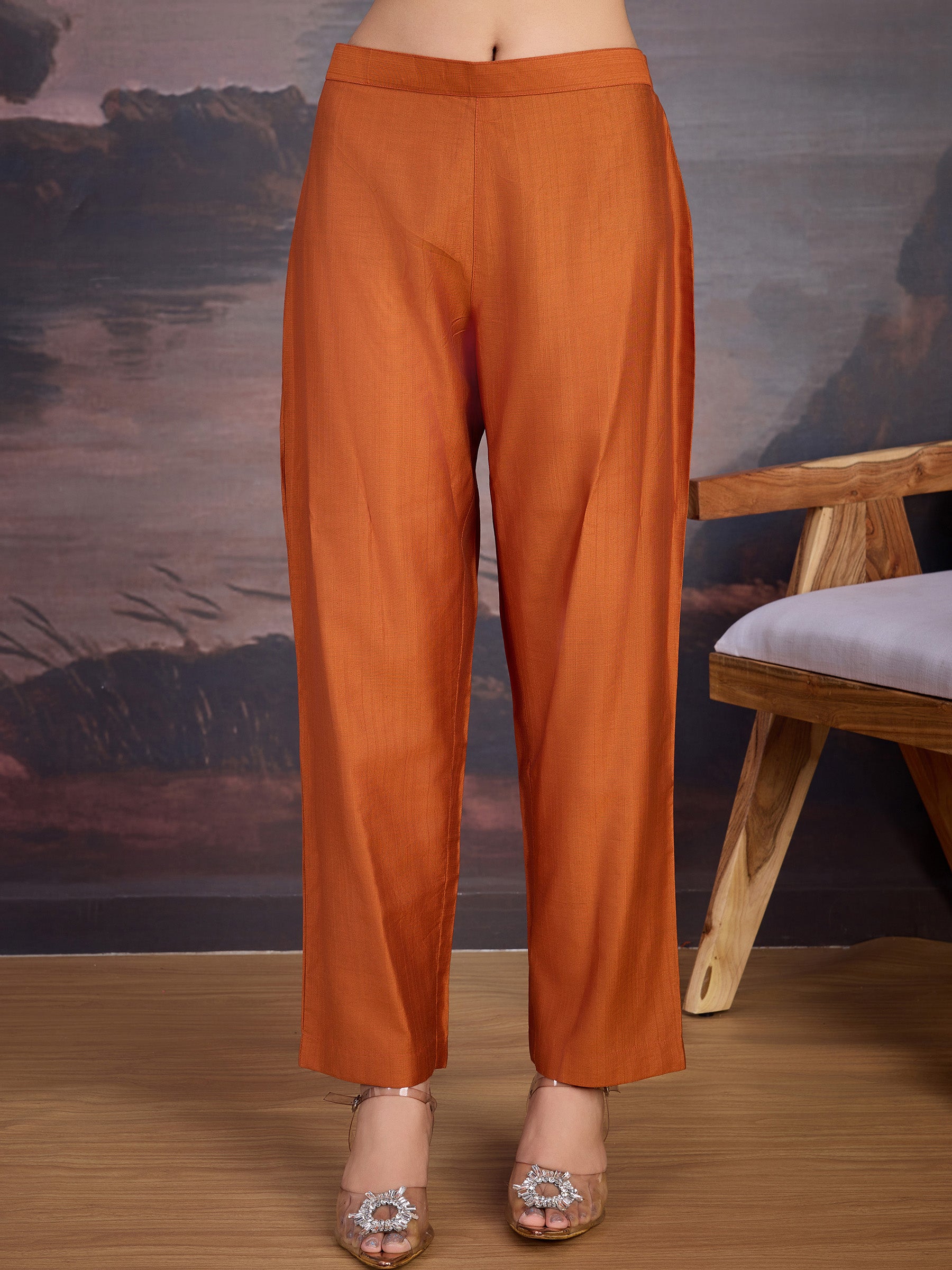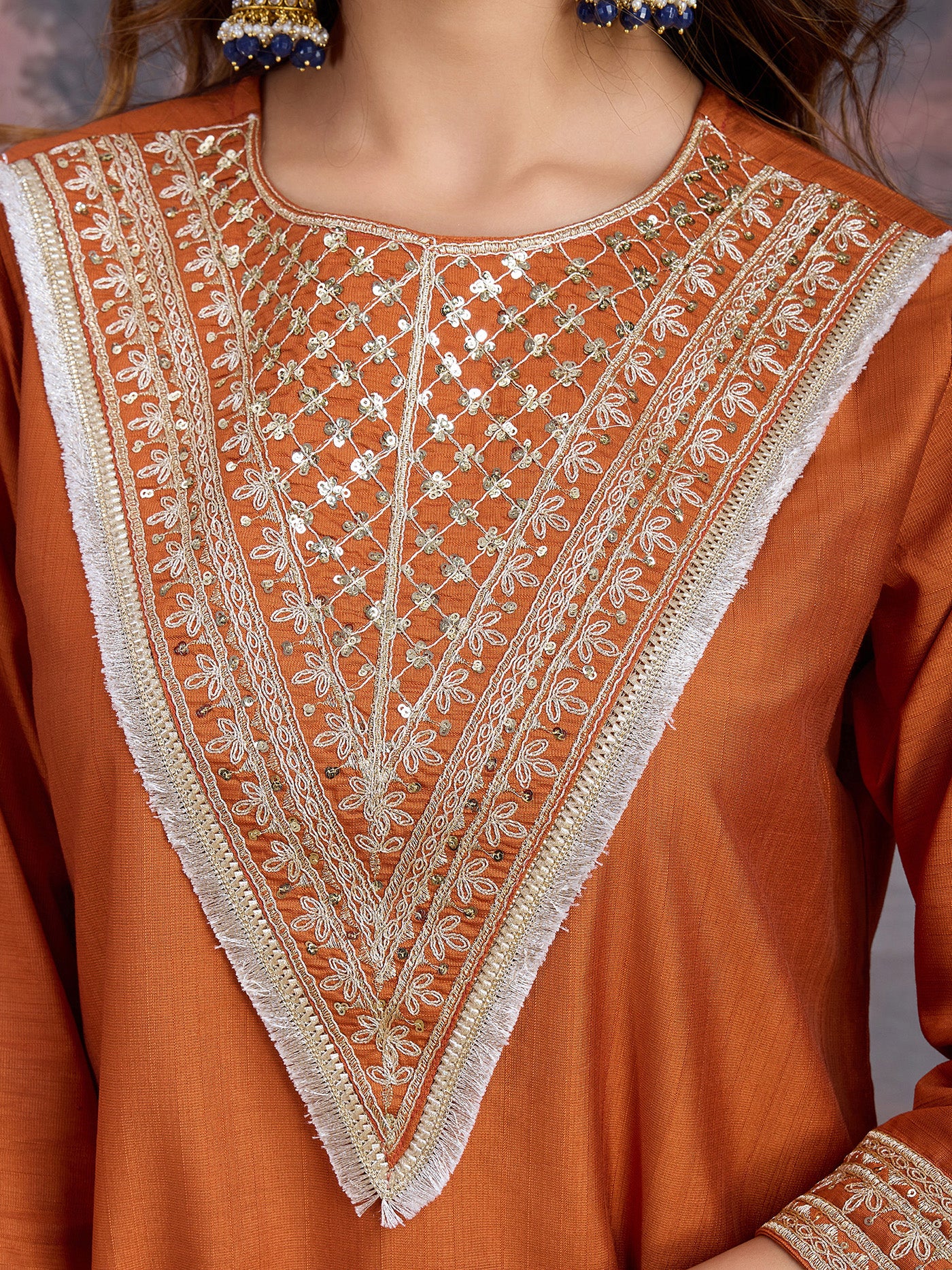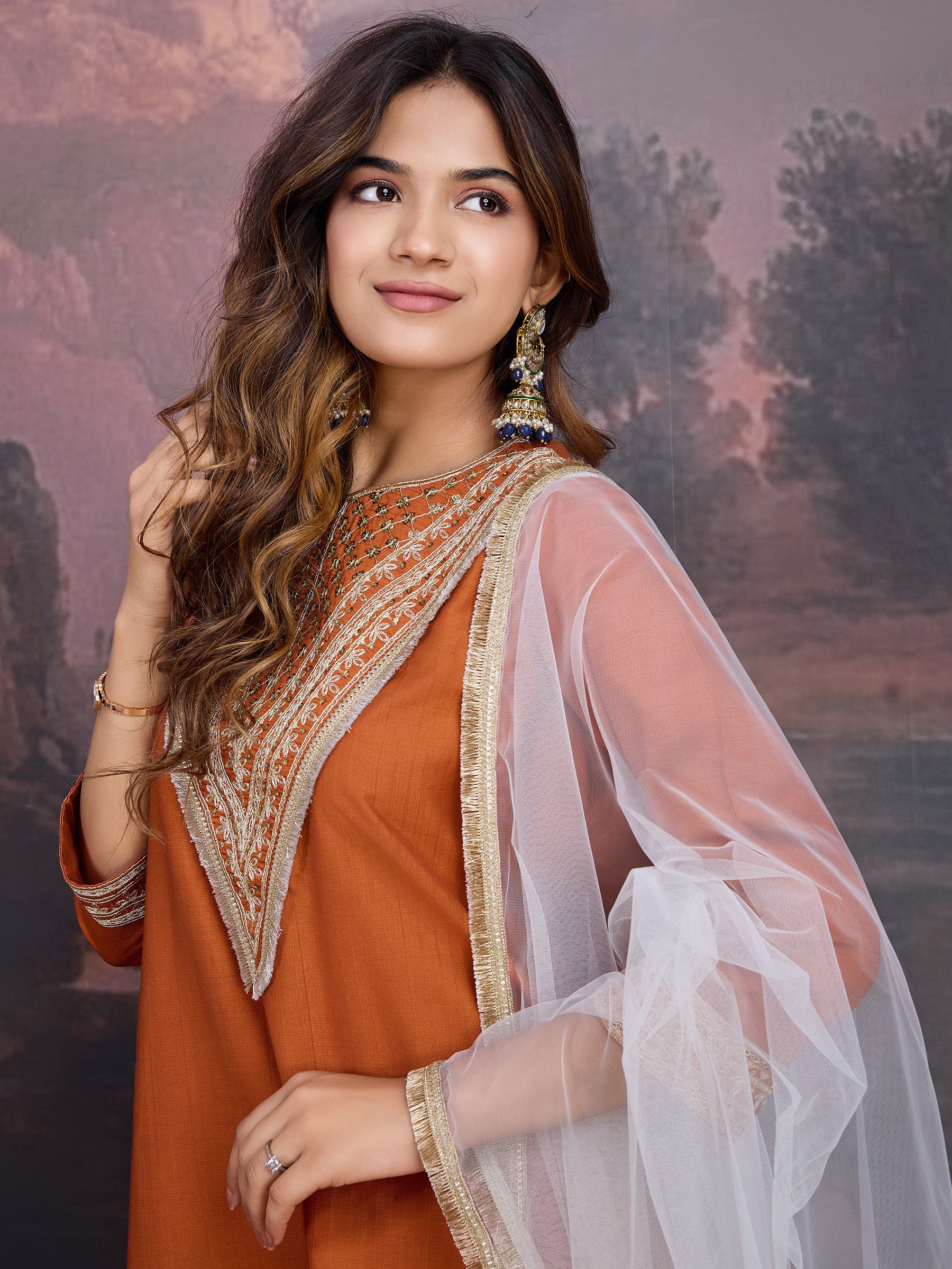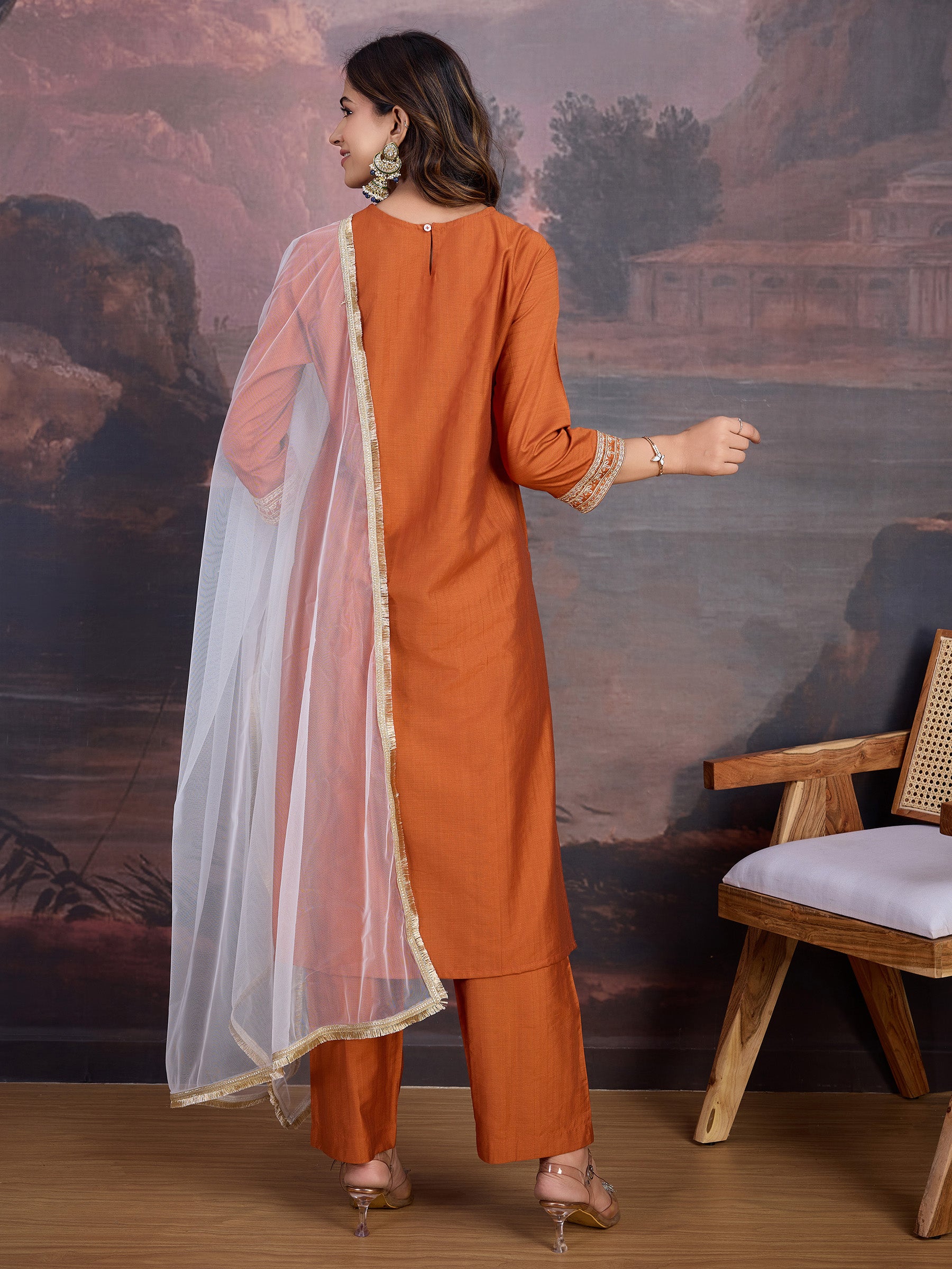 Silk Blend Embroidered Round Neck Kurta, Pant and Dupatta Set