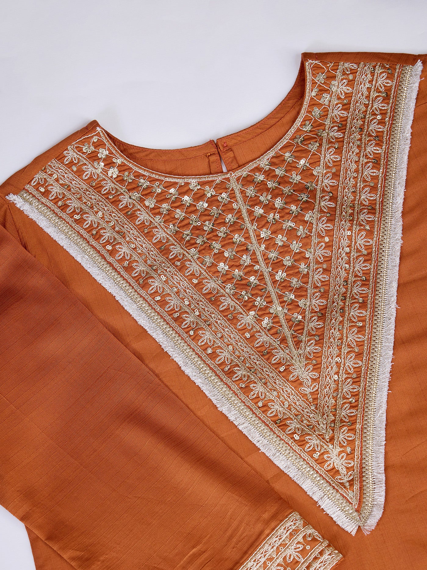 • Features a round neck adorned with intricate embroidery for an elegant and refined look.