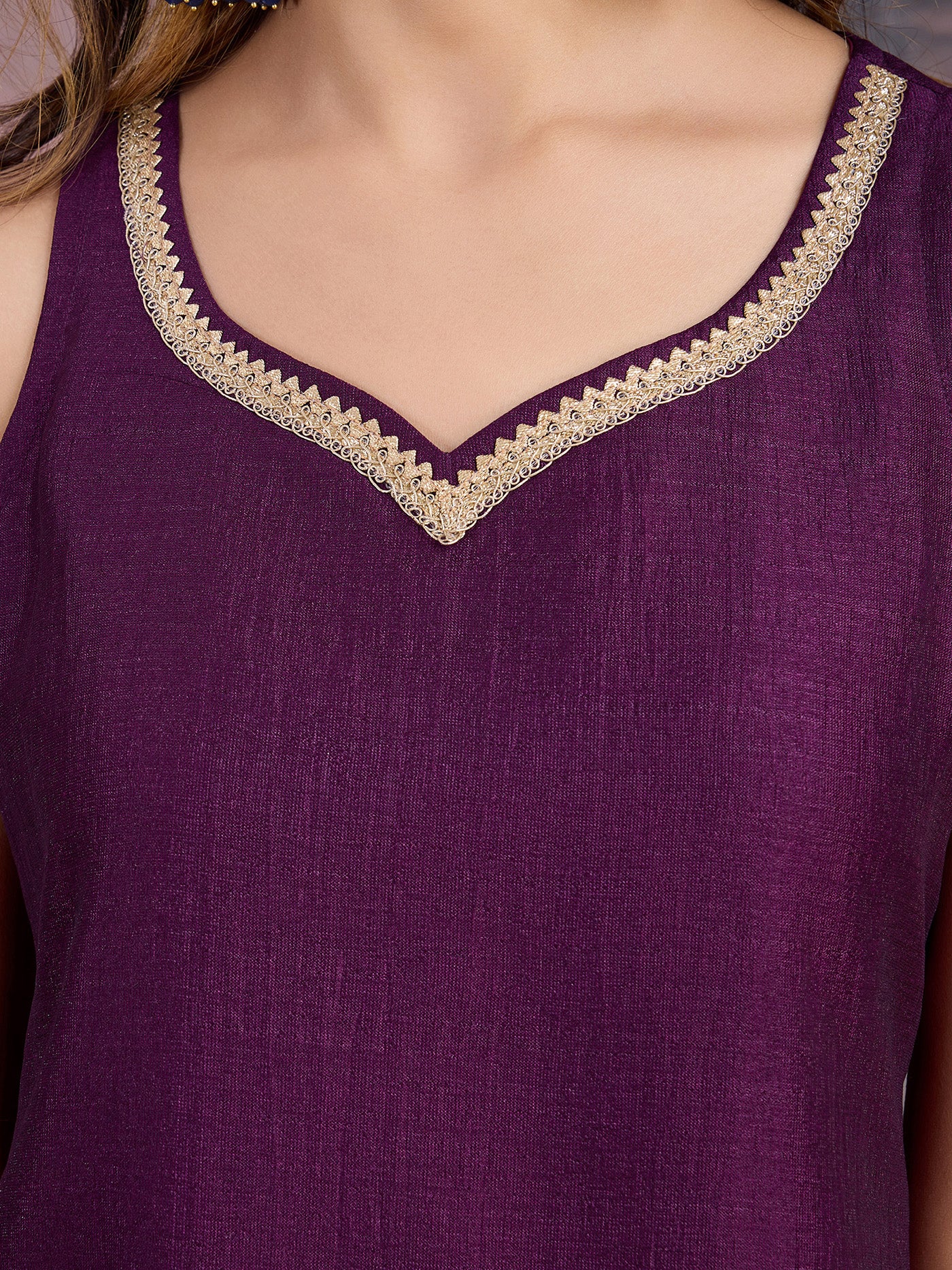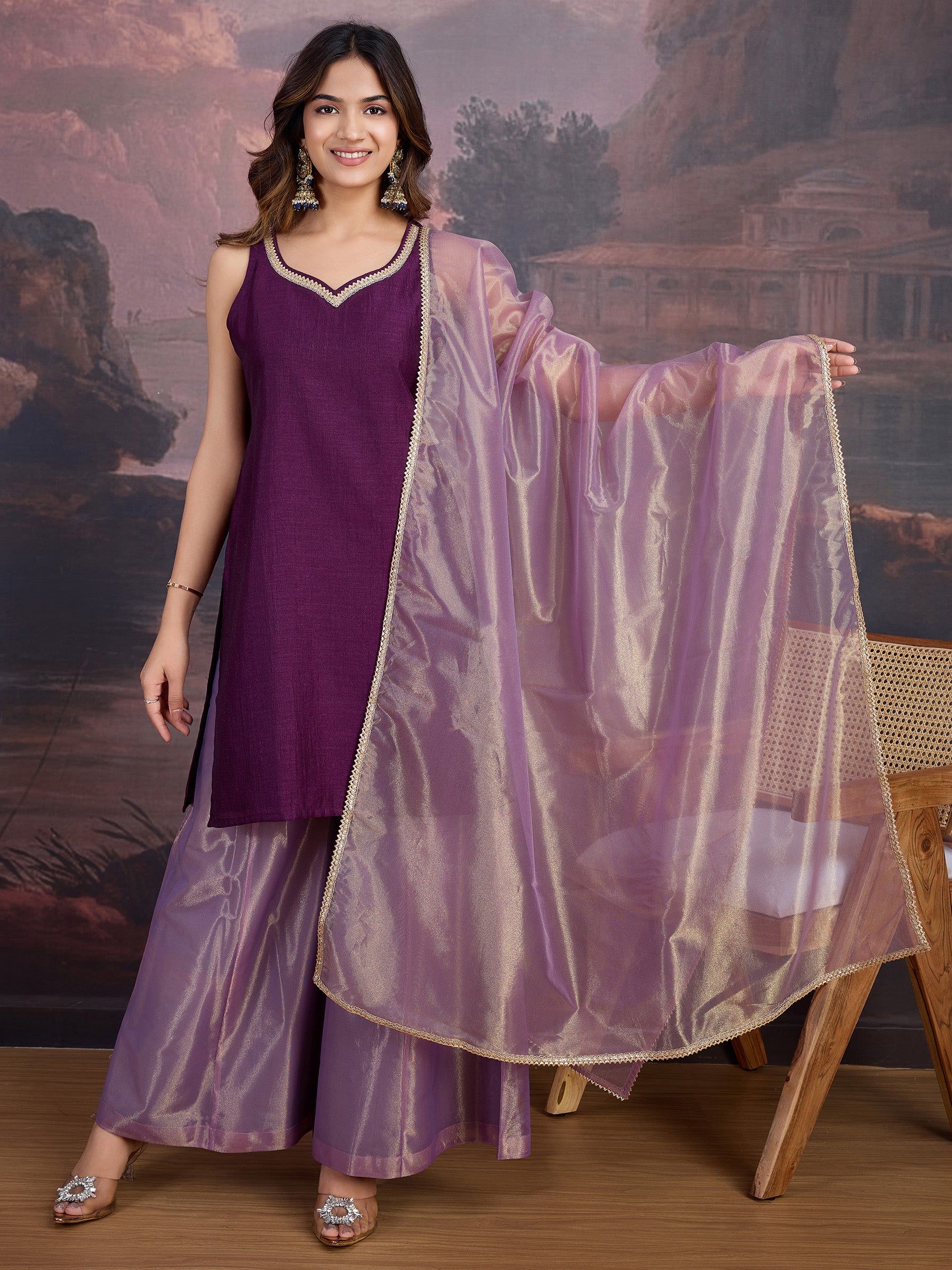 Step into effortless elegance with this Vichitra Silk Blend Kurta, Net Palazzo, and Net Dupatta Set with Inner, a versatile and chic ensemble perfect for festive occasions, family gatherings, and casual celebrations.