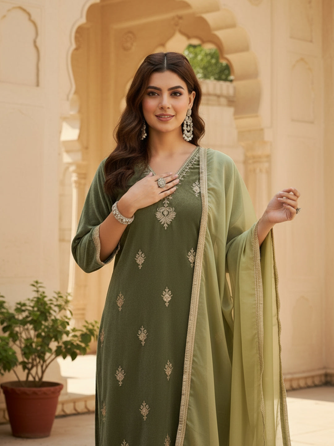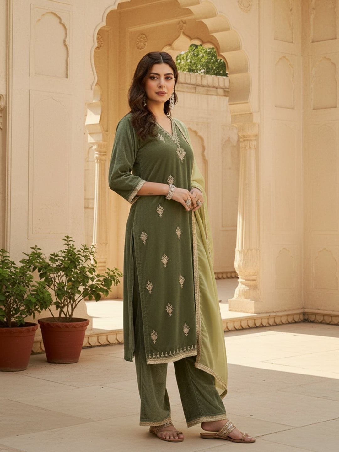 Olive Green Velvet Embroidered Kurta, Pant and Dupatta Set