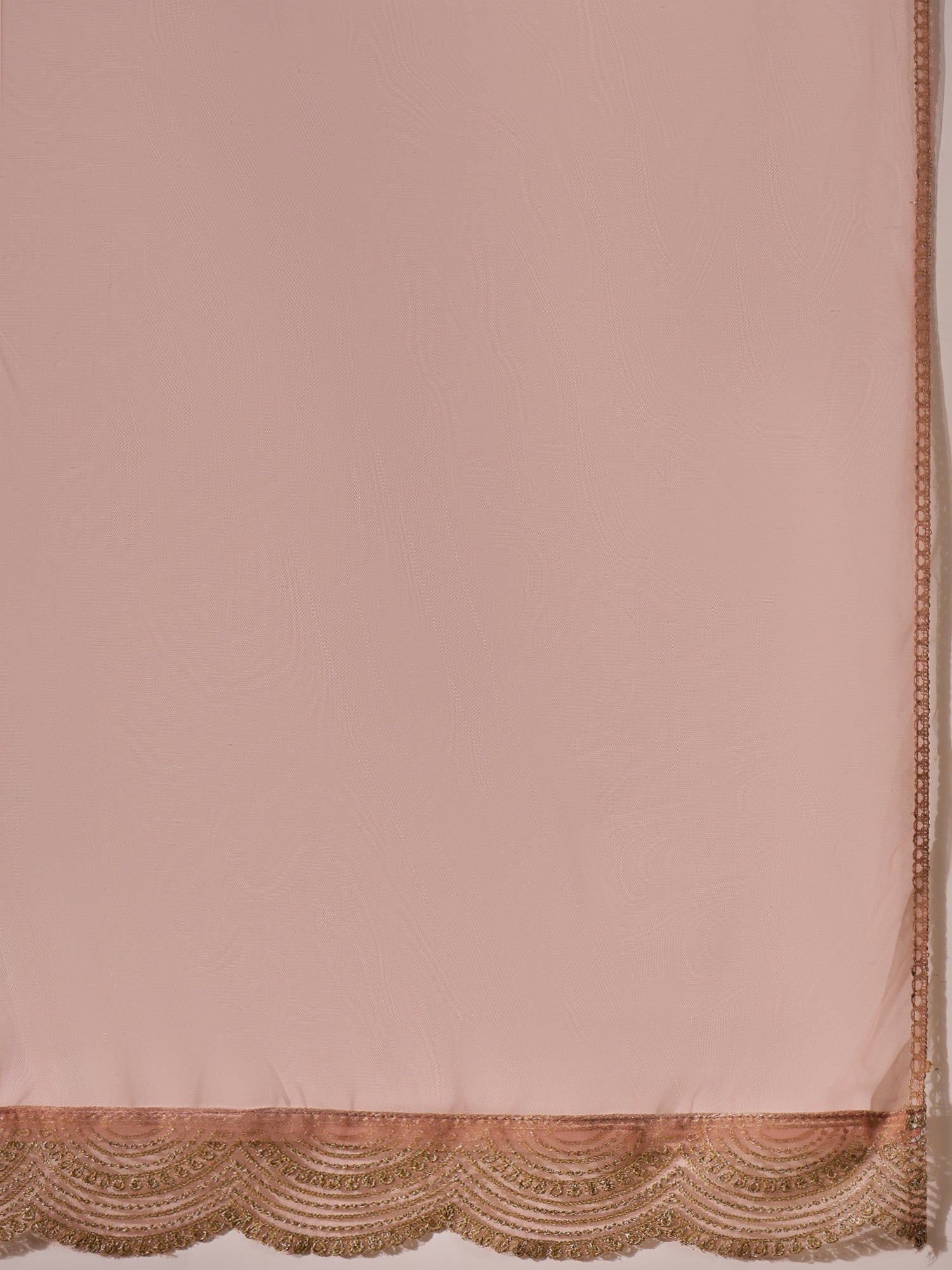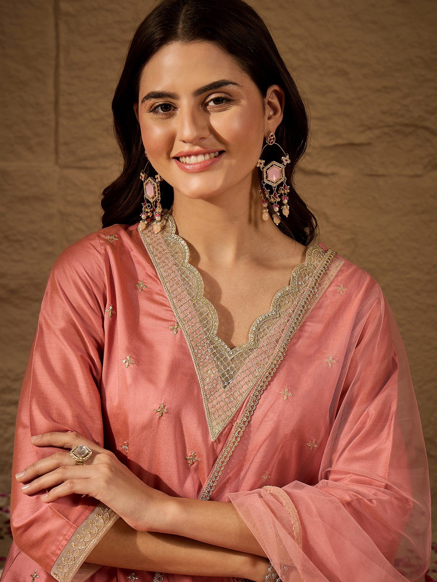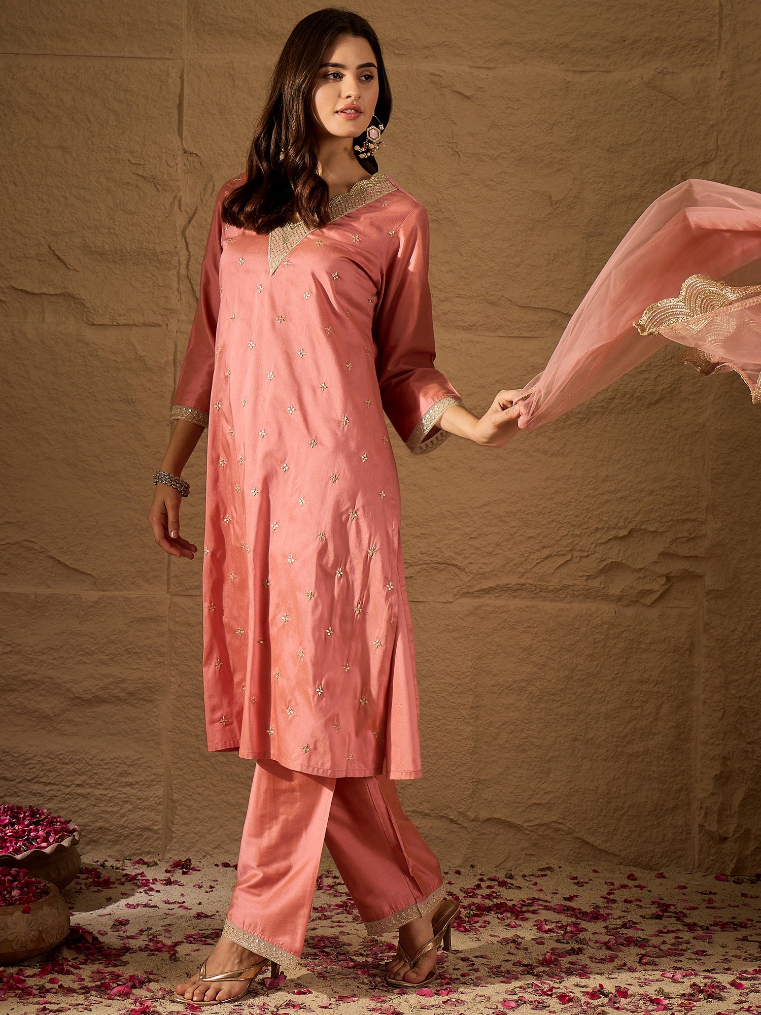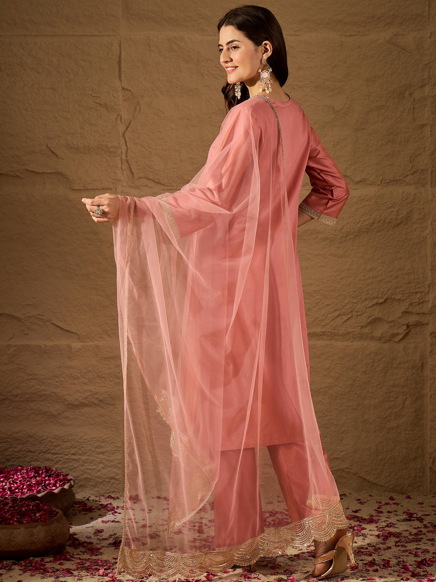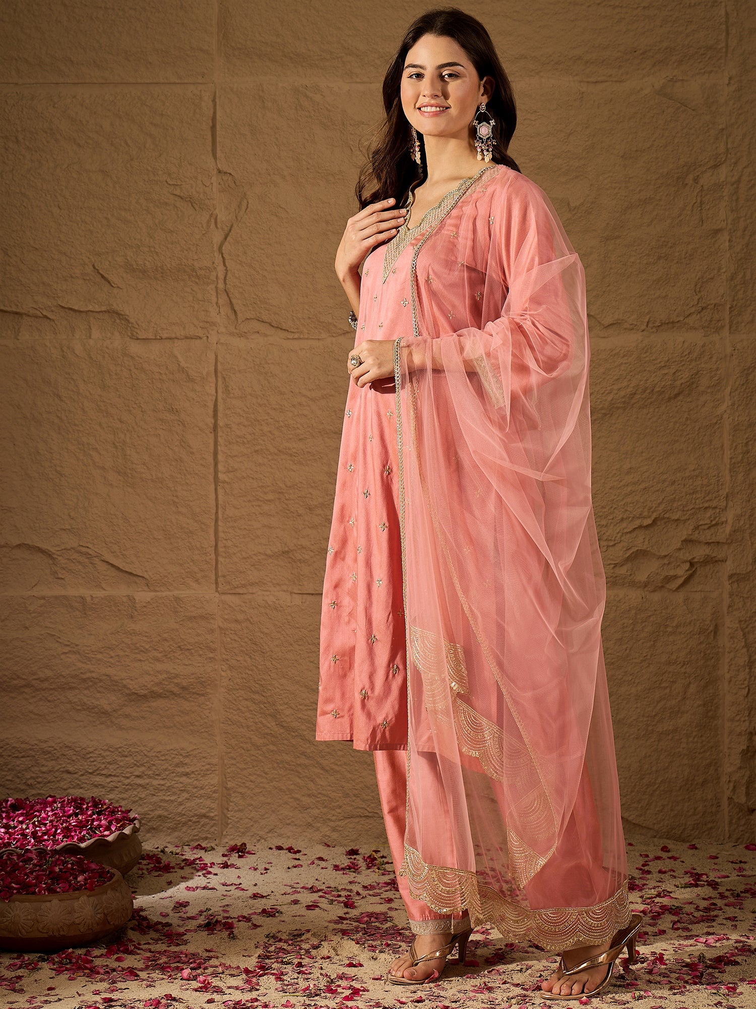 Brighten up any festive look with this peach silk blend kurta set. The kurta features elegant all-over embroidery, highlighted neckline, and delicate detailing on the borders. It is paired with straight-fit pants and a sheer net dupatta enhanced with scalloped embroidered lace for a graceful finishing touch. A refreshing choice for celebrations, festive evenings, and ethnic events.