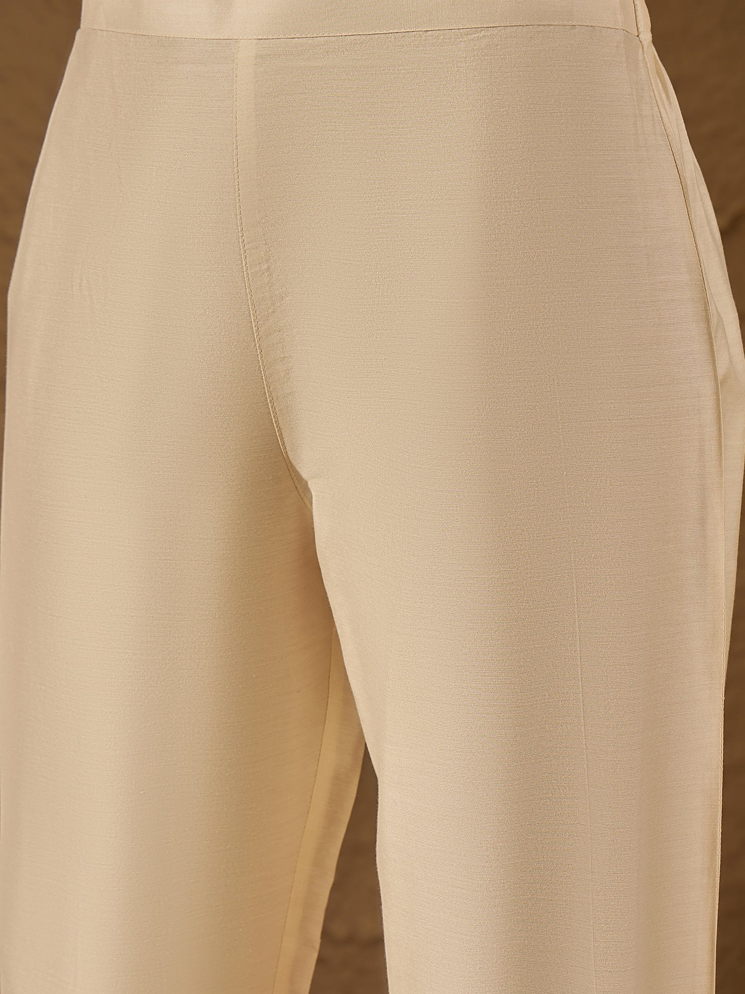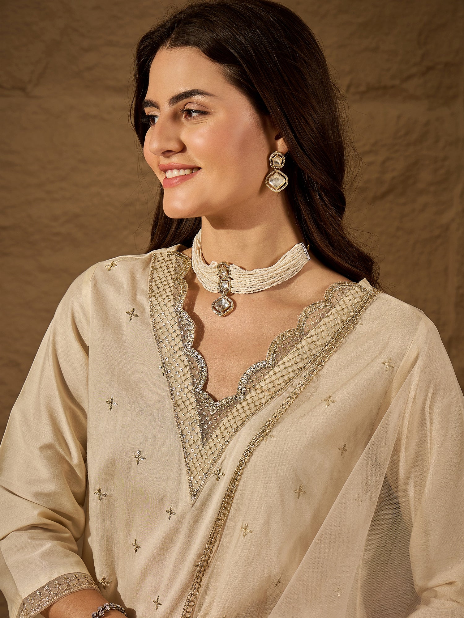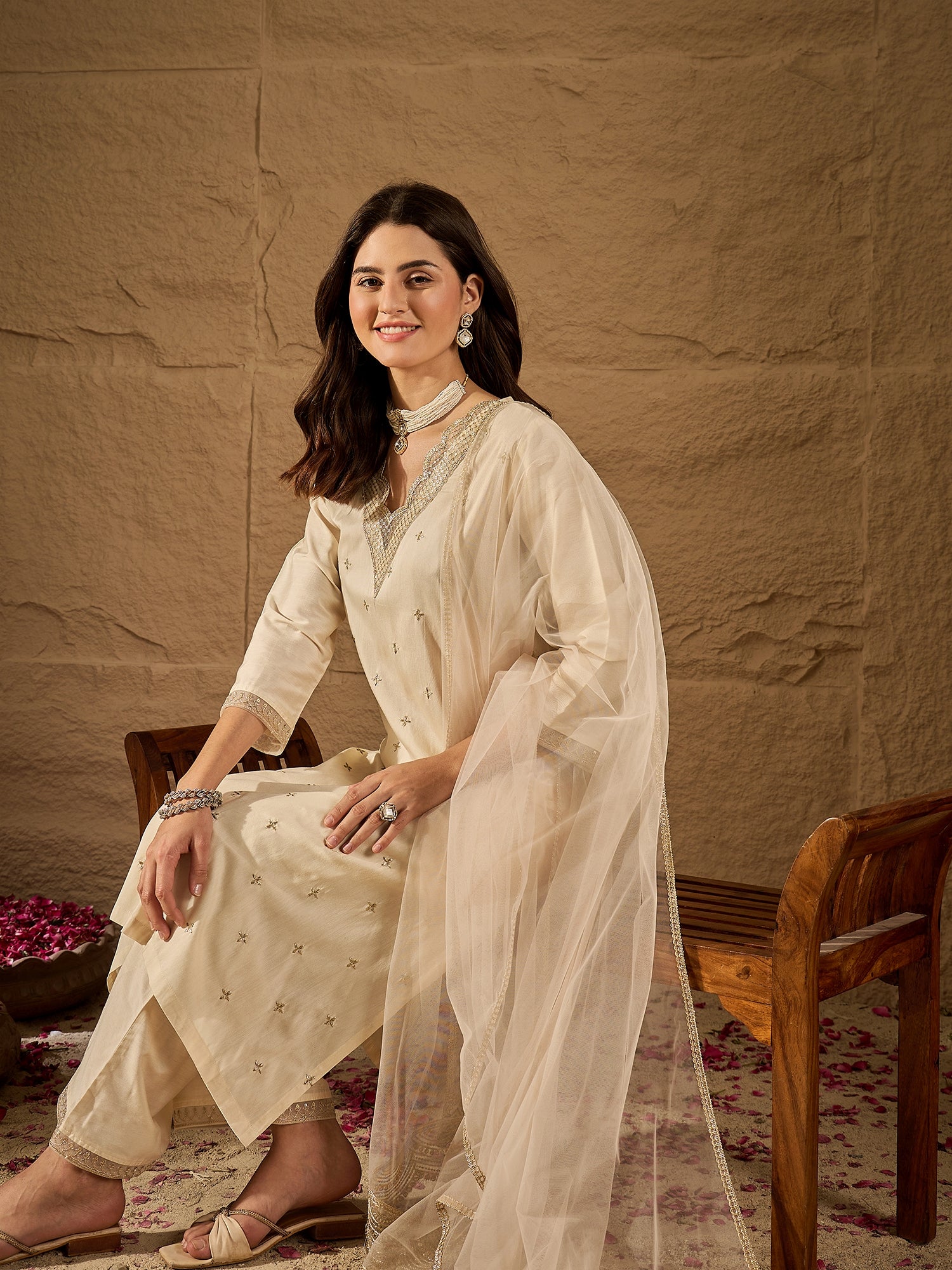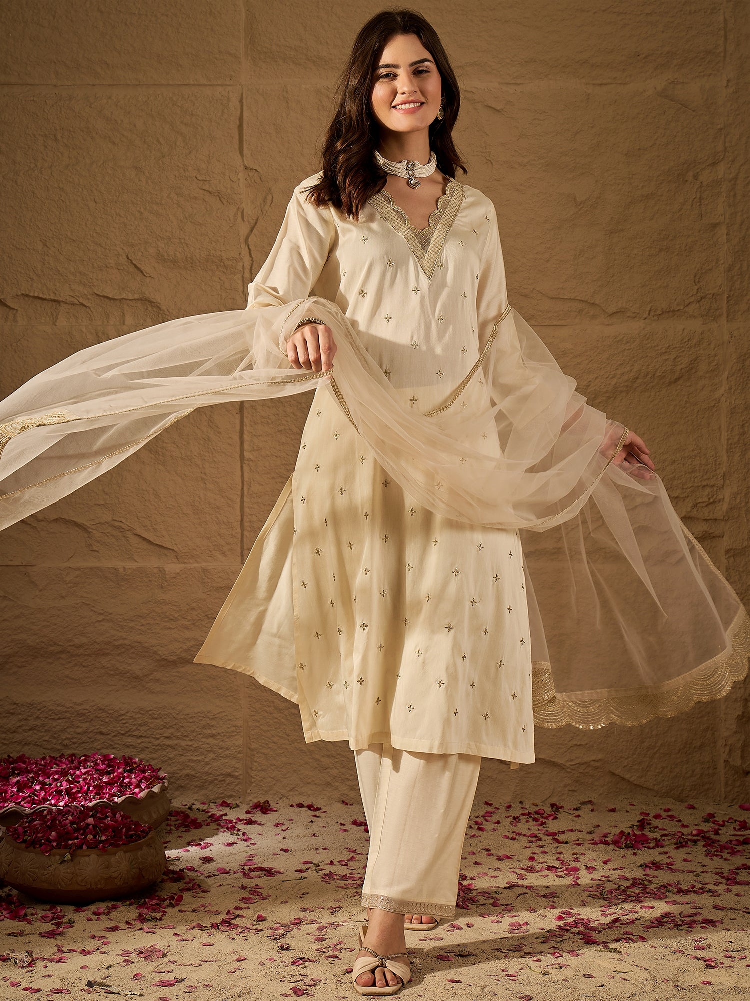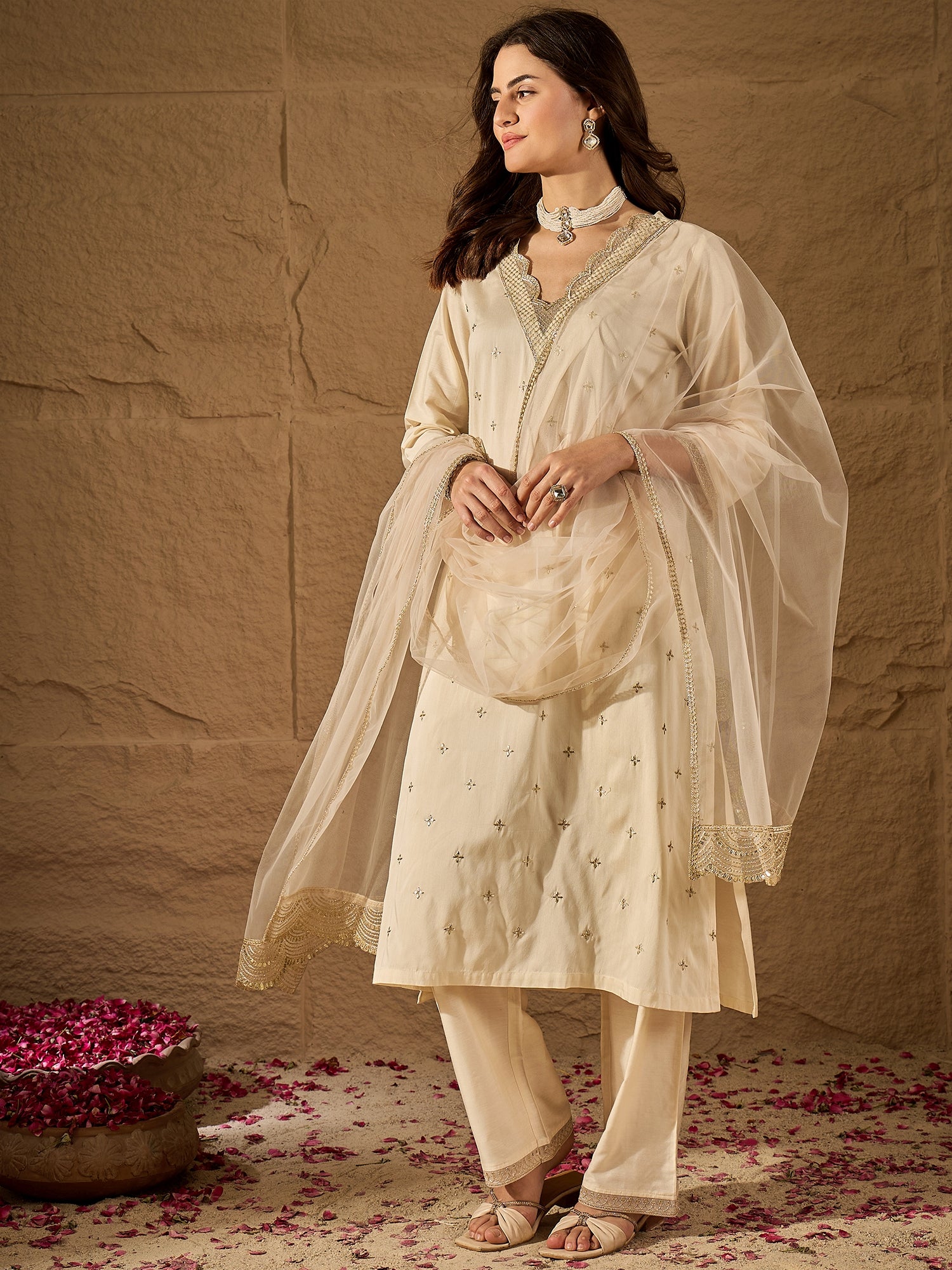 Classic Off-White Silk Blend Kurta Set with Net Dupatta