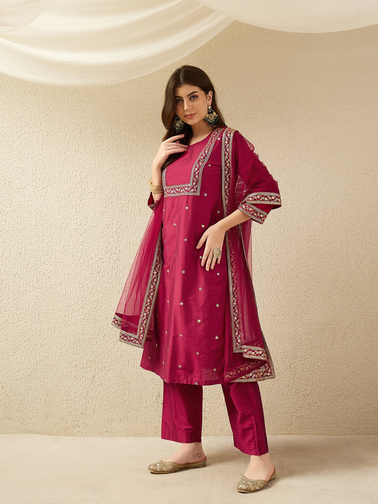 Dark Pink Embroidered Kurta Pant Set with Dupatta