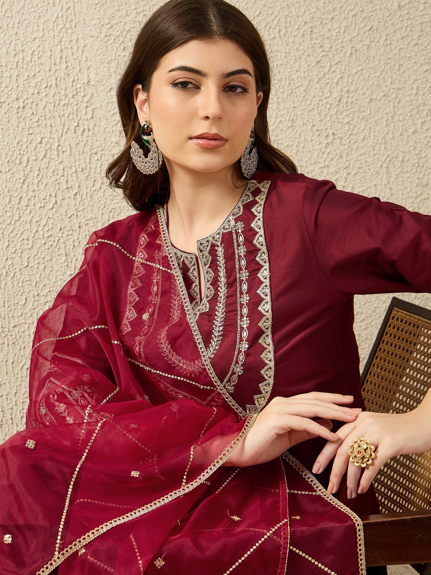 Elegant Wine Embroidered Kurta Set with DupattaElegant Gold Embroidered Kurta Set with Dupatta