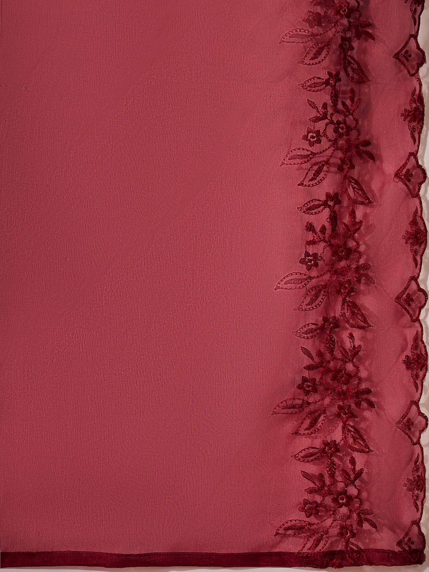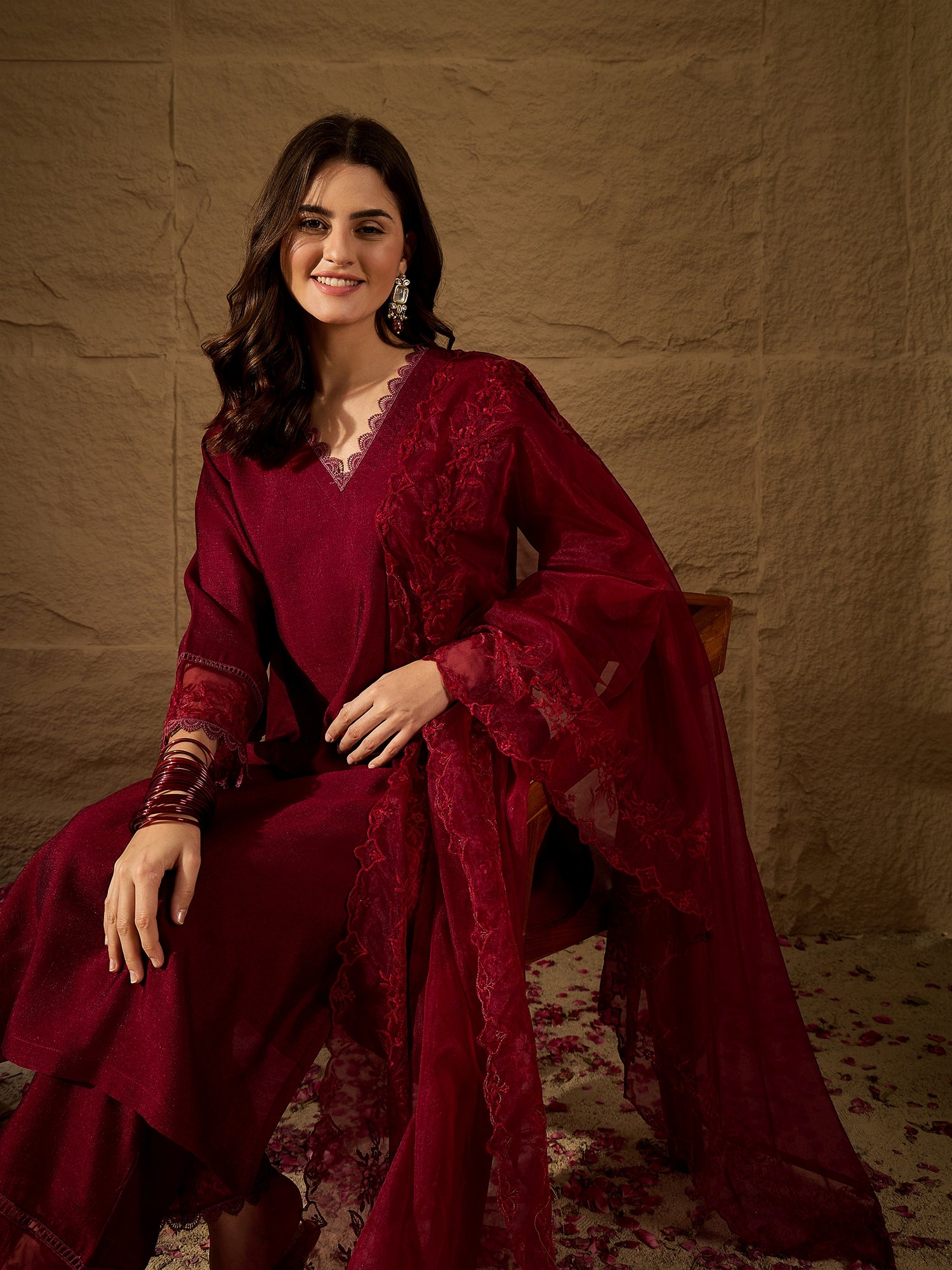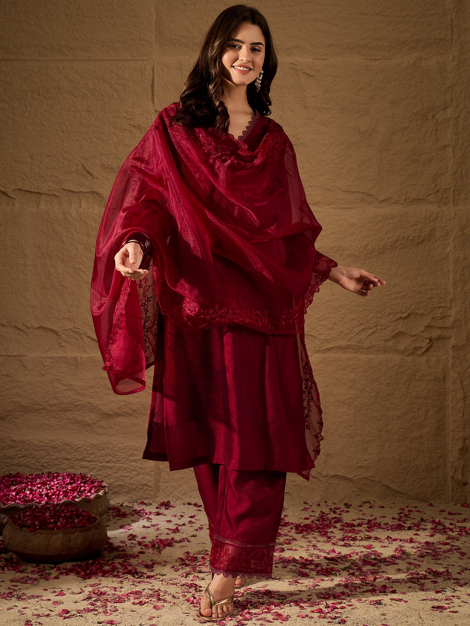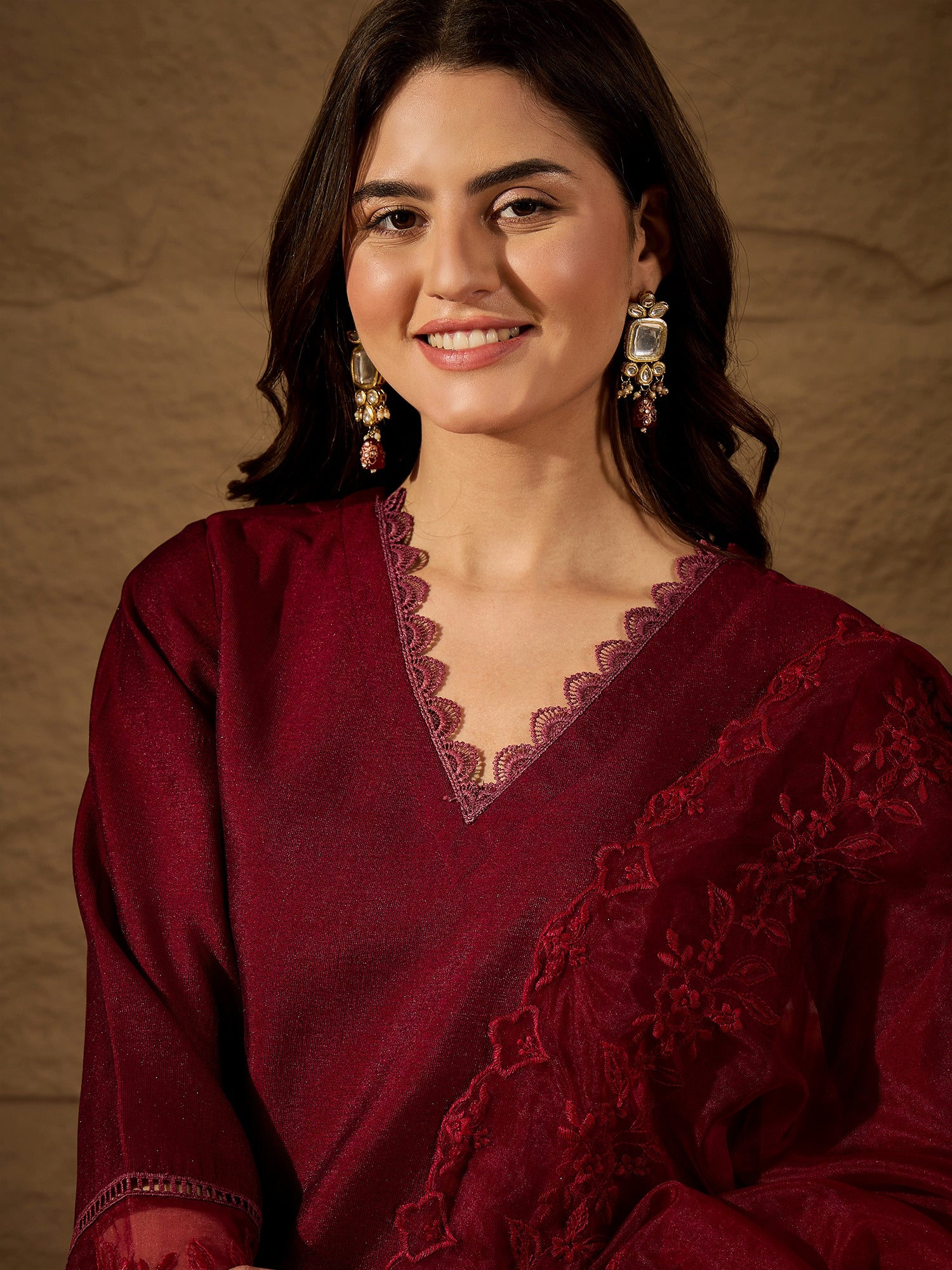 This stunning maroon ethnic set is crafted to bring elegance and comfort together. The set features a straight-fit kurta with a delicate lace-trimmed V-neckline and matching pants adorned with lace at the hem for a graceful touch. The lightweight, embroidered dupatta adds a traditional charm, making it ideal for festive gatherings, family functions, or evening events.