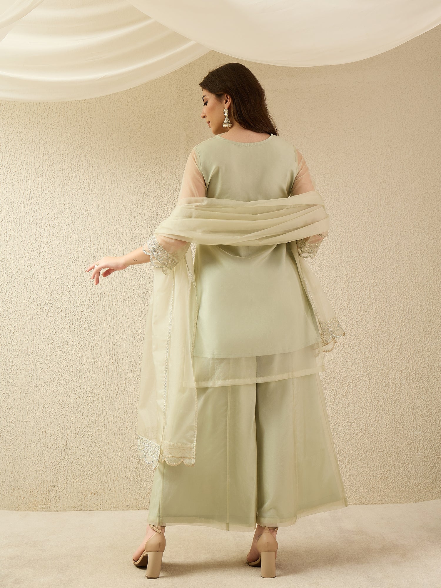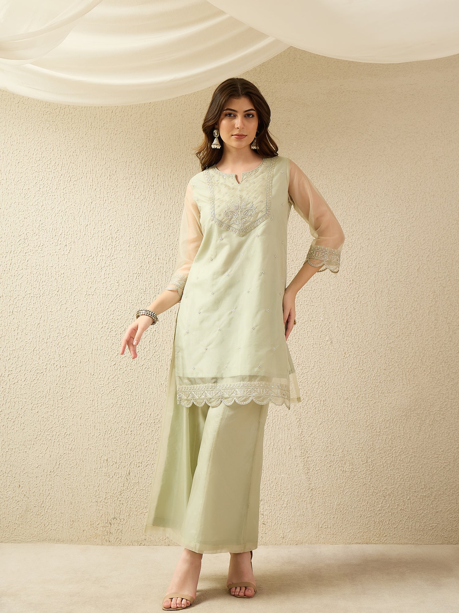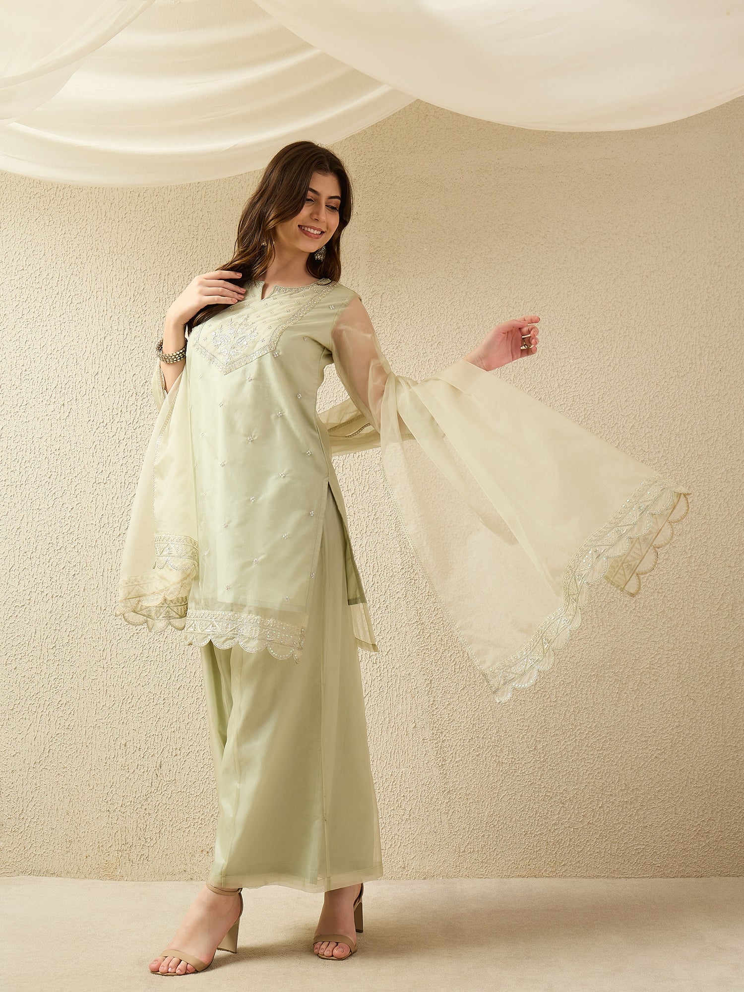 Elevate your ethnic wardrobe with this graceful three-piece kurta set, designed to blend timeless tradition with modern sophistication. Crafted from premium-quality organza fabric, the kurta features delicate thread and sequin embroidery on the neckline and yoke, adding a touch of shimmer to its pastel charm. The straight-cut kurta is paired with wide-leg palazzo pants that ensure both comfort and style. Completing the look is a lightweight organza dupatta with scalloped lace edging and intricate embroidery, lending the outfit a soft, feminine elegance.