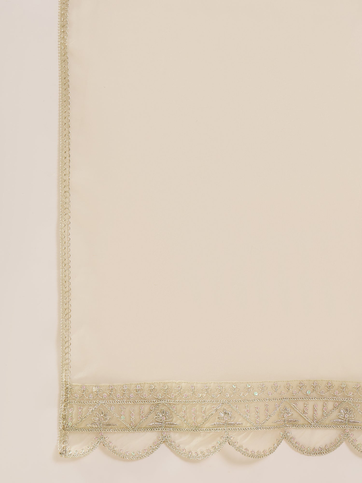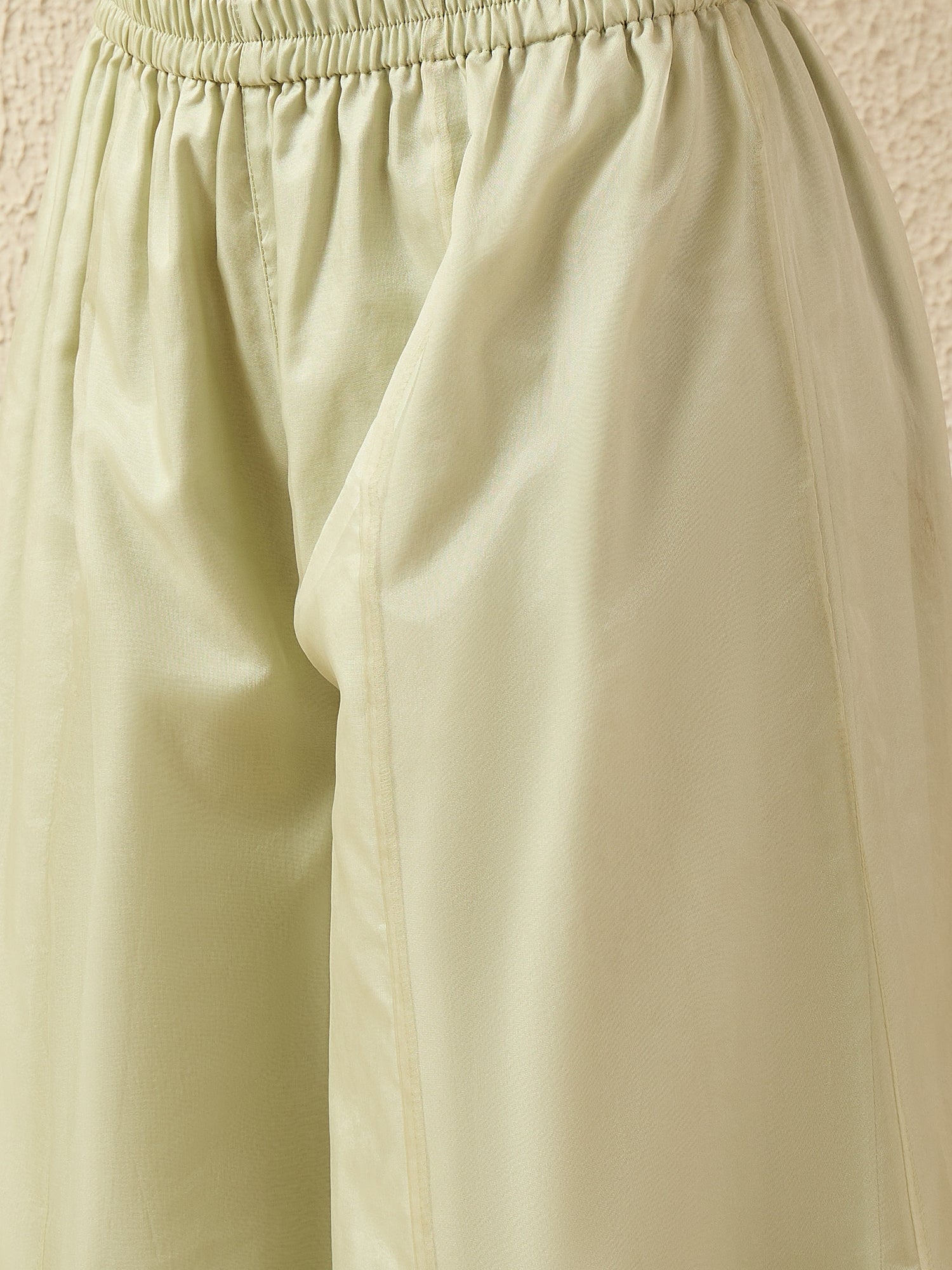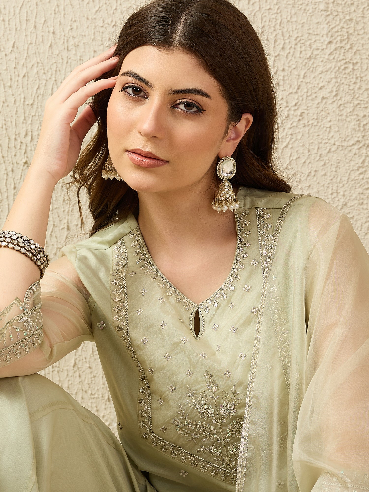 Elevate your ethnic wardrobe with this graceful three-piece kurta set, designed to blend timeless tradition with modern sophistication. Crafted from premium-quality organza fabric, the kurta features delicate thread and sequin embroidery on the neckline and yoke, adding a touch of shimmer to its pastel charm. The straight-cut kurta is paired with wide-leg palazzo pants that ensure both comfort and style. Completing the look is a lightweight organza dupatta with scalloped lace edging and intricate embroidery, lending the outfit a soft, feminine elegance.