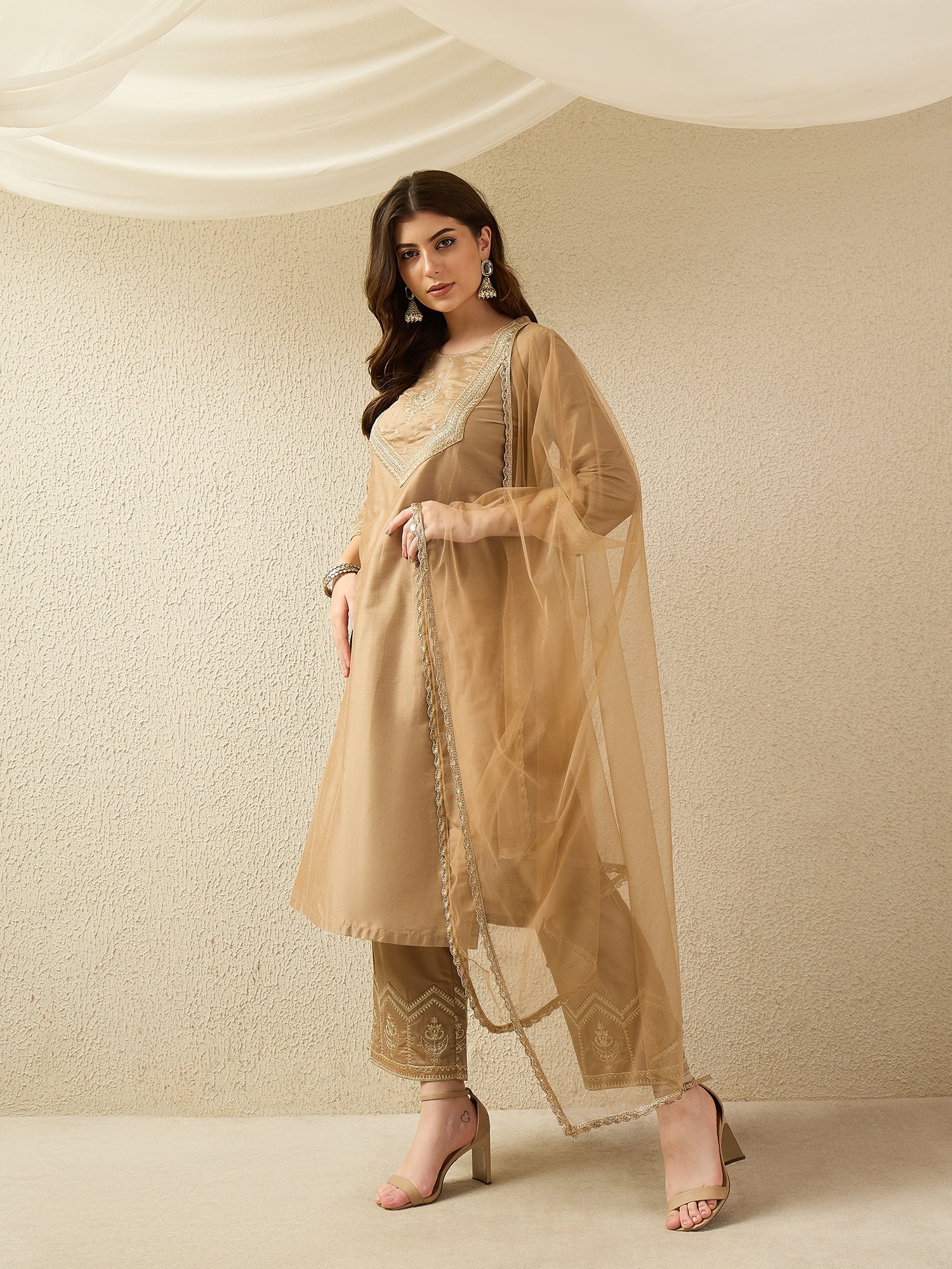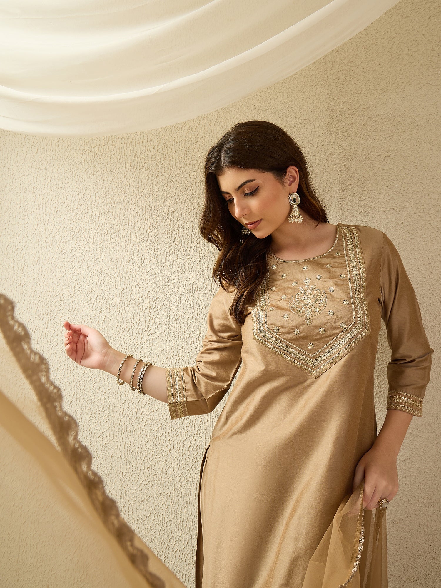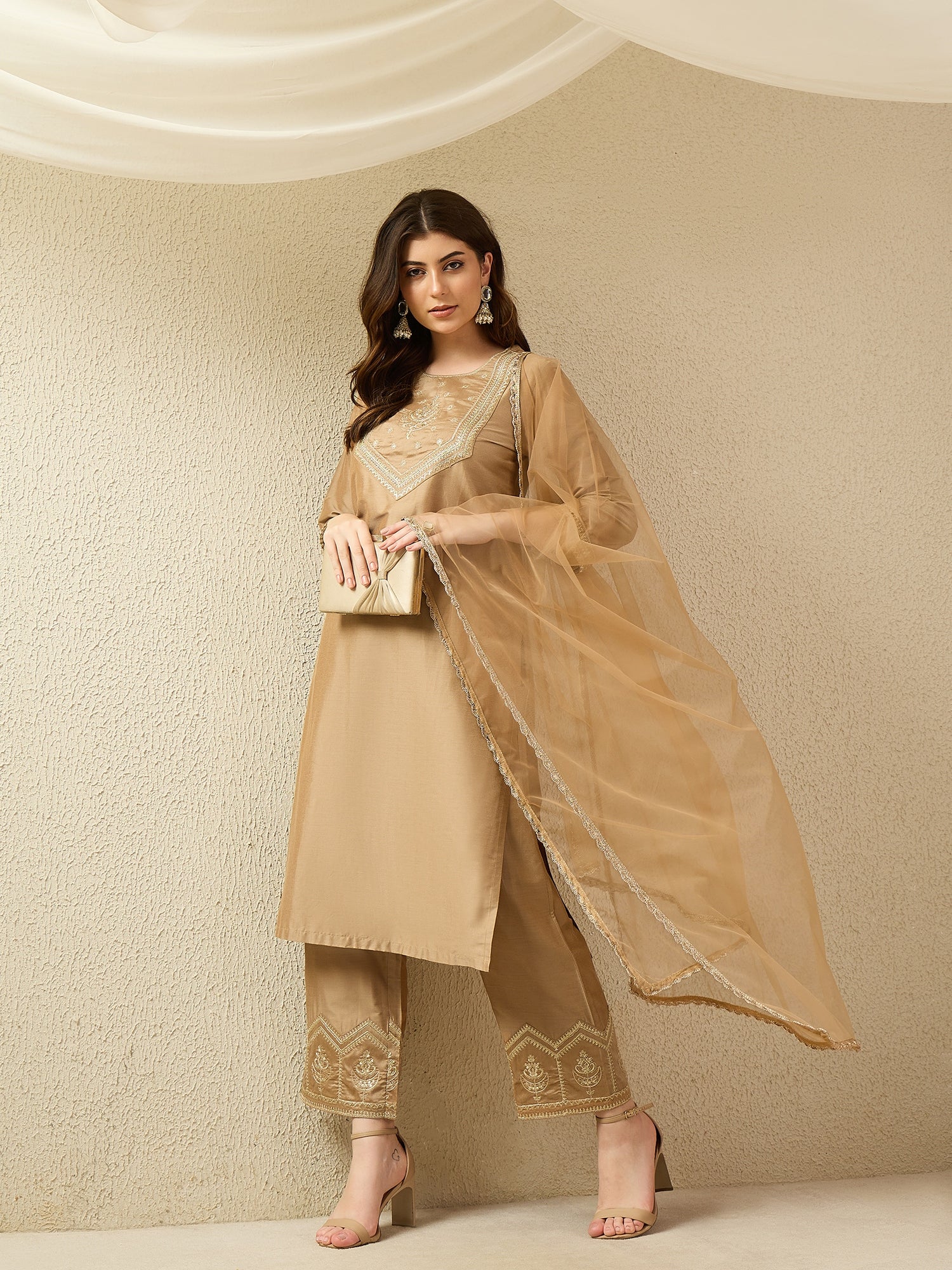 Elevate your ethnic wardrobe with this graceful three-piece embroidered suit set, designed for timeless elegance and effortless sophistication. Crafted in a rich golden-beige tone, the outfit features delicate embroidery that adds a refined festive charm. The straight-cut kurta is beautifully detailed with intricate threadwork on the neckline and sleeves, paired with matching embroidered trousers and a soft, sheer dupatta that completes the look with understated luxury. Ideal for festive occasions, formal gatherings, and celebrations where elegance matters.