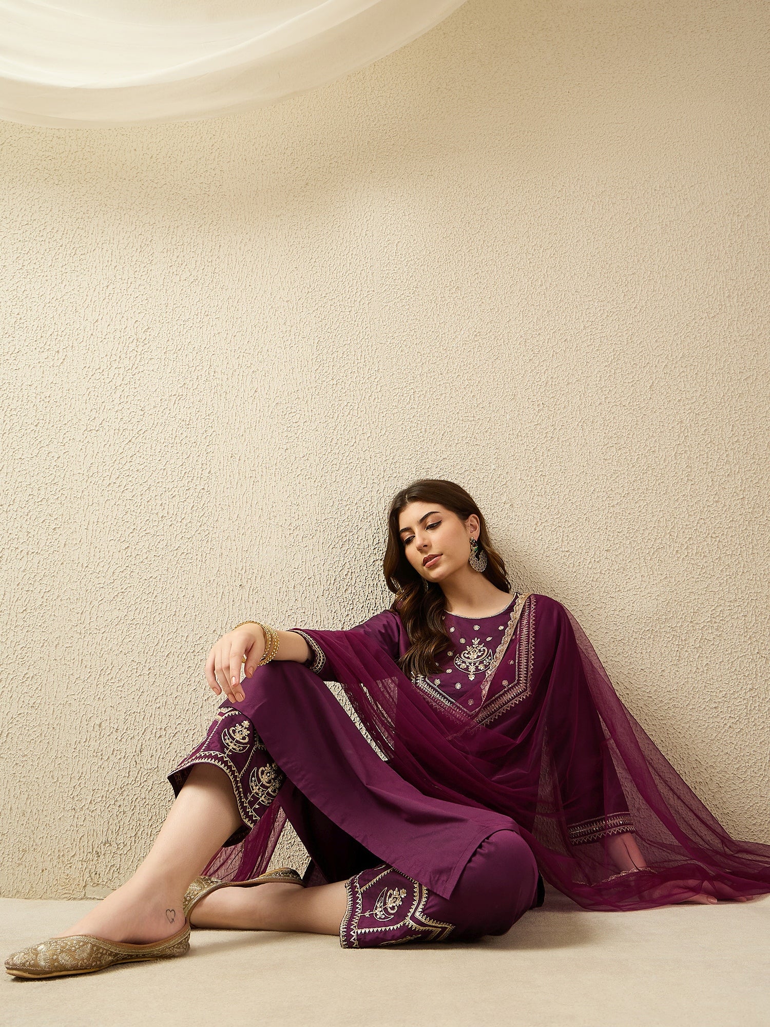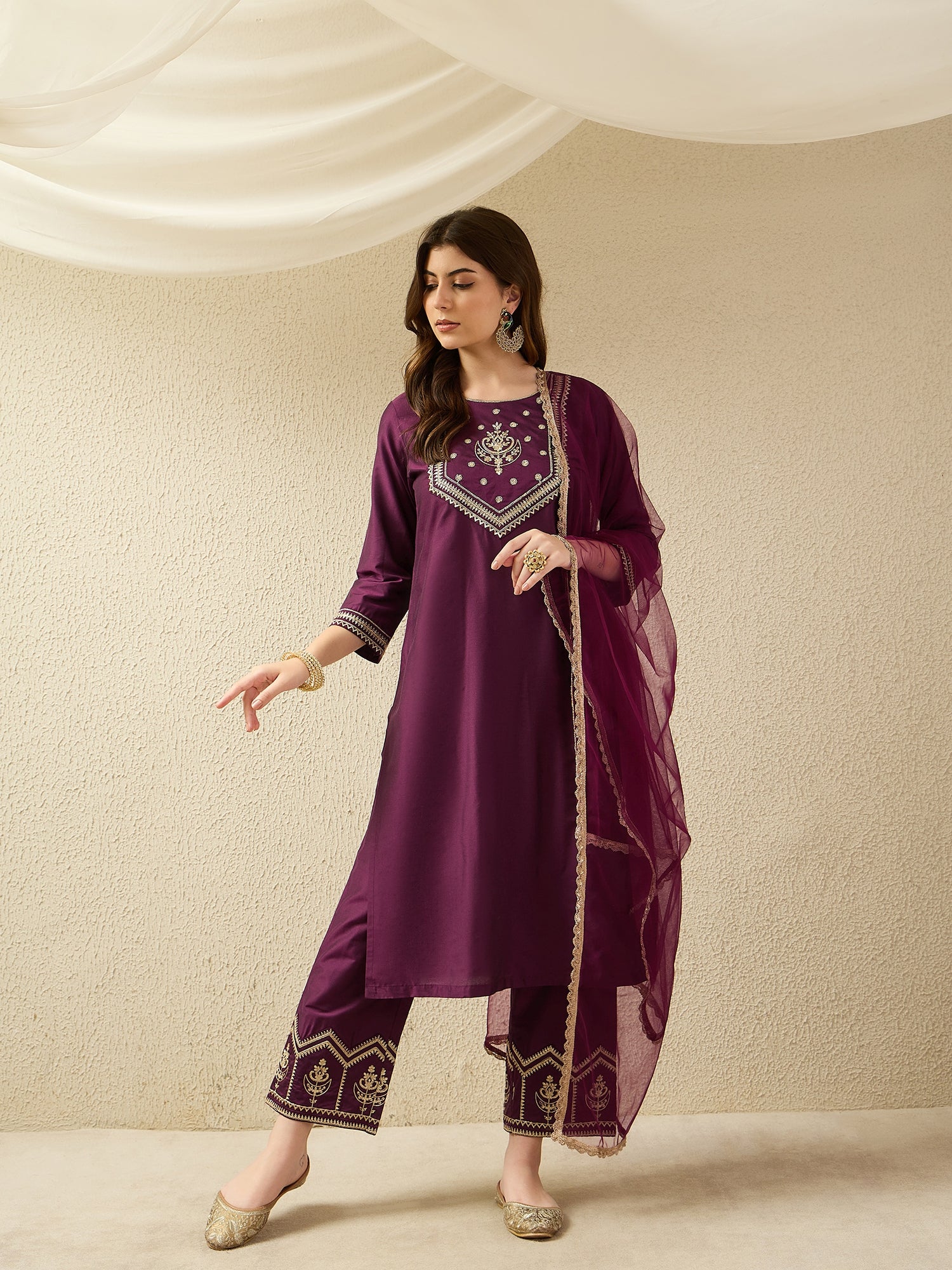 Bottom Wear: Matching trousers featuring ornate embroidered hem detailing