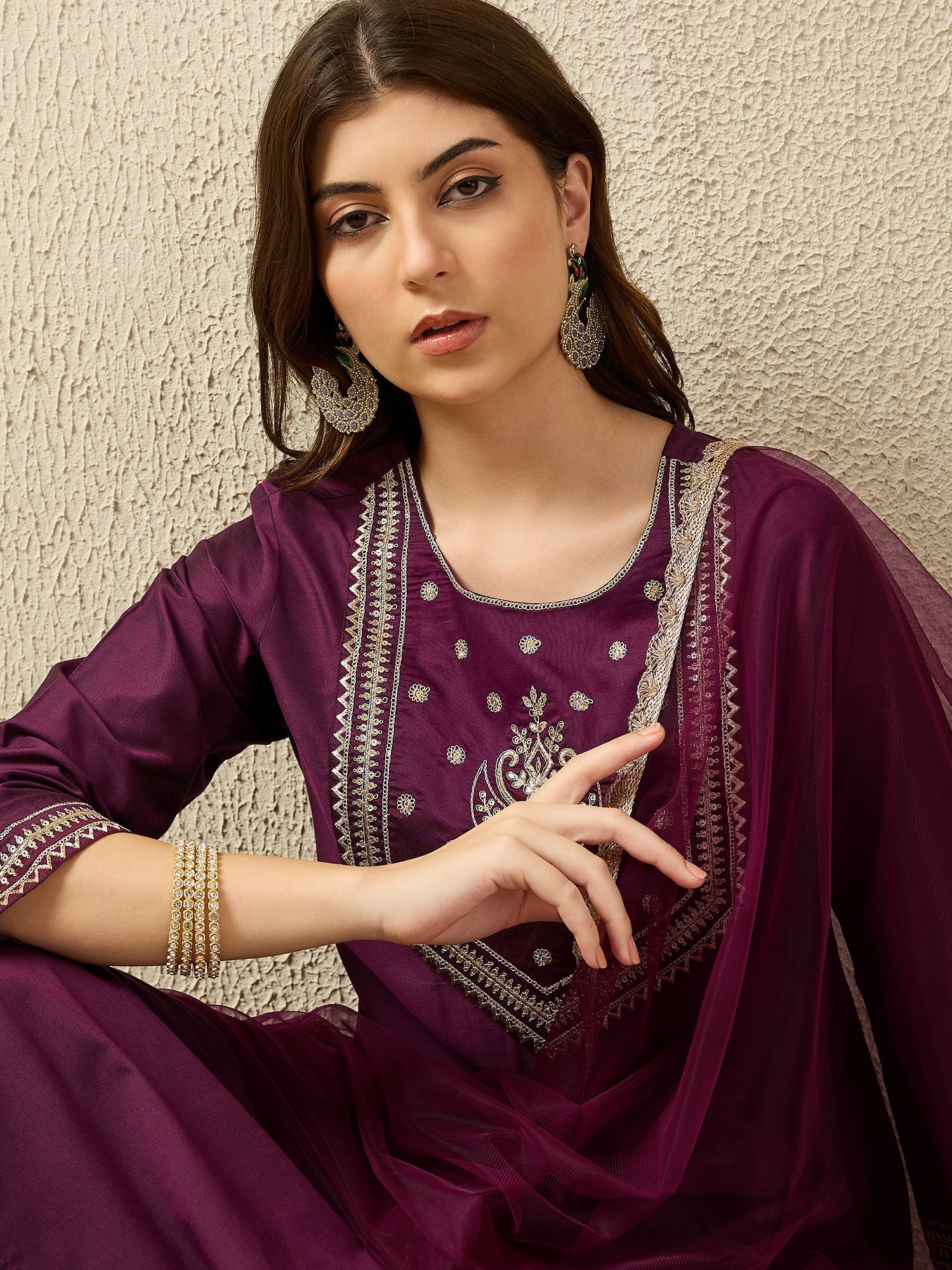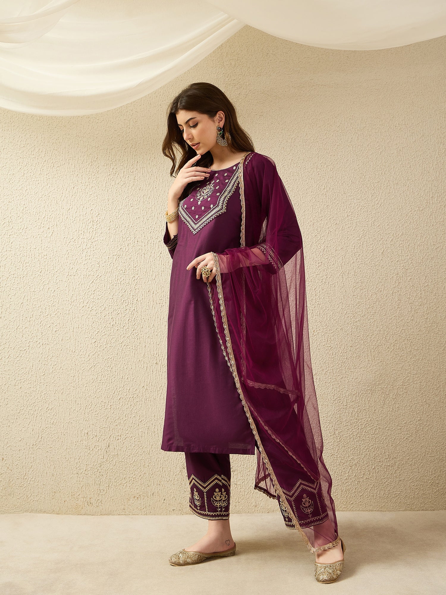 Indulge in refined elegance with this stunning wine embroidered three-piece suit set, designed to bring a luxurious touch to your ethnic wardrobe. The deep wine shade exudes richness and sophistication, beautifully enhanced by intricate embroidery on the neckline and trouser hems. The straight-cut kurta offers a graceful and flattering silhouette, paired with coordinated embroidered trousers and a soft, sheer dupatta finished with delicate borders. Perfect for festive occasions, formal evenings, and celebratory gatherings, this ensemble delivers timeless charm with modern elegance.