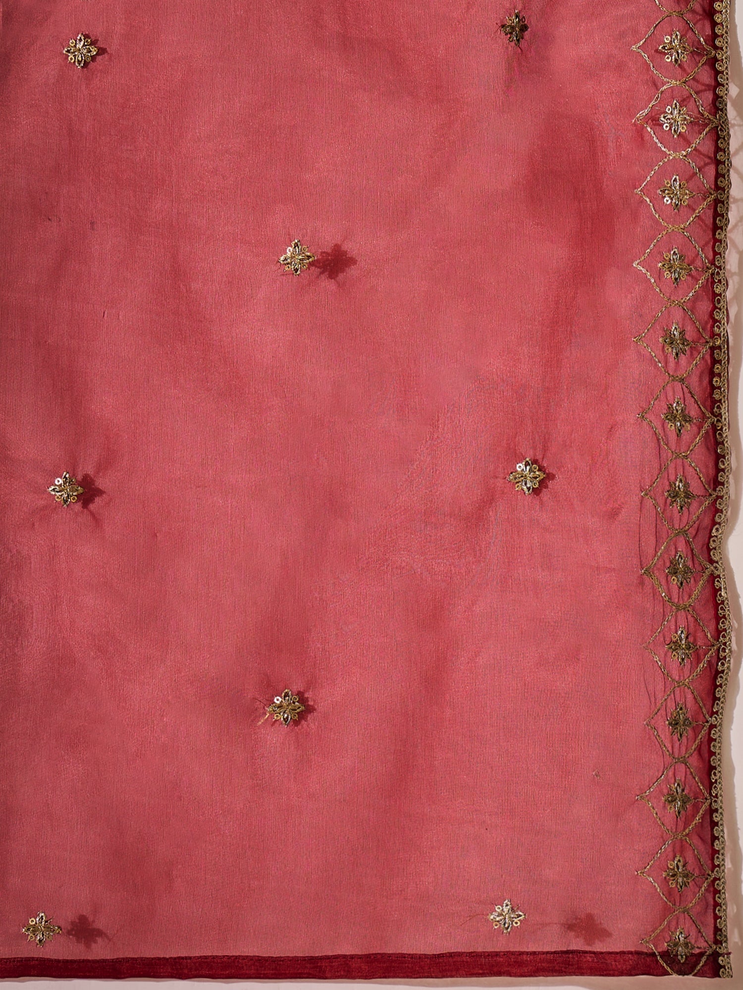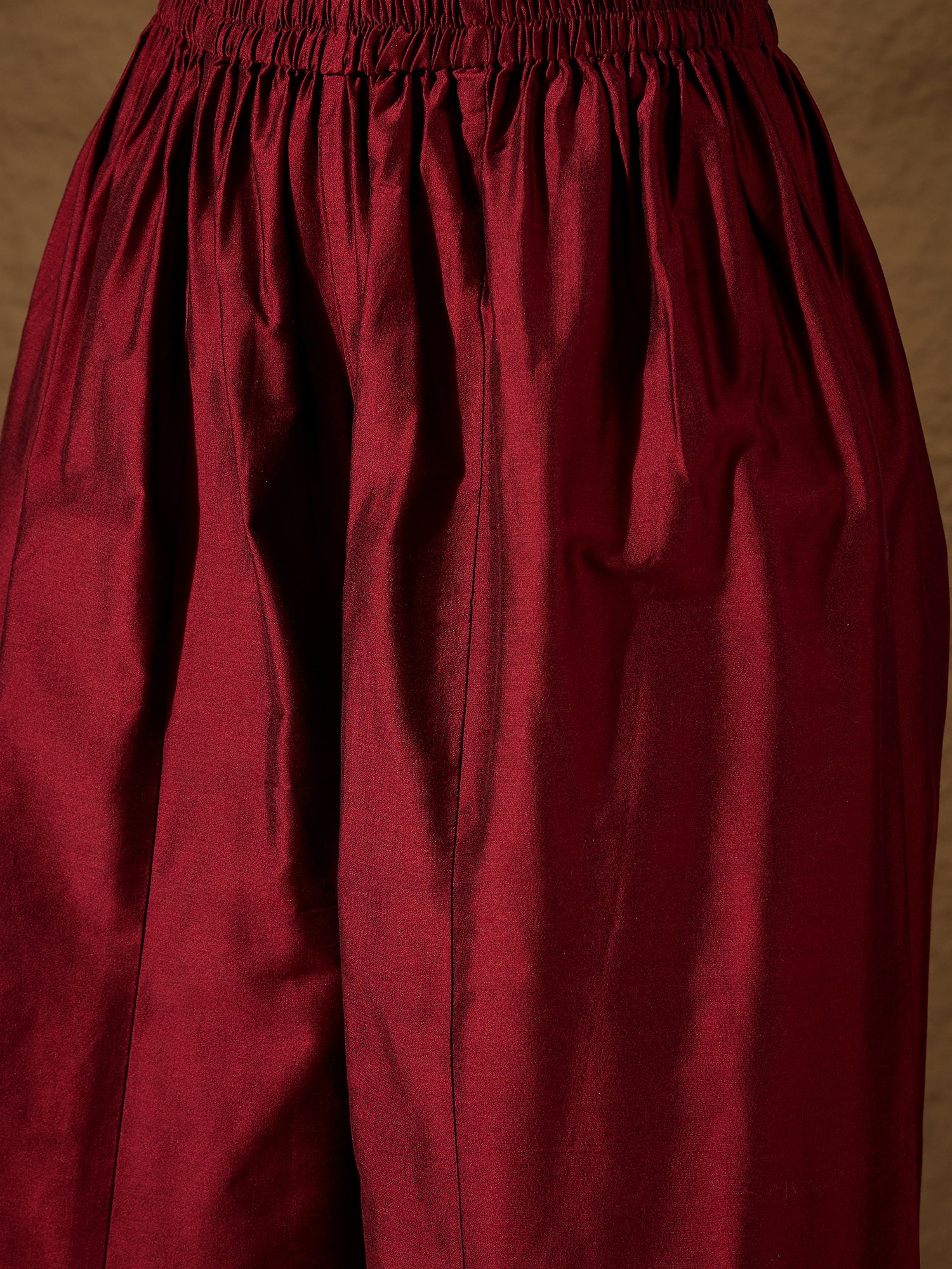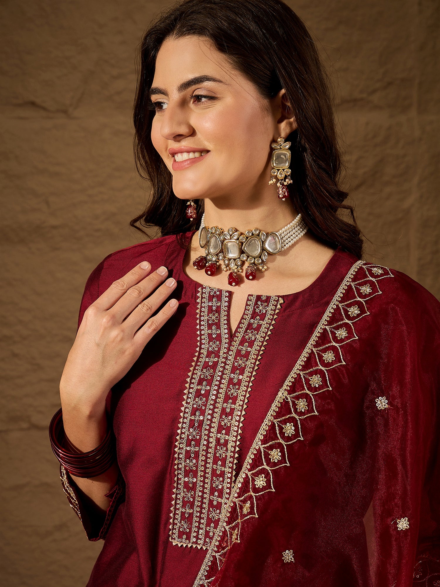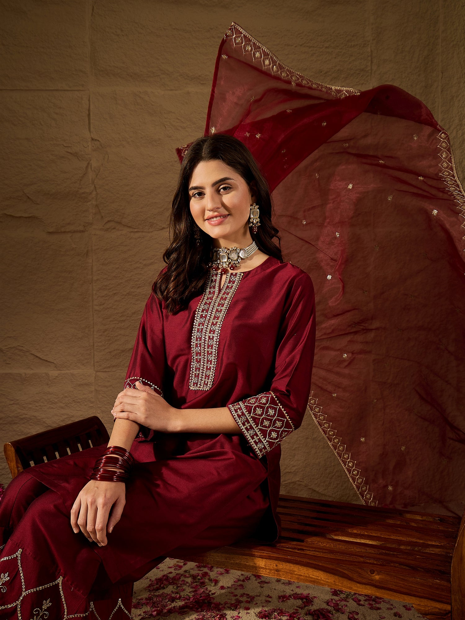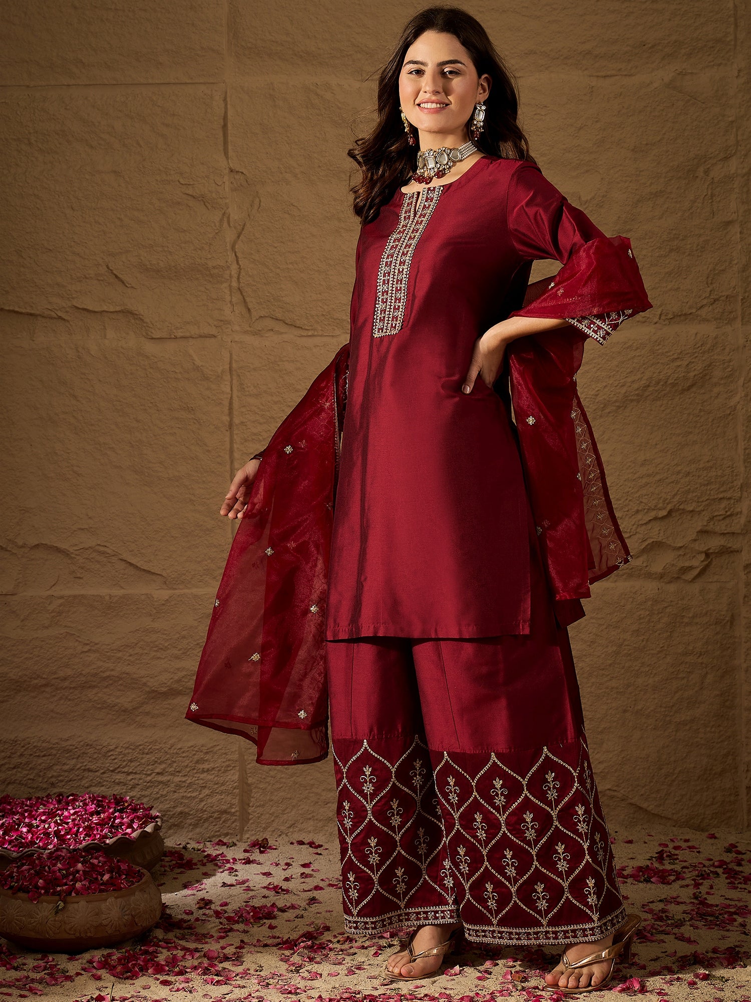 This elegant Maroon kurta set is designed for festive charm and sophistication. The kurta features geometric-inspired zari embroidery along the neckline, sleeve borders, and dupatta edges, giving it a regal appeal. Paired with embroidered palazzo pants and a sheer organza dupatta, this set combines comfort and style, making it perfect for weddings, festivals, and special celebrations.