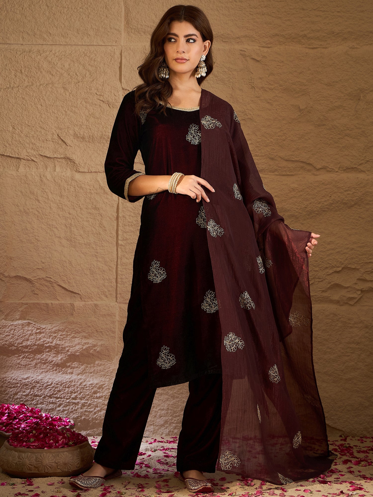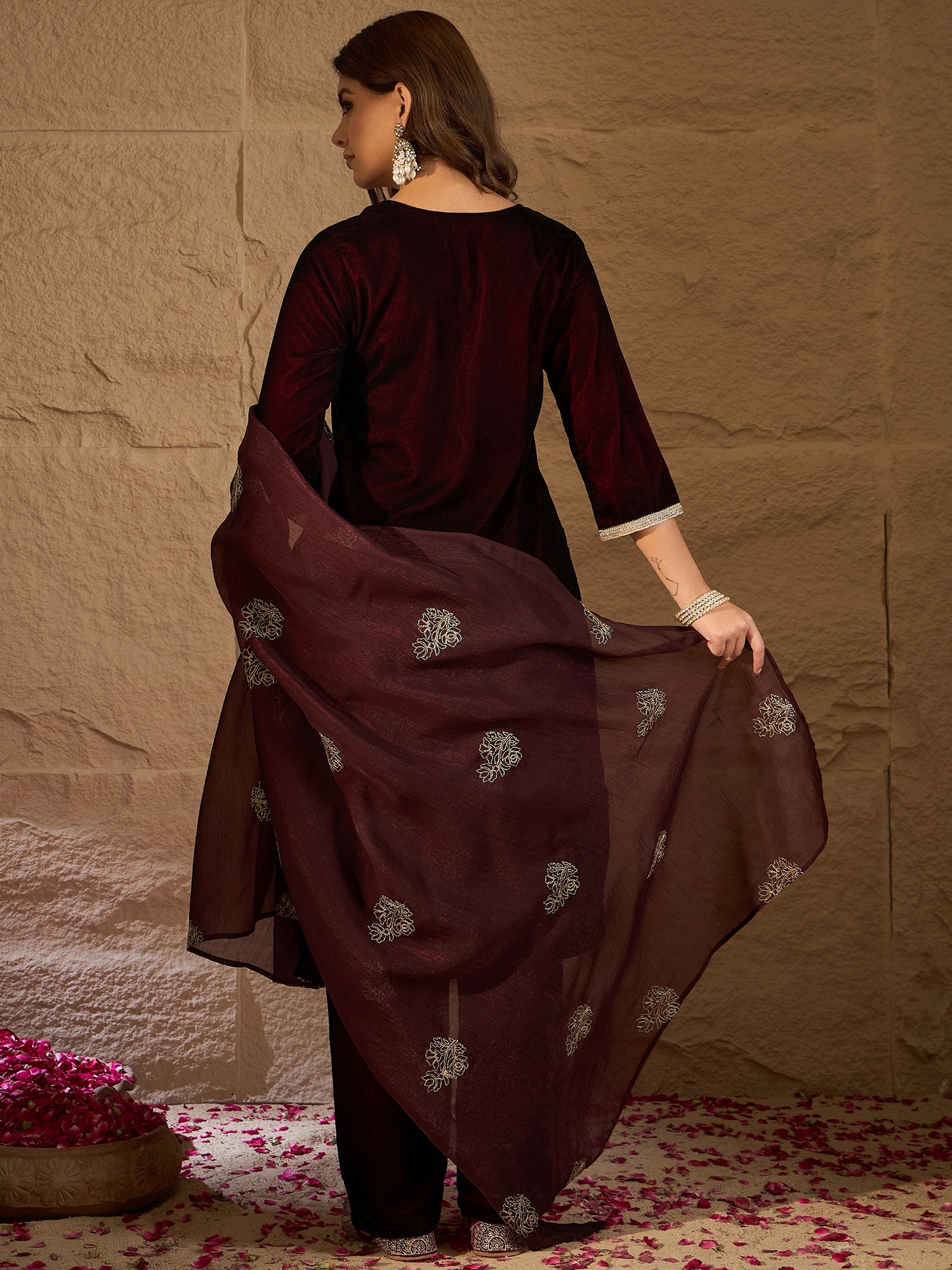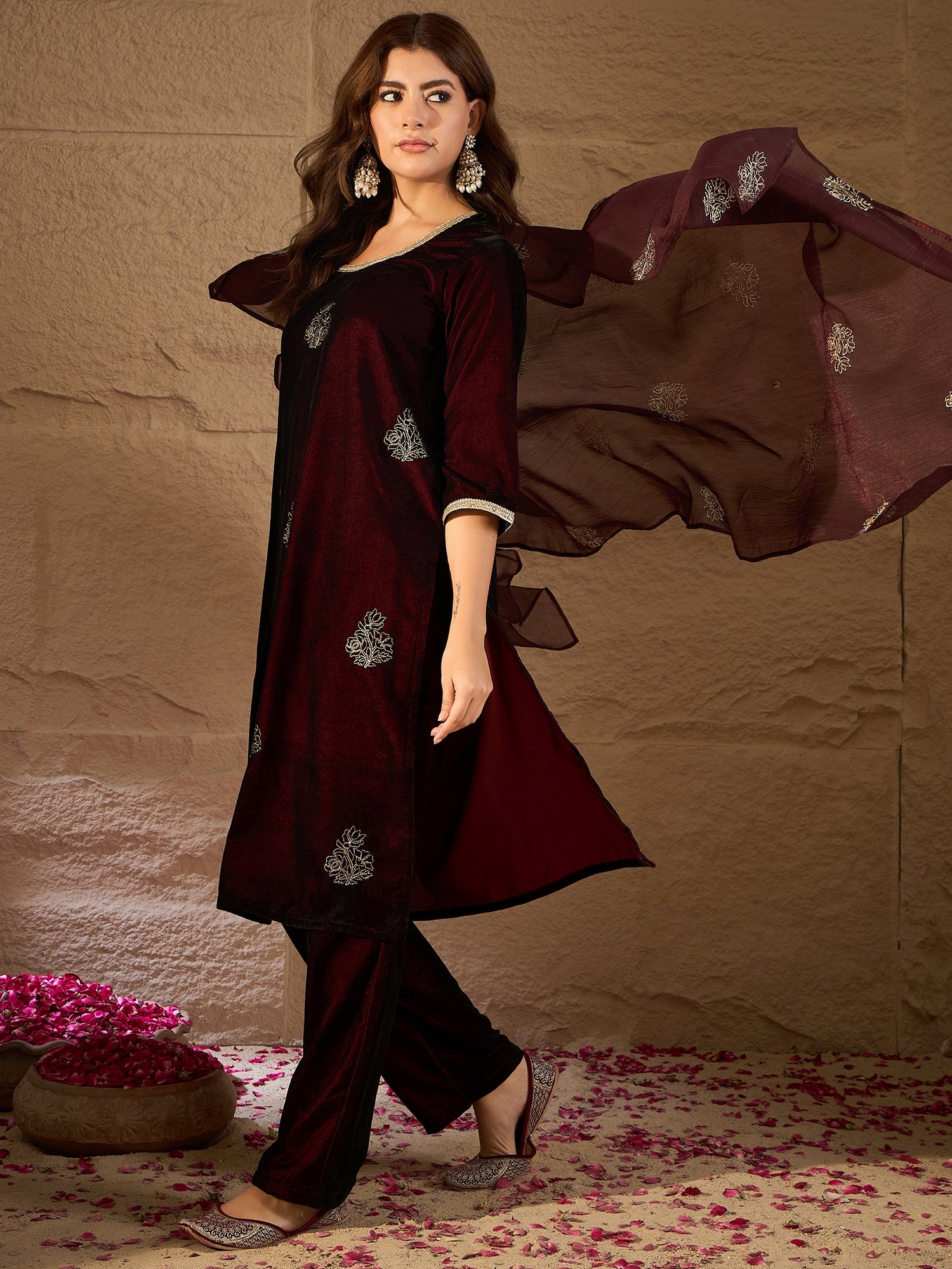 Maroon Velvet Embroidered Kurta, Pant and Dupatta Set