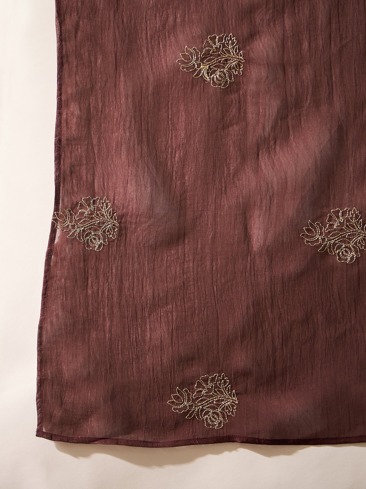 This elegant maroon suit set is crafted from rich velvet fabric, offering a luxurious sheen and a festive appeal. The kurta is adorned with delicately placed zari-embroidered floral motifs that add a subtle yet sophisticated charm. Paired with matching straight-fit pants and a lightweight, flowy dupatta featuring coordinating embroidery, the ensemble is perfect for festive celebrations, evening gatherings, and wedding functions. The deep maroon tone complements a wide range of accessories and suits all skin tones beautifully.