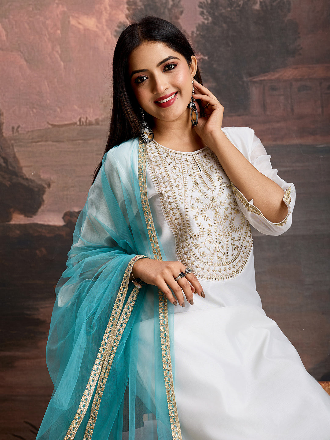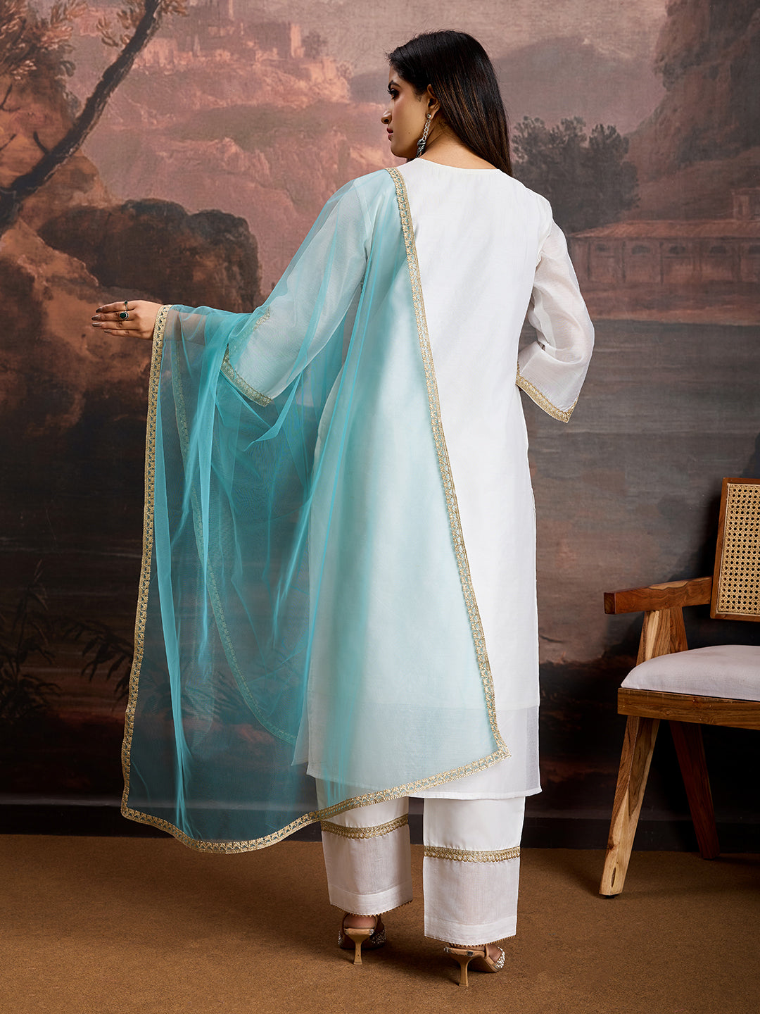 This exquisite Chanderi Cotton Silk Kurta Set is a perfect blend of elegance and comfort, ideal for festive occasions, celebrations, and ethnic gatherings. The kurta, crafted from luxurious Chanderi Cotton Silk, features intricate embroidery and a classic round neckline that enhances its traditional appeal. It is paired with silk crepe pants, offering a sleek and structured fit, while the net dupatta with a delicate lace border adds a touch of grace and sophistication.