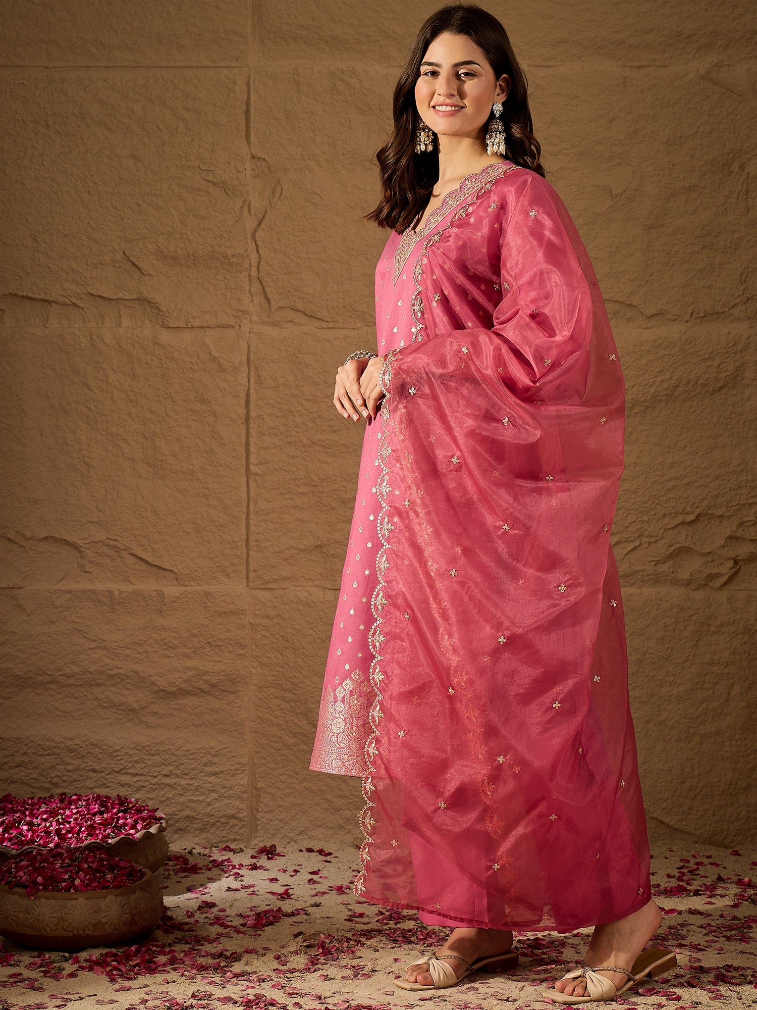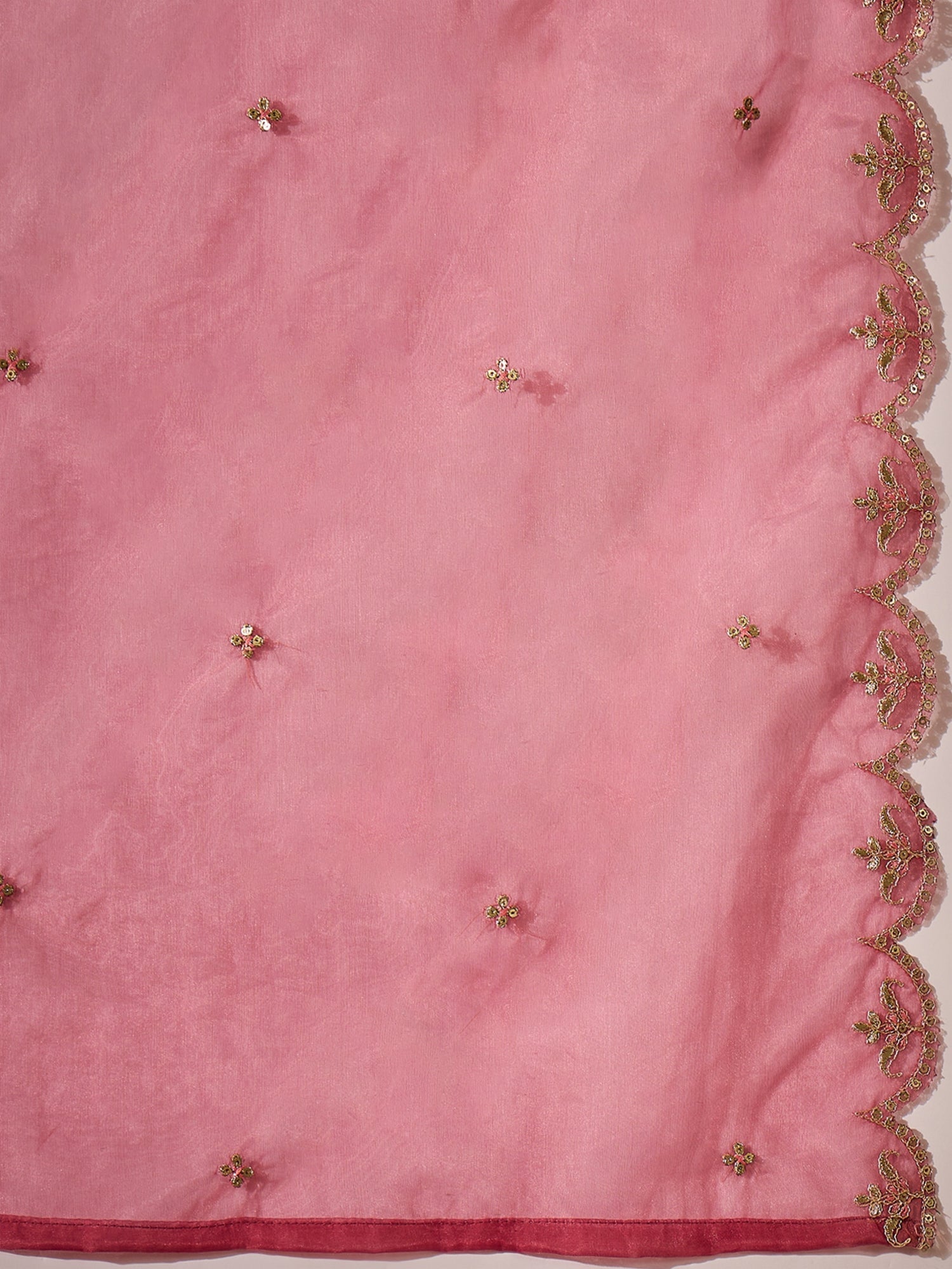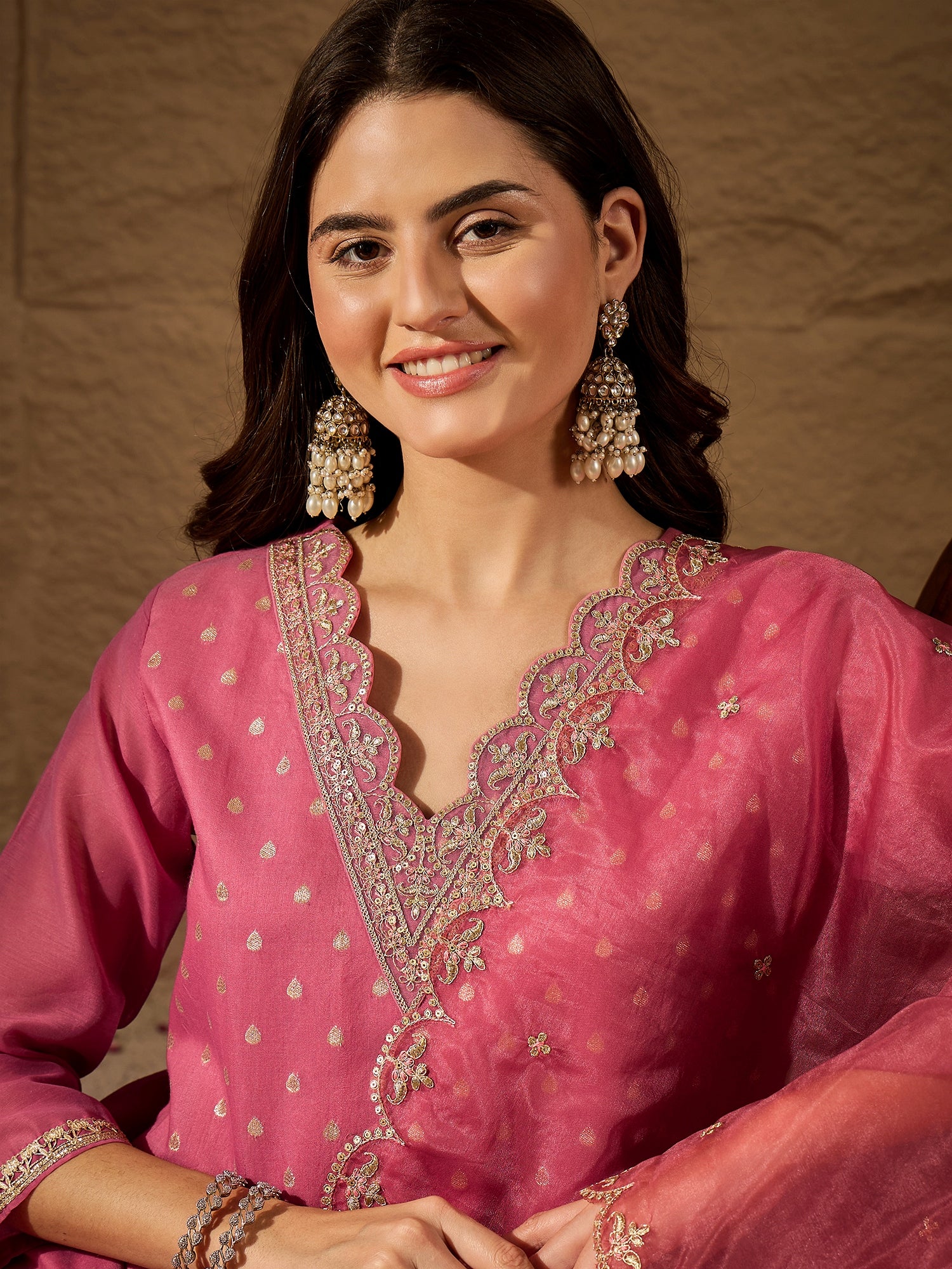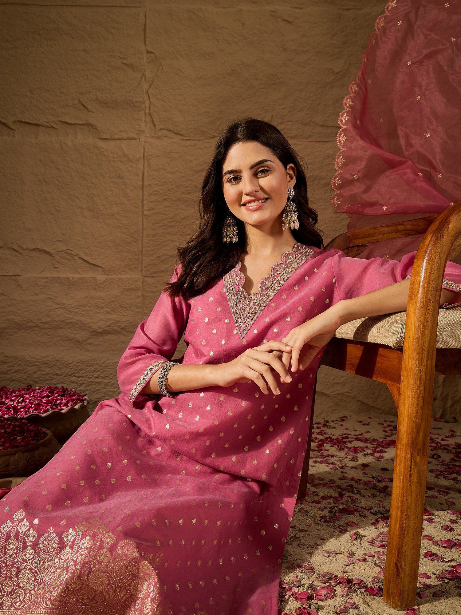 Rose Pink Embroidered Kurta Set with Sheer Dupatta