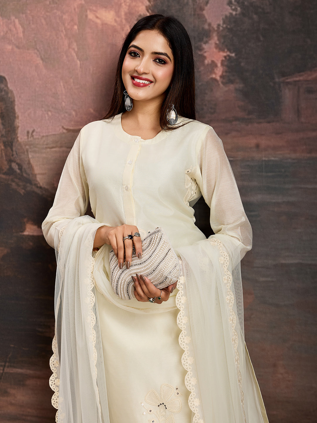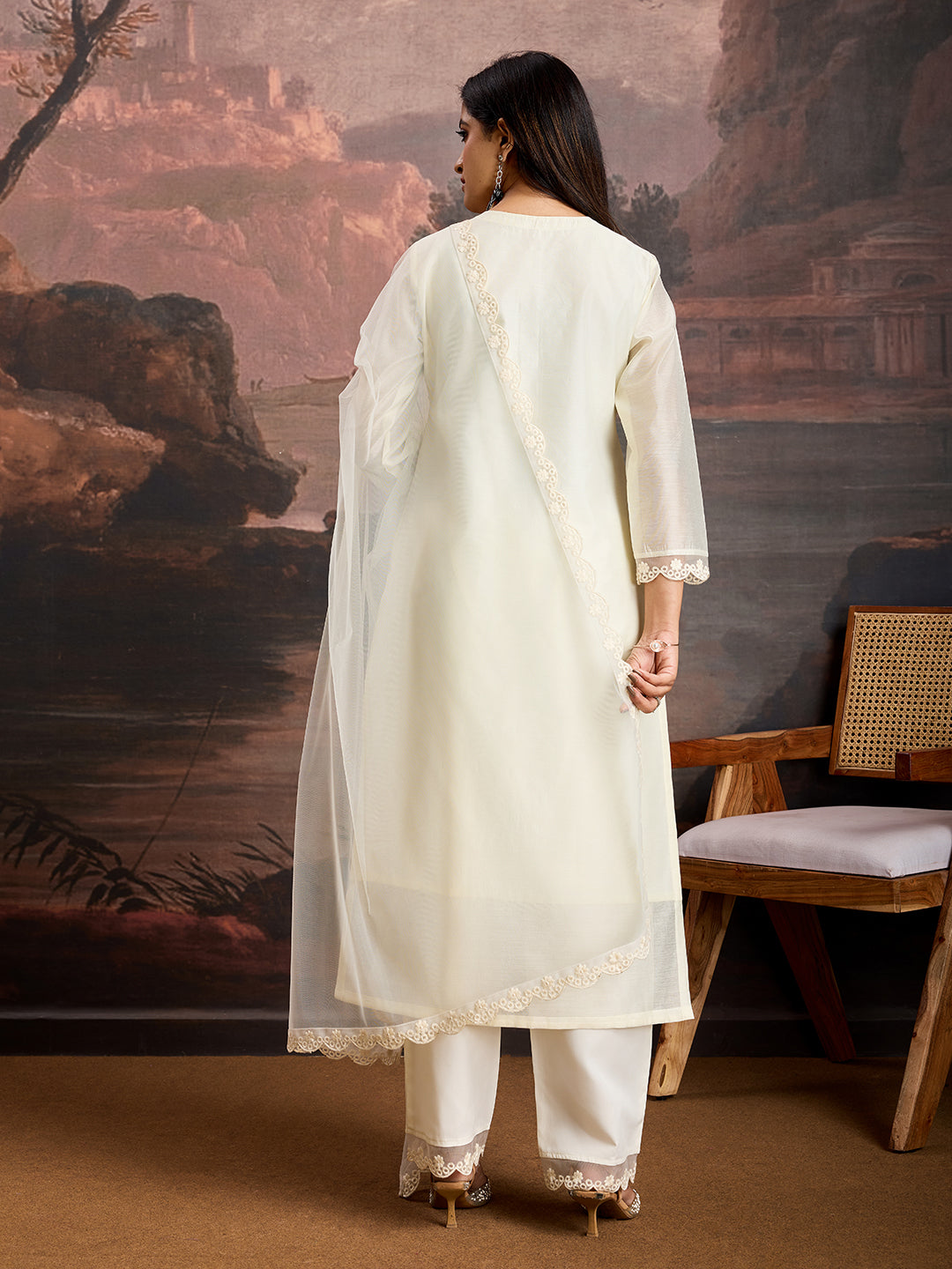 This elegant Chanderi Cotton Silk Kurta Set is a perfect fusion of traditional craftsmanship and contemporary style. The round-neck kurta, crafted from premium Chanderi Cotton Silk, features intricate butta embroidery work, adding a timeless charm. It is paired with silk crepe pants, known for their smooth texture and graceful drape, ensuring both comfort and sophistication. Completing the ensemble is a net dupatta with a delicate lace border, enhancing its regal appeal. Ideal for festive occasions, weddings, and celebratory gatherings, this outfit exudes effortless grace and elegance.