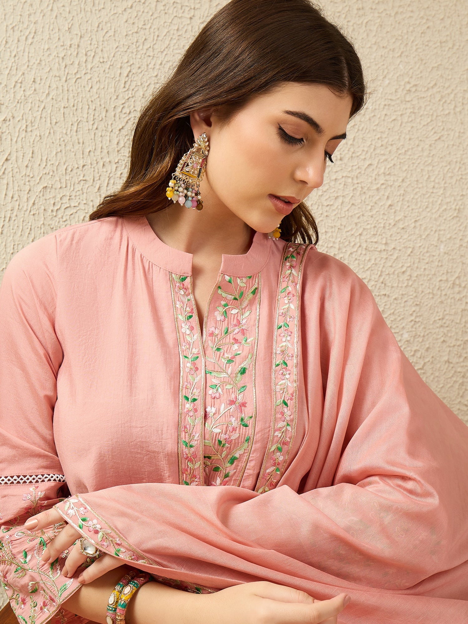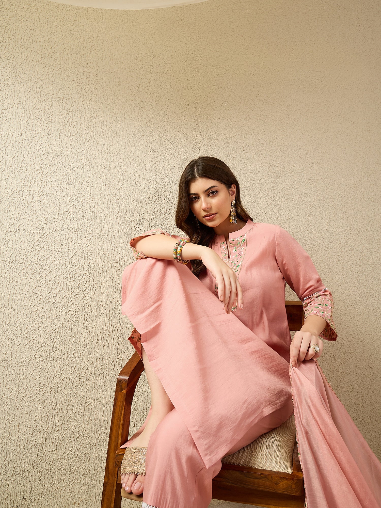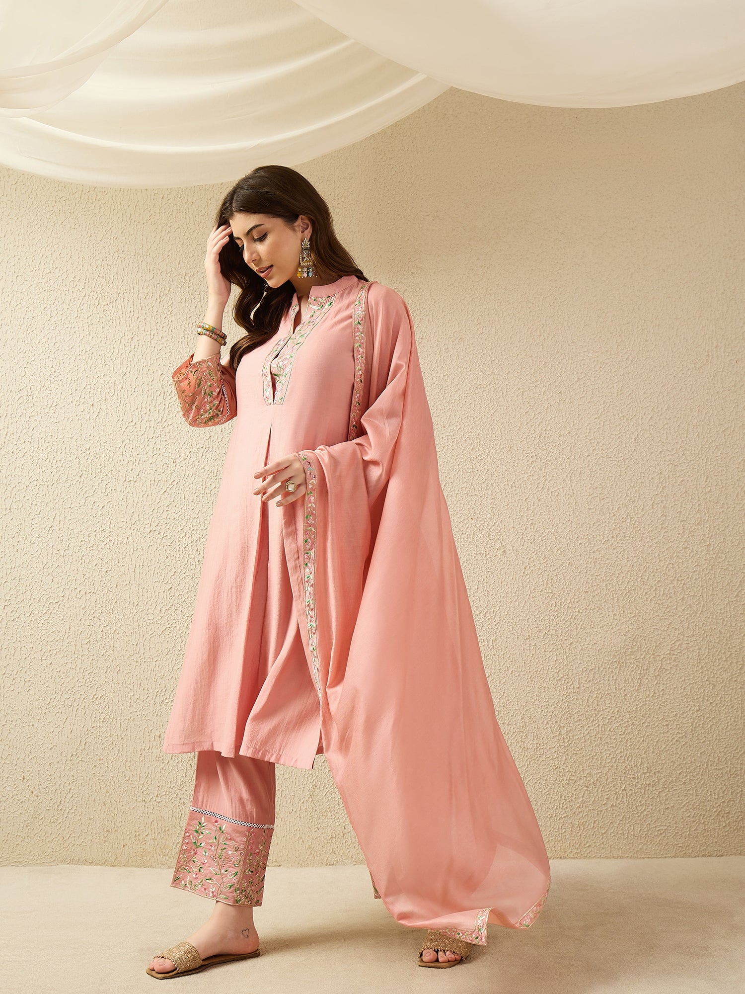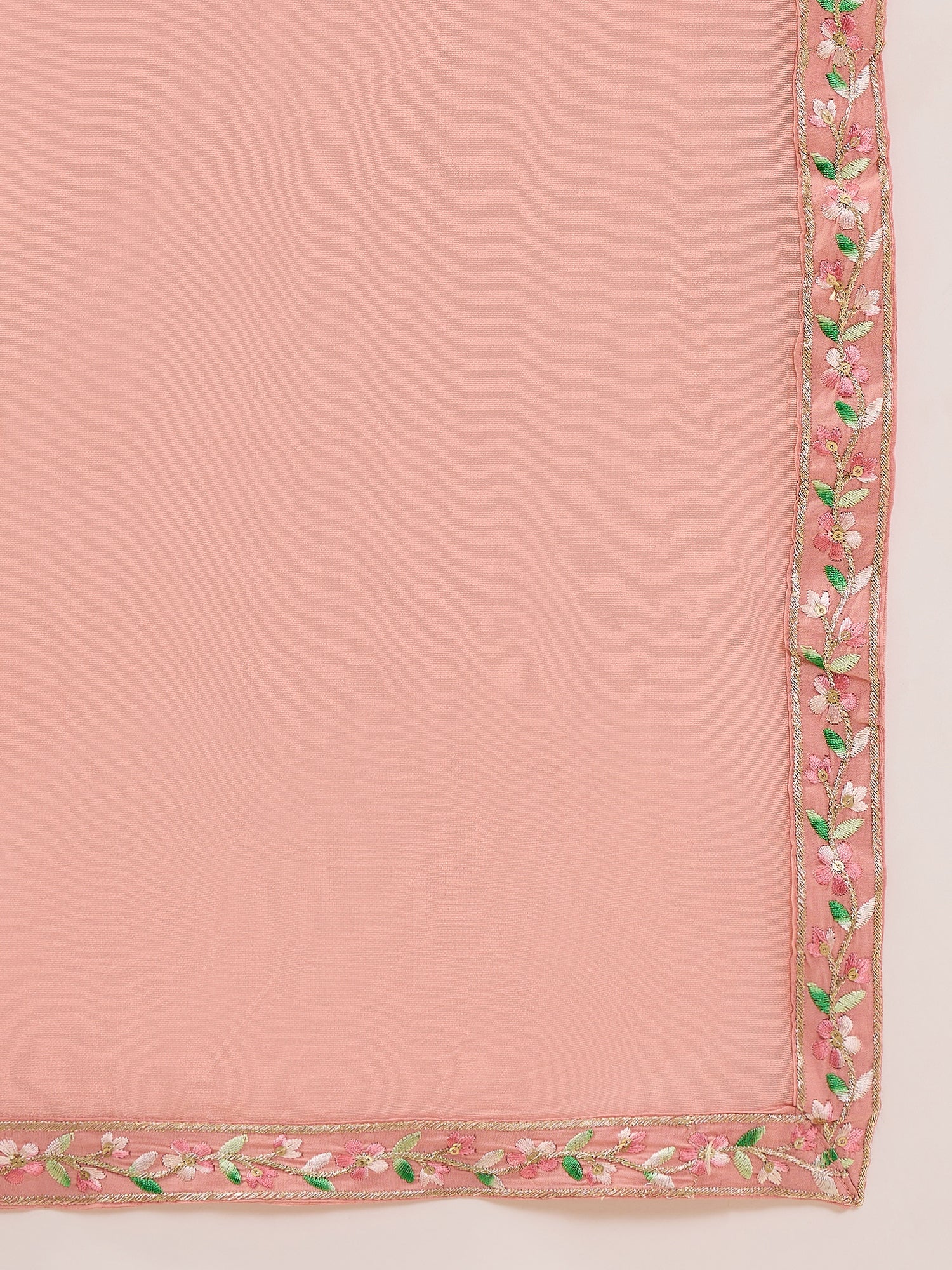 Add a soft pop of colour to your ethnic collection with this elegant peach kurta pant set. The straight-fit kurta is beautifully enhanced with delicate floral embroidery on the neckline and sleeves, creating a graceful and feminine appeal. It is paired with matching straight pants featuring embroidered hems and a sheer, flowy dupatta adorned with an embroidered border. Crafted from lightweight, breathable fabric, this ensemble offers superior comfort and an effortless drape. Perfect for festive occasions, daytime functions, casual outings, and office wear, this suit set reflects timeless charm and modern sophistication.