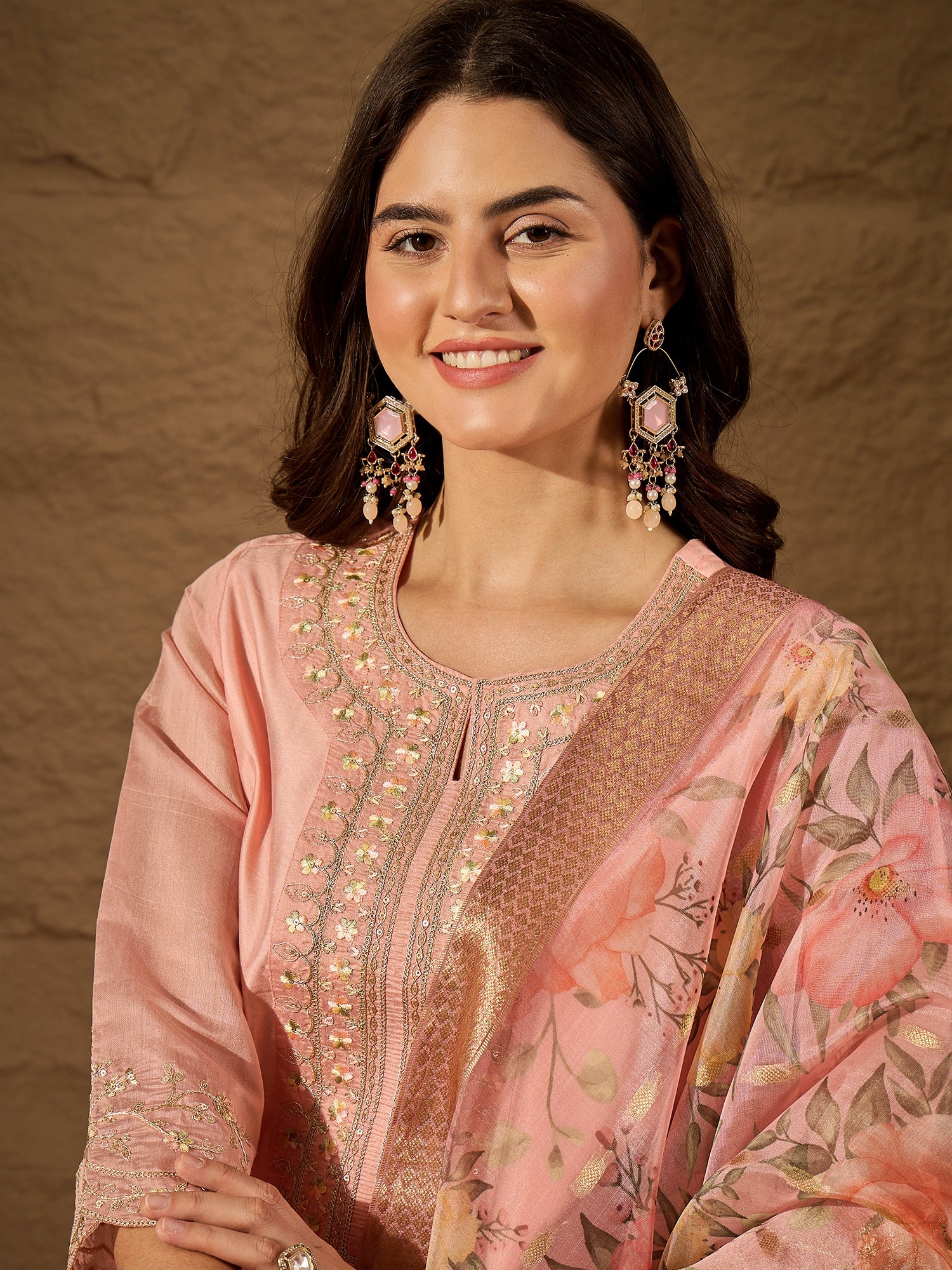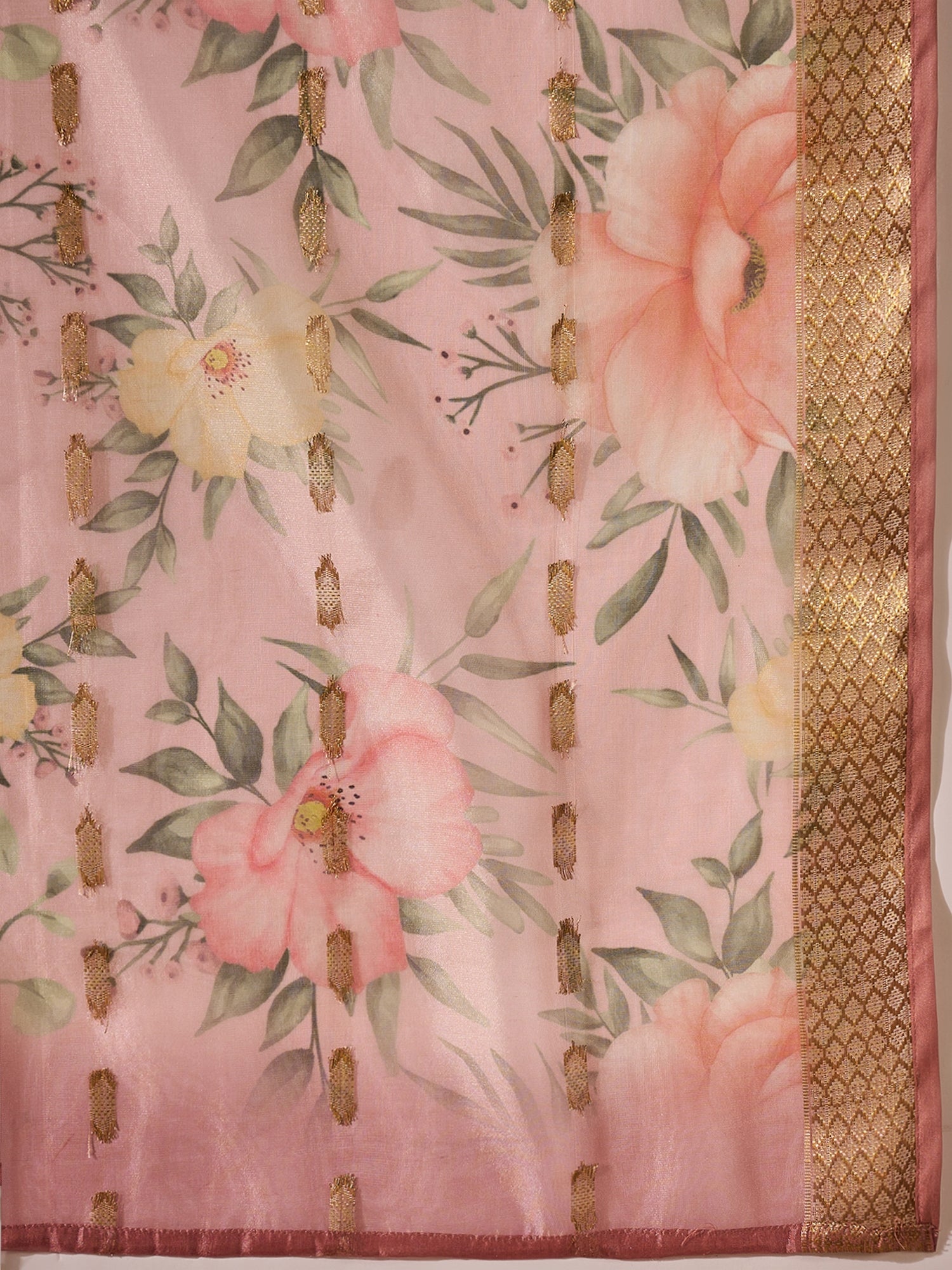 Peach Embroidered Kurta Set with Floral Organza Dupatta