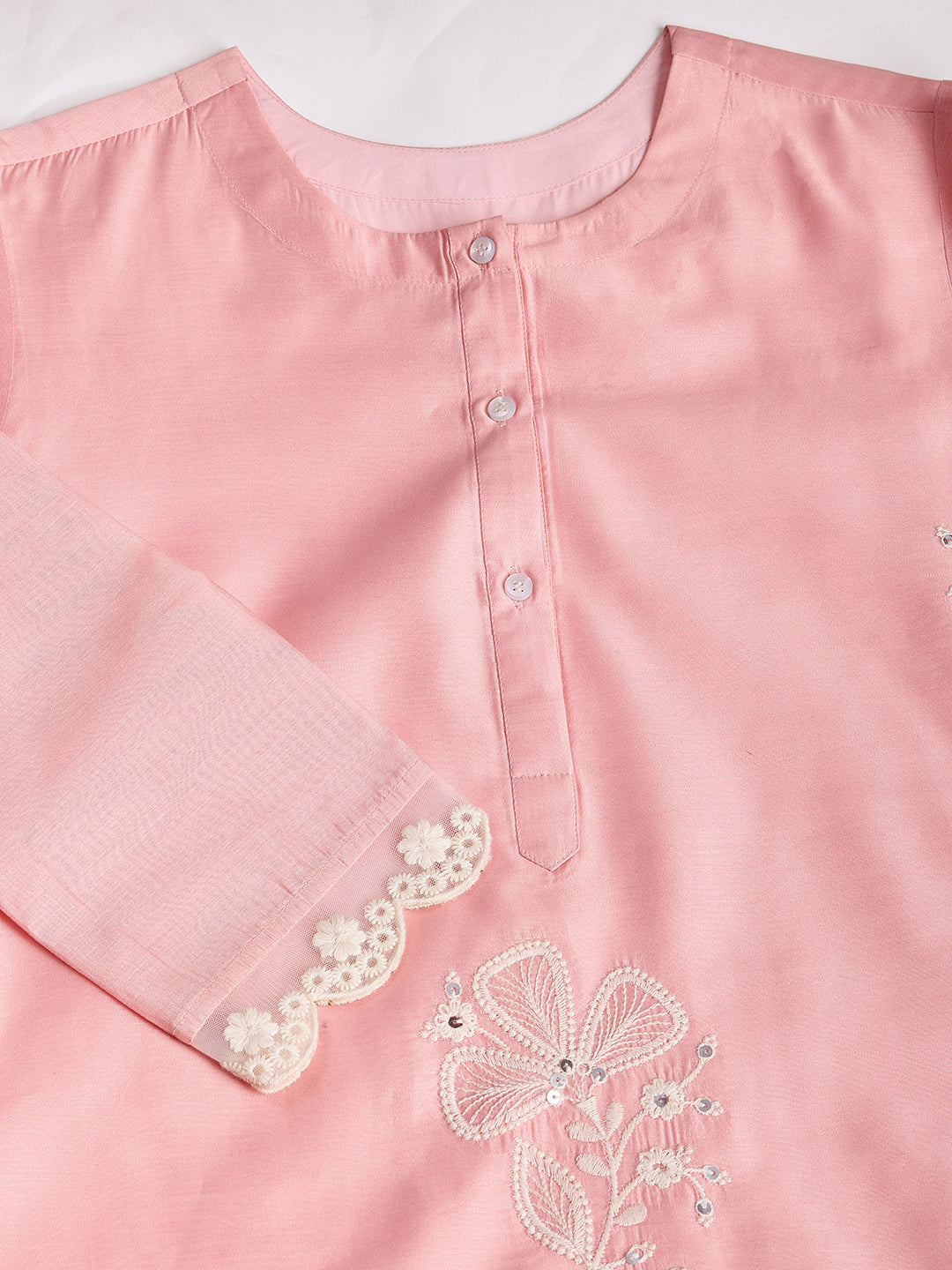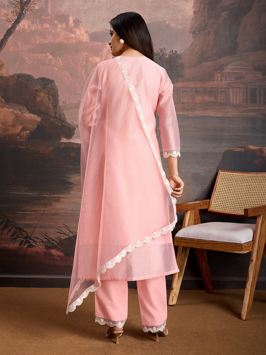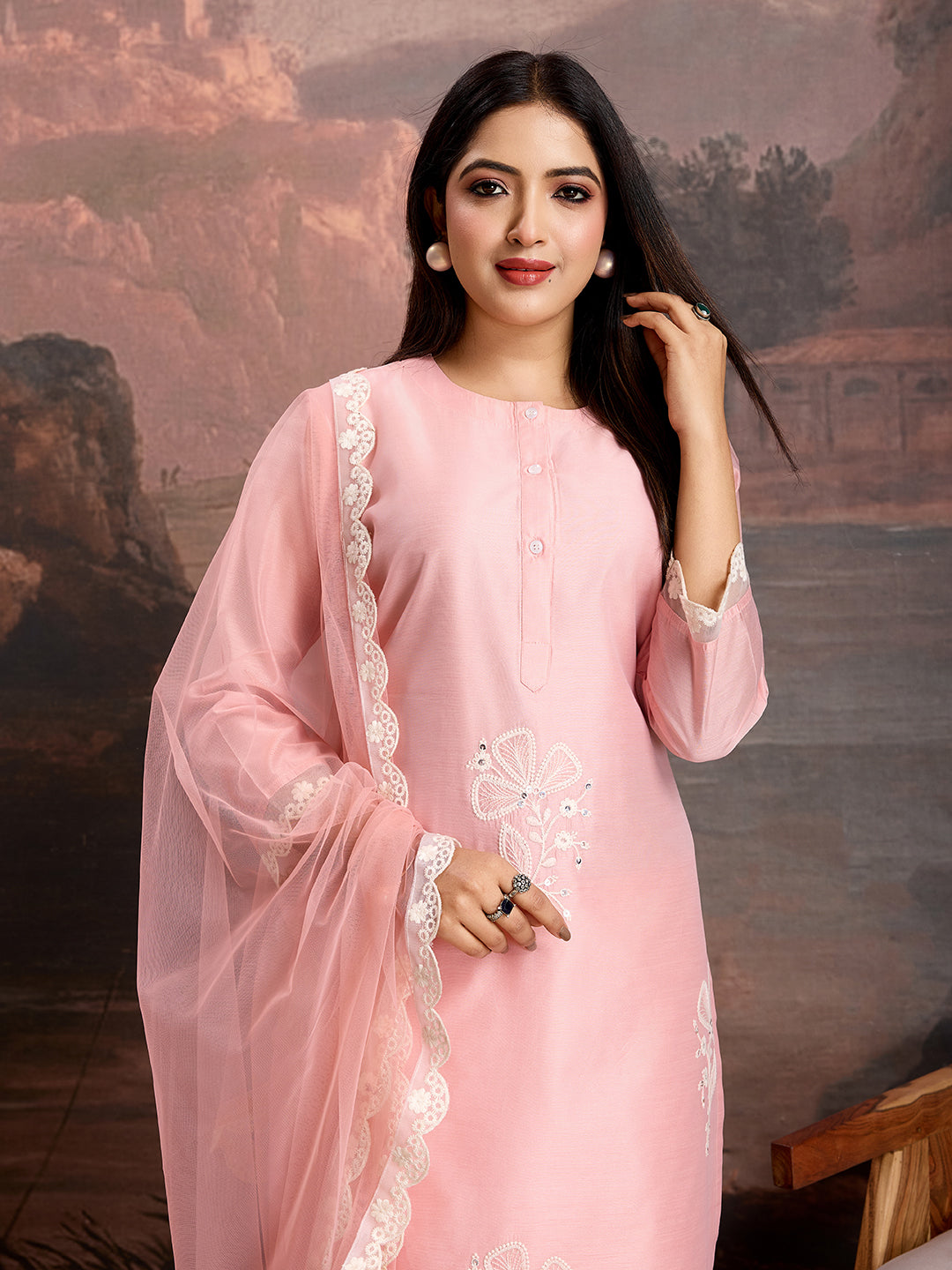 This elegant Chanderi Cotton Silk Kurta Set is a perfect fusion of traditional craftsmanship and contemporary style. The round-neck kurta, crafted from premium Chanderi Cotton Silk, features intricate butta embroidery work, adding a timeless charm. It is paired with silk crepe pants, known for their smooth texture and graceful drape, ensuring both comfort and sophistication. Completing the ensemble is a net dupatta with a delicate lace border, enhancing its regal appeal. Ideal for festive occasions, weddings, and celebratory gatherings, this outfit exudes effortless grace and elegance.