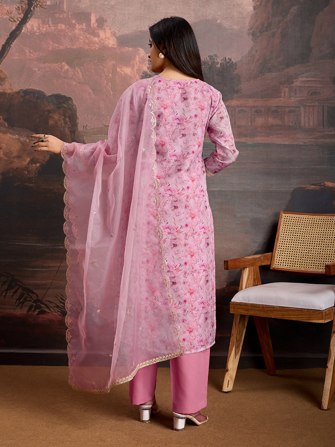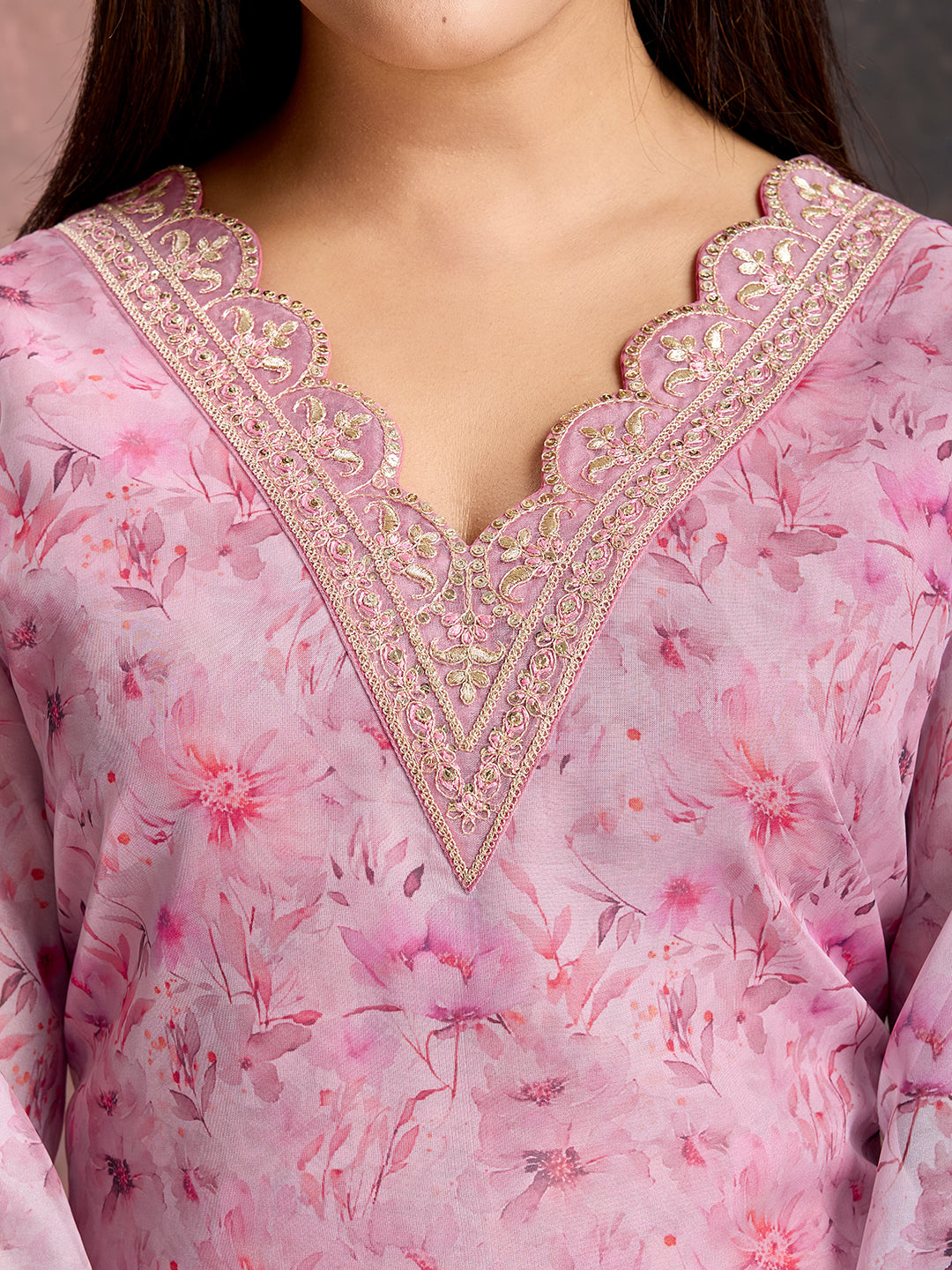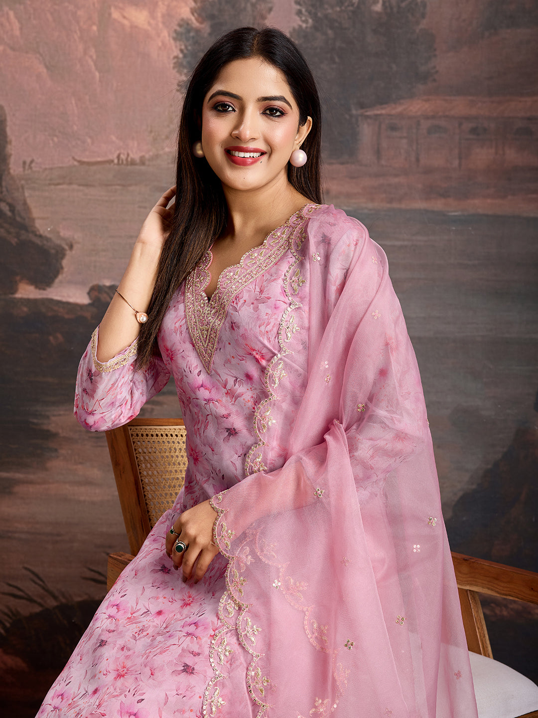 This exquisite Organza Floral Printed Kurta Set is a perfect blend of elegance and contemporary charm. The kurta, crafted from lightweight organza fabric, features beautiful floral prints, giving it a delicate and feminine touch. Paired with luxurious silk crepe pants for a smooth and flattering fit, this outfit is both stylish and comfortable. The ensemble is completed with an embroidered net dupatta, adding a touch of sophistication and grace. Perfect for festive occasions, weddings, and special gatherings, this set ensures a timeless, ethereal look.