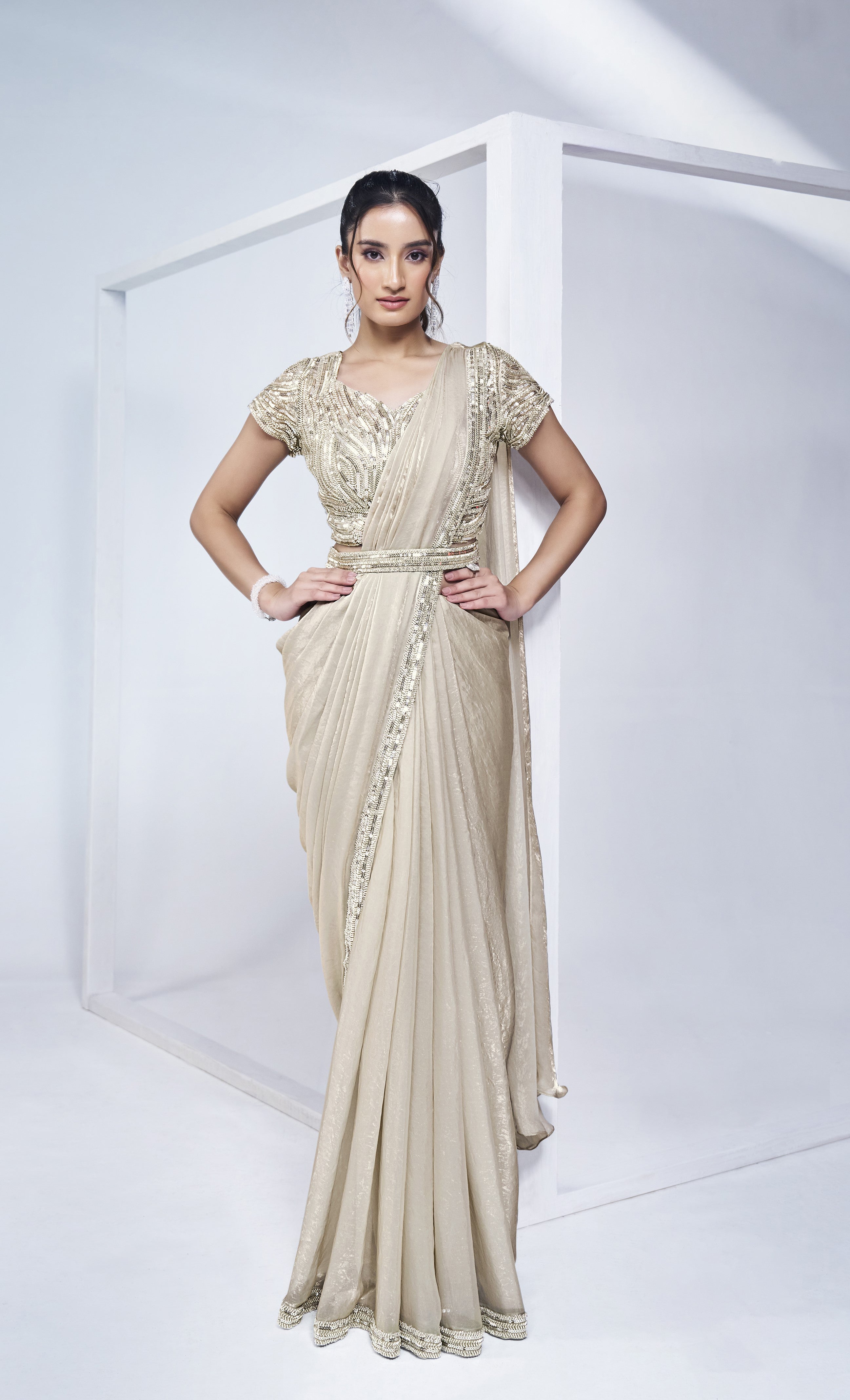 • The saree is pre-stitched into a ready-to-wear format. This means it is already draped with pleats and attached to a pre-stitched blouse, making it quick and easy to wear without the need for any draping skills.