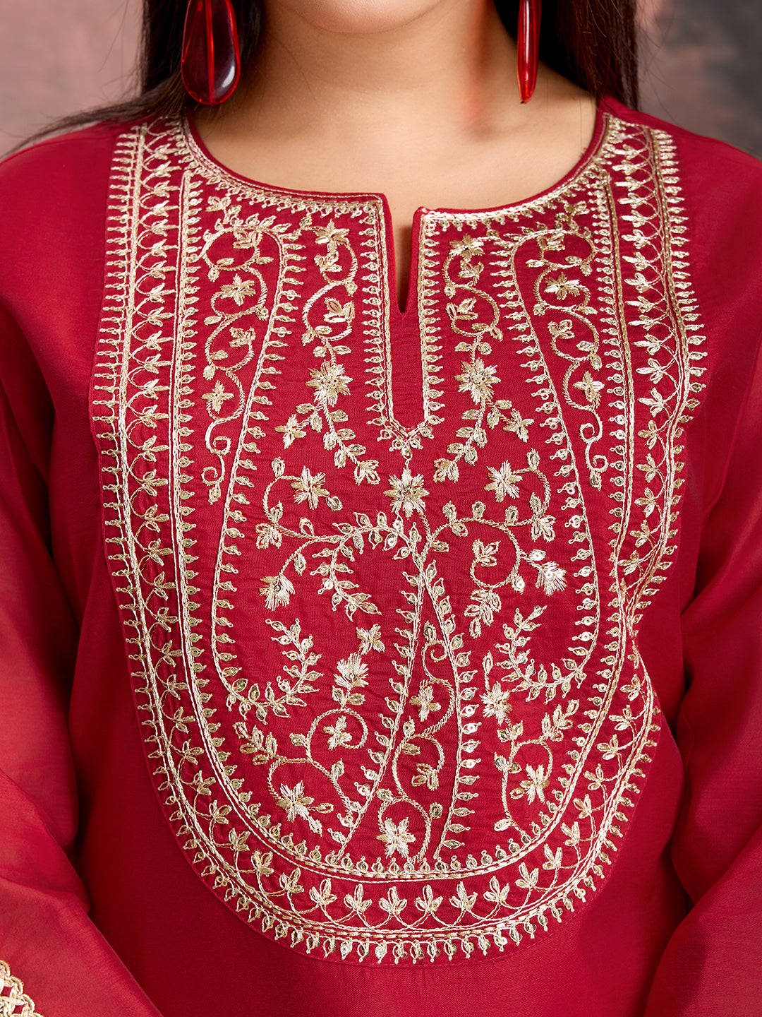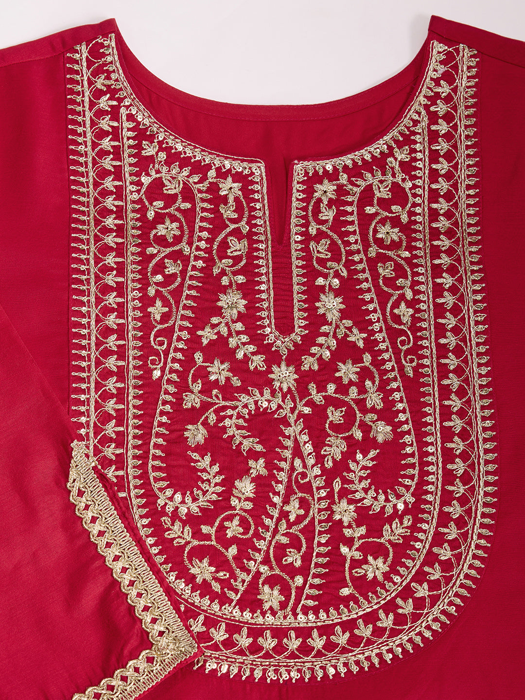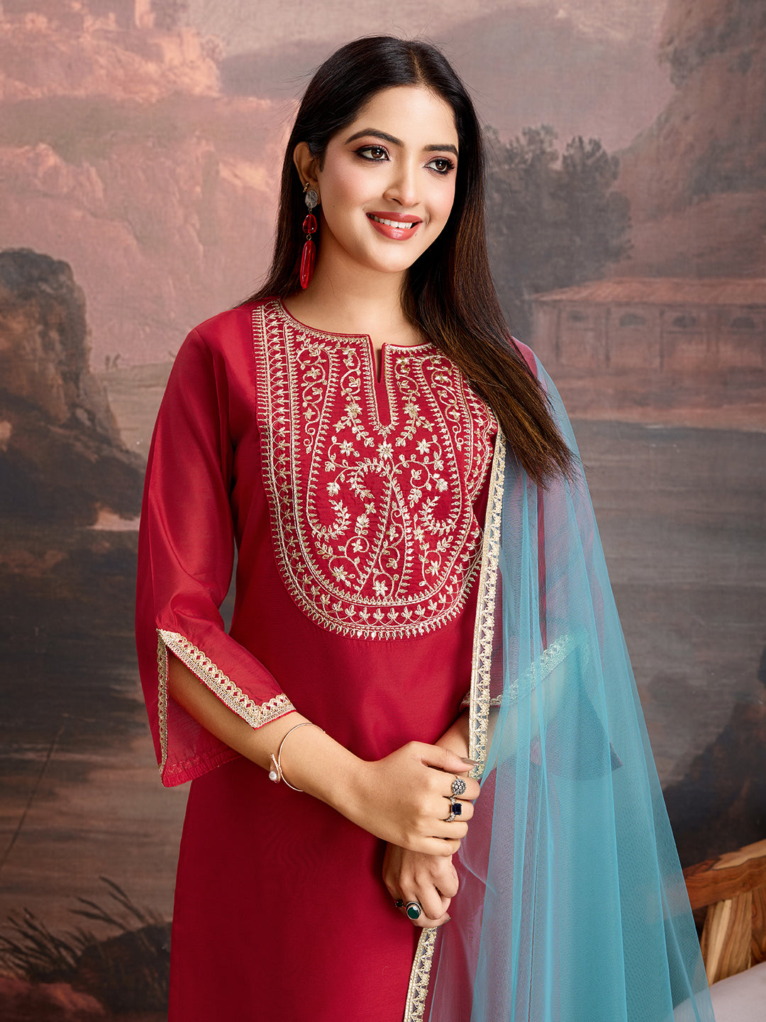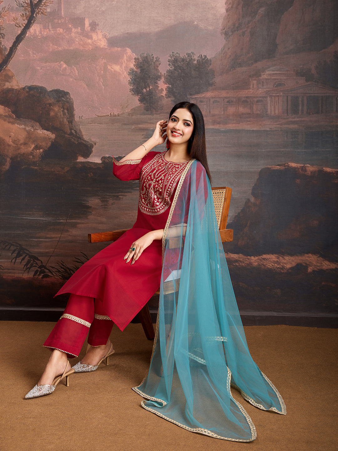 This exquisite Chanderi Cotton Silk Kurta Set is a perfect blend of elegance and comfort, ideal for festive occasions, celebrations, and ethnic gatherings. The kurta, crafted from luxurious Chanderi Cotton Silk, features intricate embroidery and a classic round neckline that enhances its traditional appeal. It is paired with silk crepe pants, offering a sleek and structured fit, while the net dupatta with a delicate lace border adds a touch of grace and sophistication.