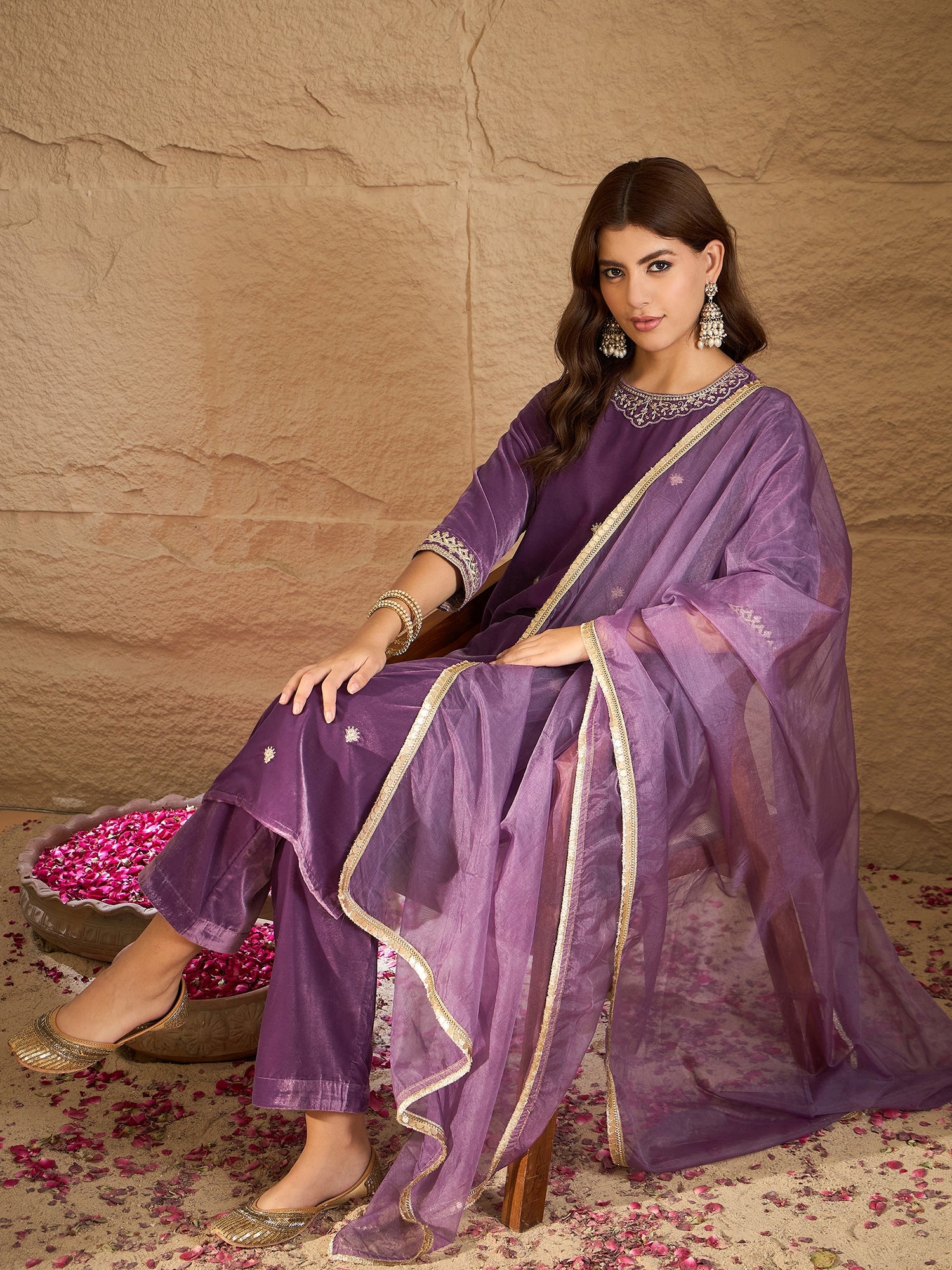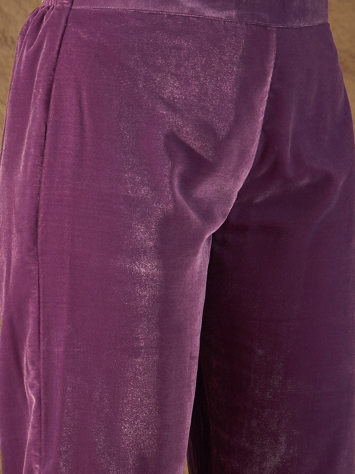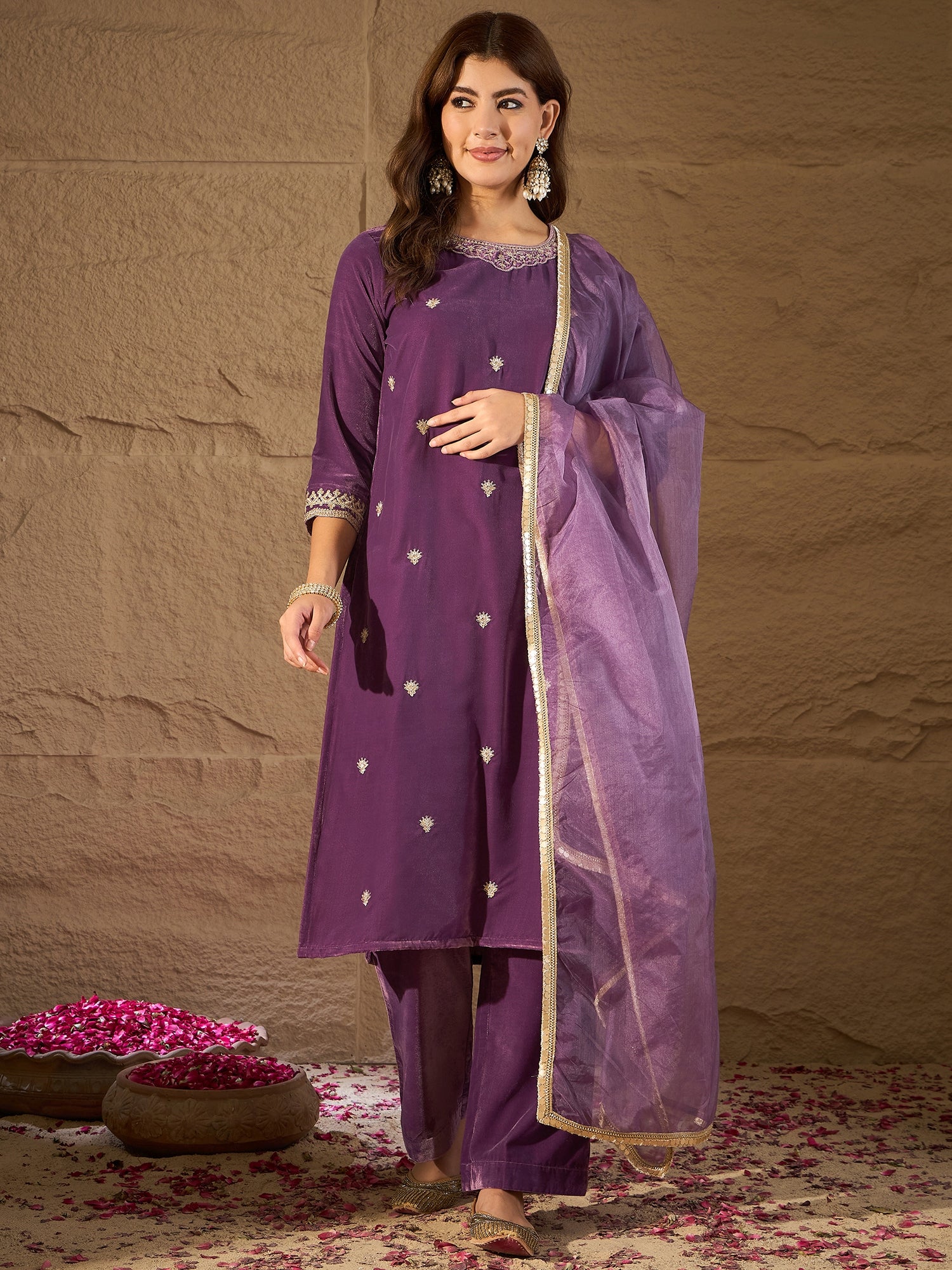 This beautiful purple suit set exudes understated festive charm. Crafted in velvet, the kurta has a soft glow and features delicately placed golden embroidered motifs. The neckline is highlighted with scalloped zari work, giving it a graceful and feminine appeal. Coordinated straight-cut velvet pants complement the look perfectly. The set is completed with a sheer organza dupatta in a matching shade with a shimmering gold border, adding lightness and fluidity to the rich velvet ensemble.