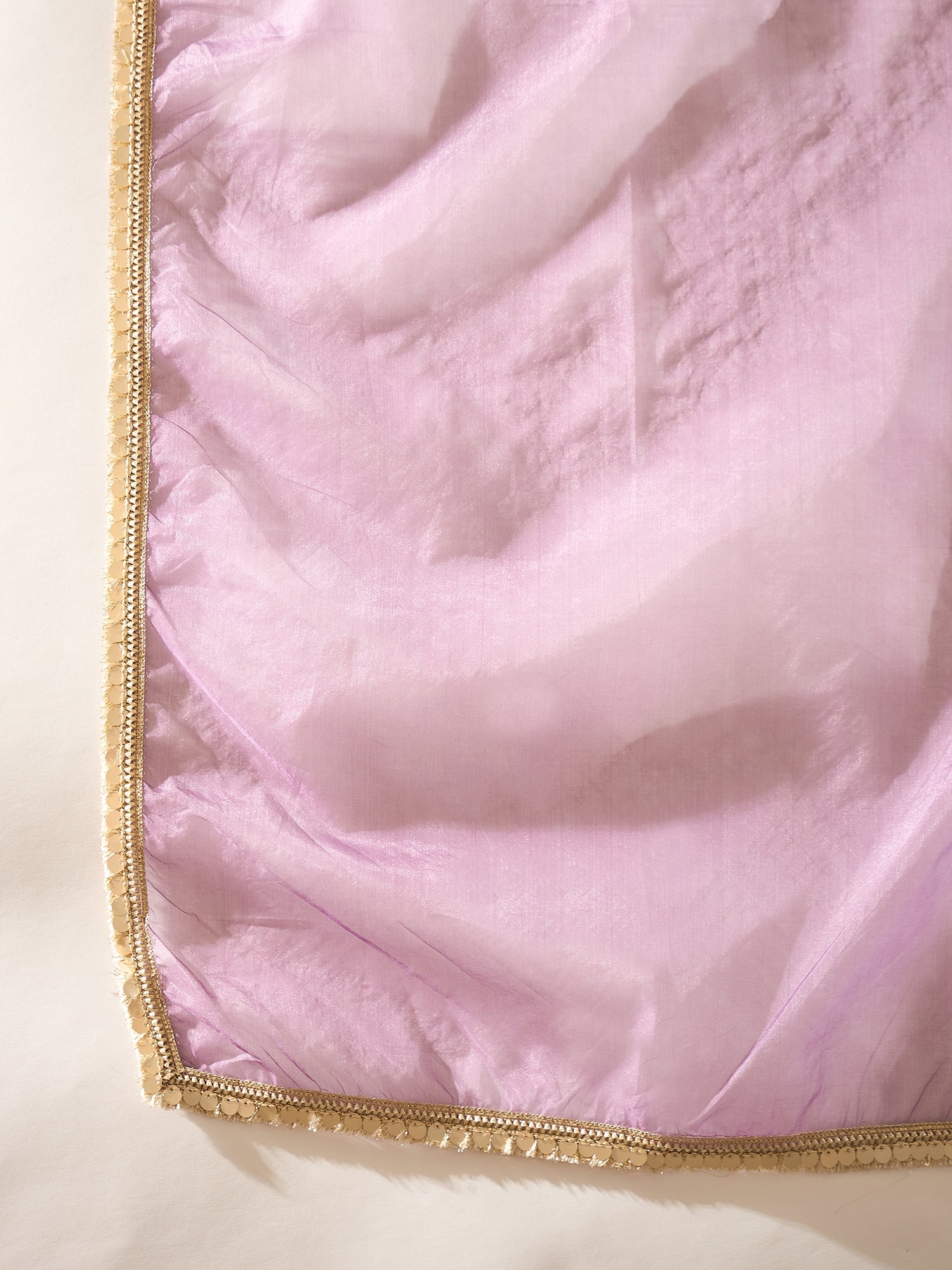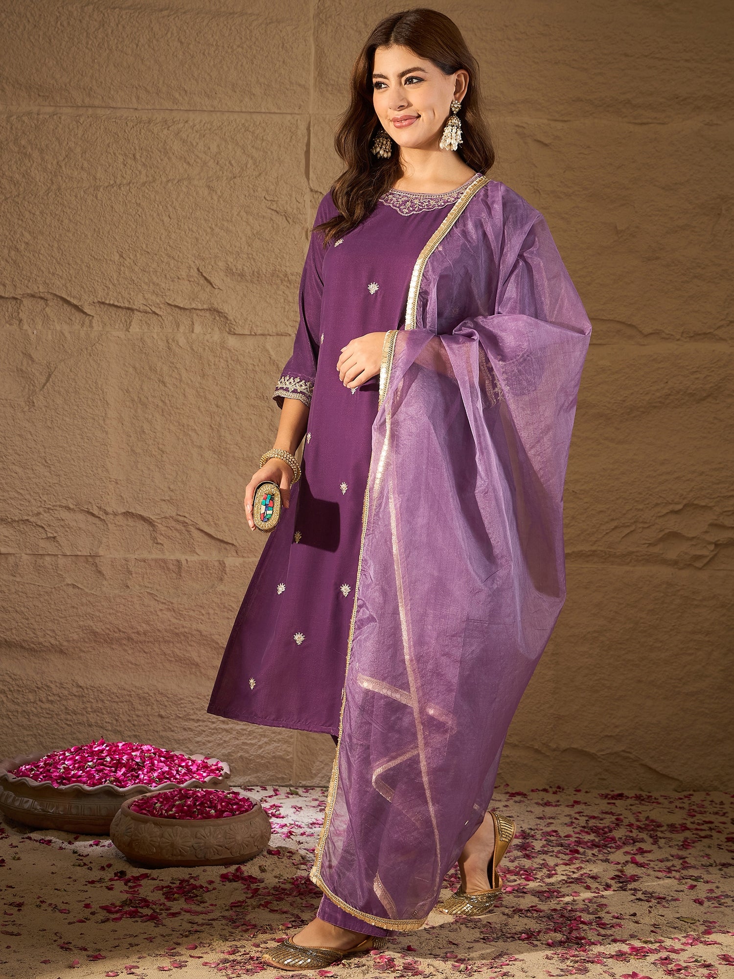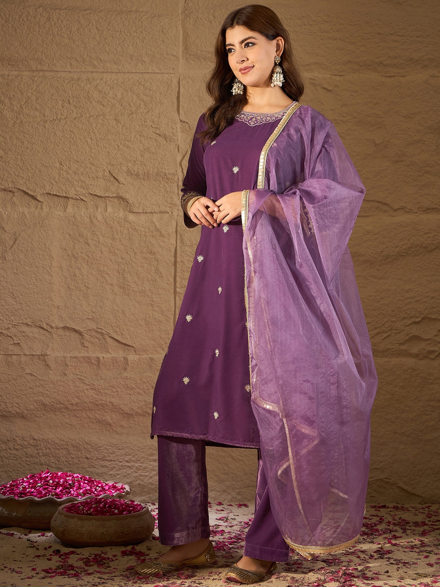 This beautiful purple suit set exudes understated festive charm. Crafted in velvet, the kurta has a soft glow and features delicately placed golden embroidered motifs. The neckline is highlighted with scalloped zari work, giving it a graceful and feminine appeal. Coordinated straight-cut velvet pants complement the look perfectly. The set is completed with a sheer organza dupatta in a matching shade with a shimmering gold border, adding lightness and fluidity to the rich velvet ensemble.
